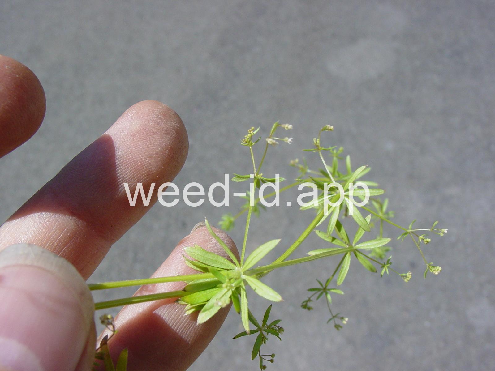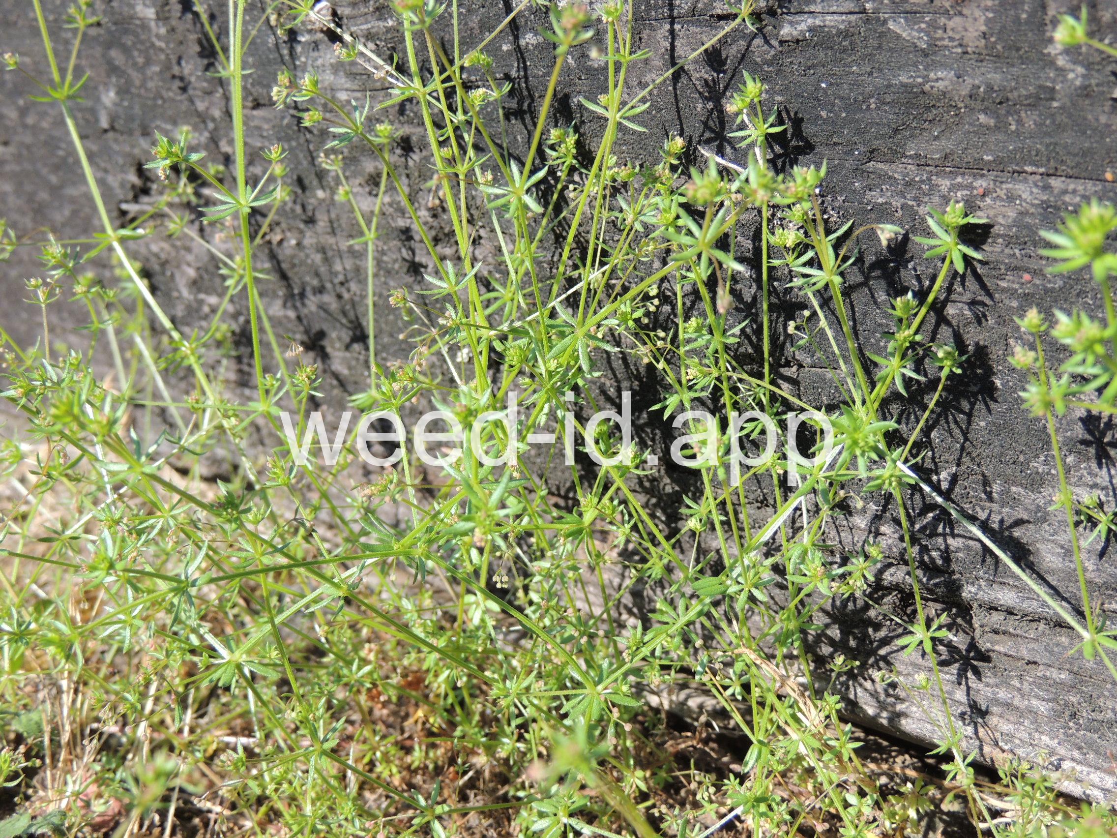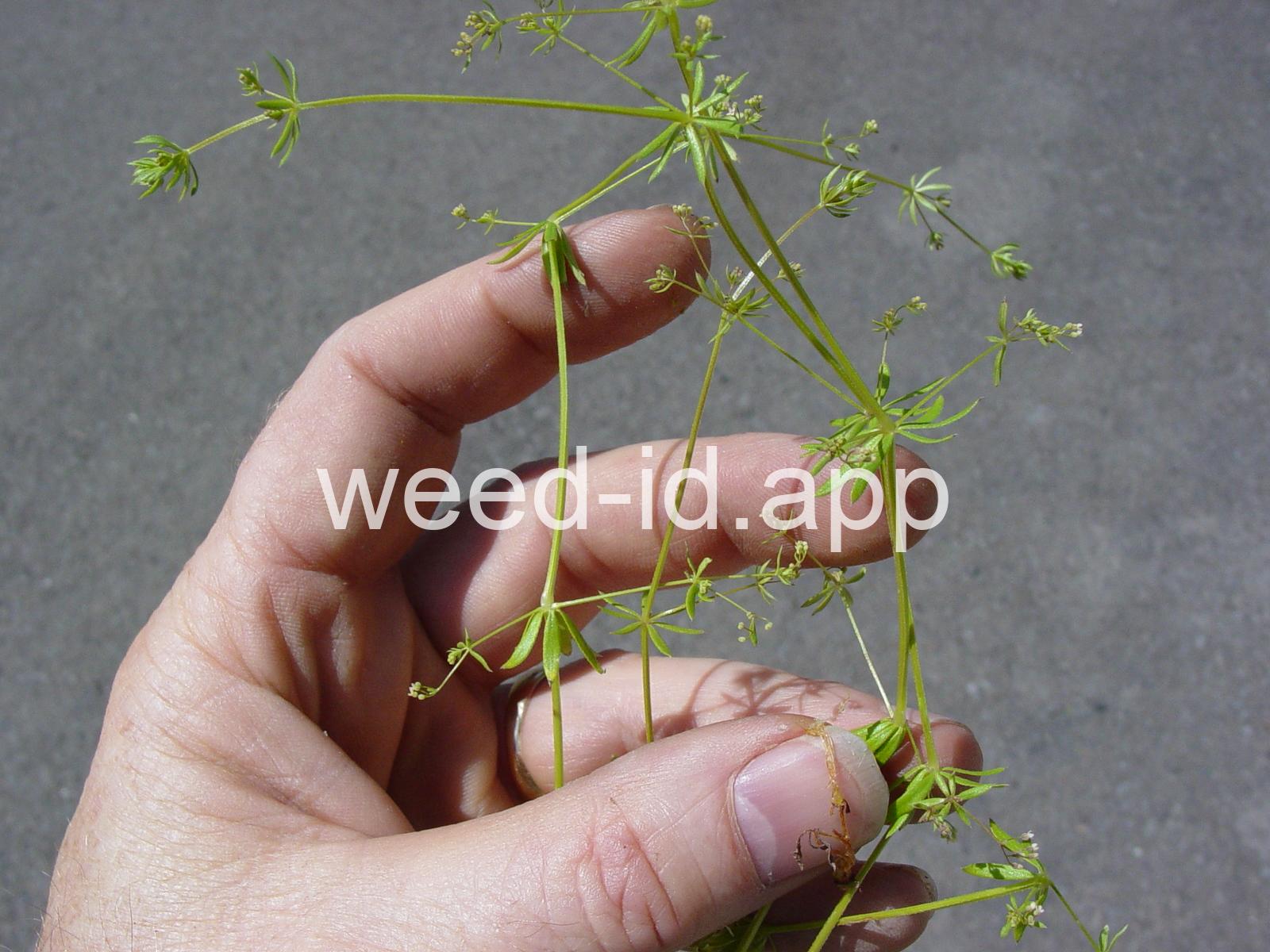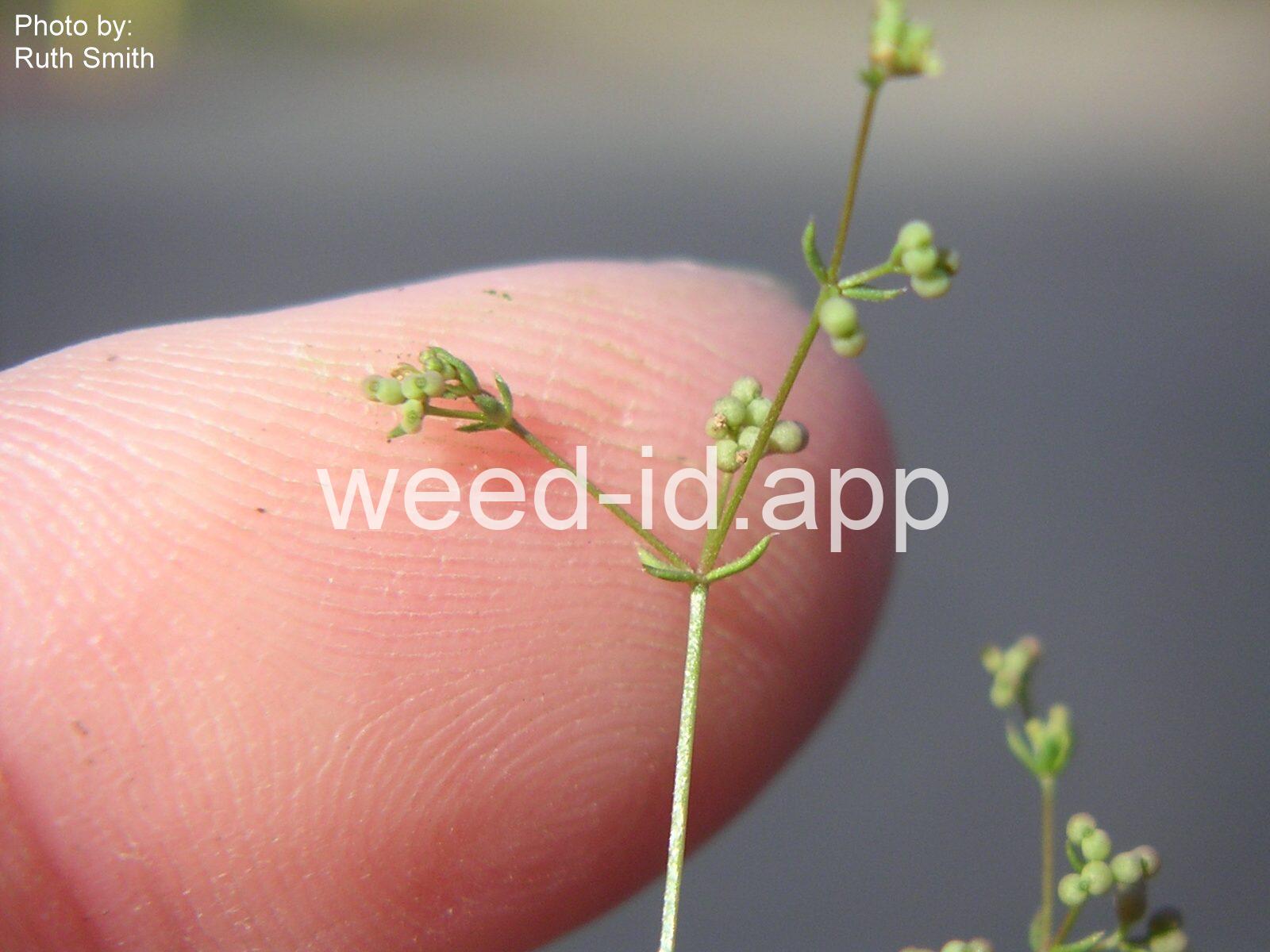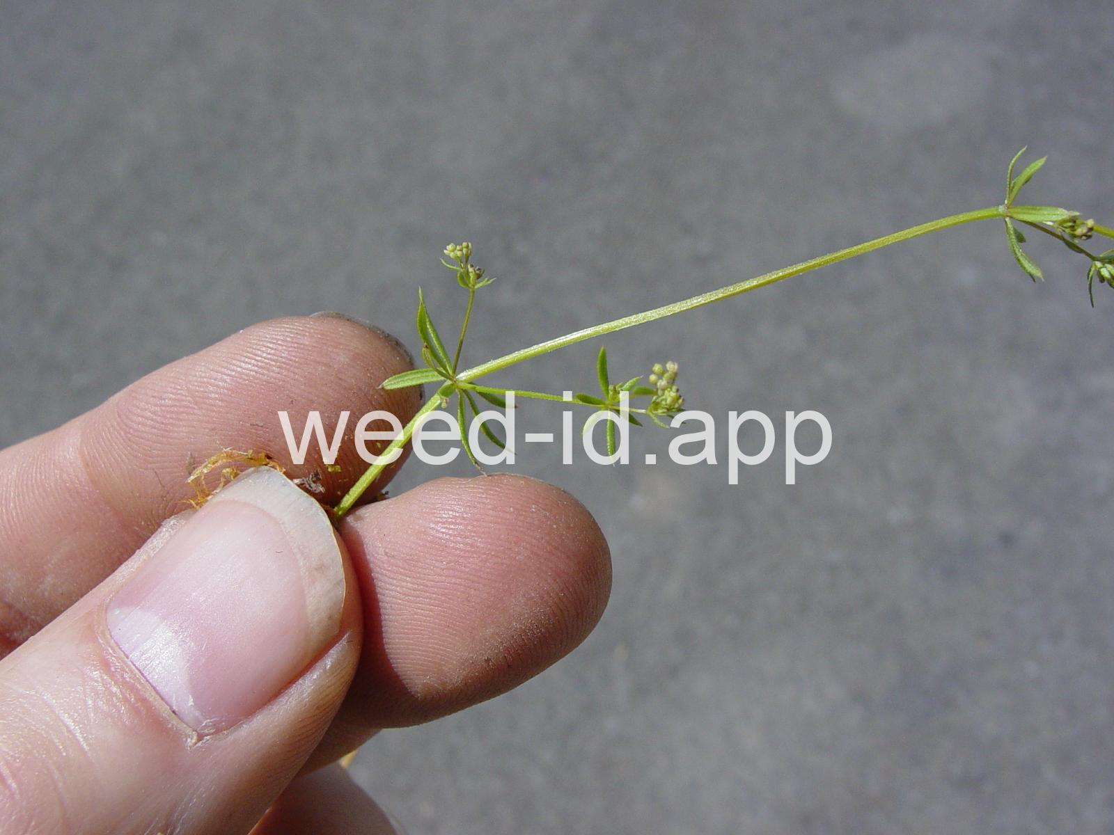 Very similar to Galium aparine (catchweed bedstraw) but more diminutive in most features. The flowers greenish and the fruits granular - roughened.