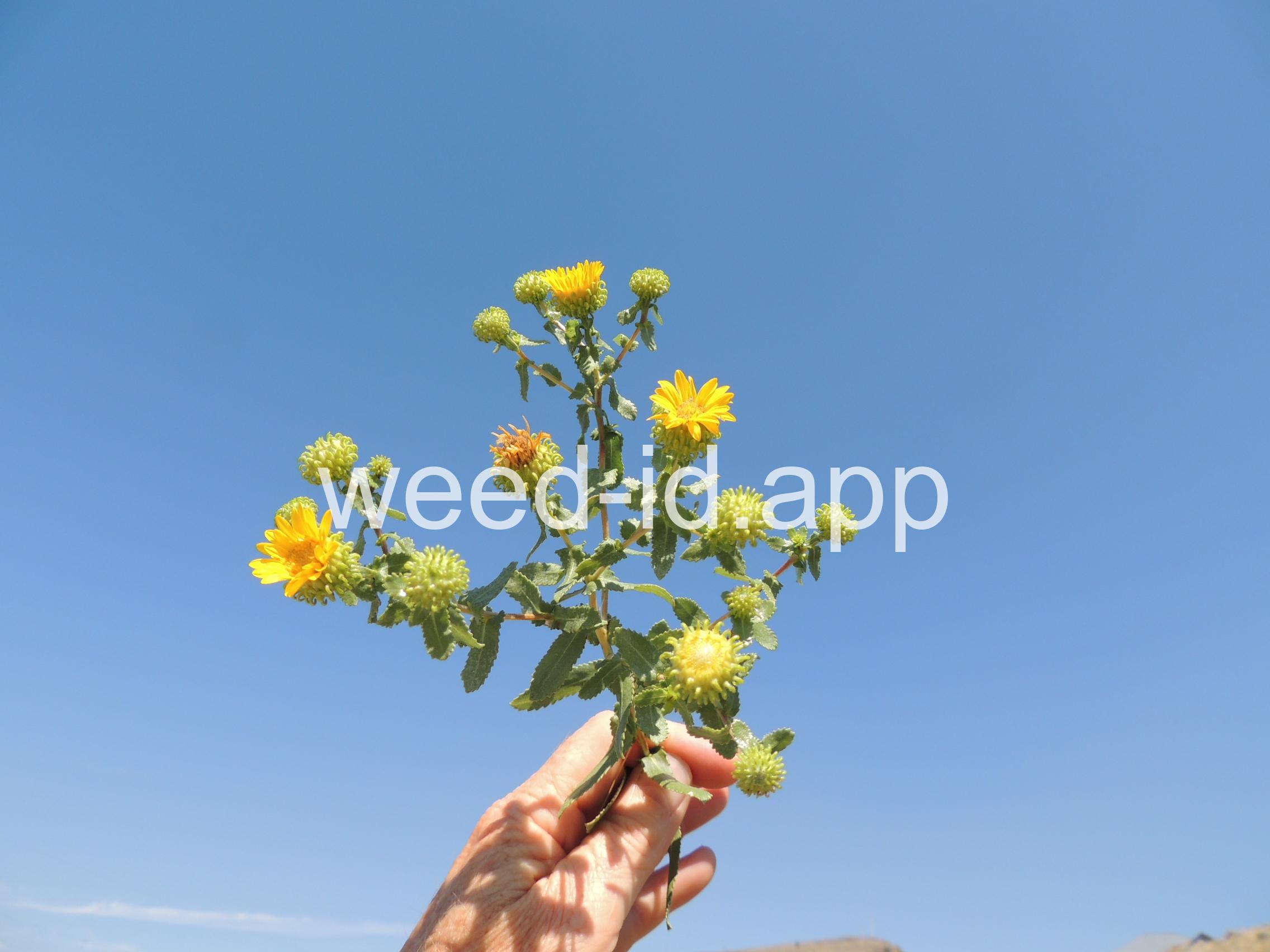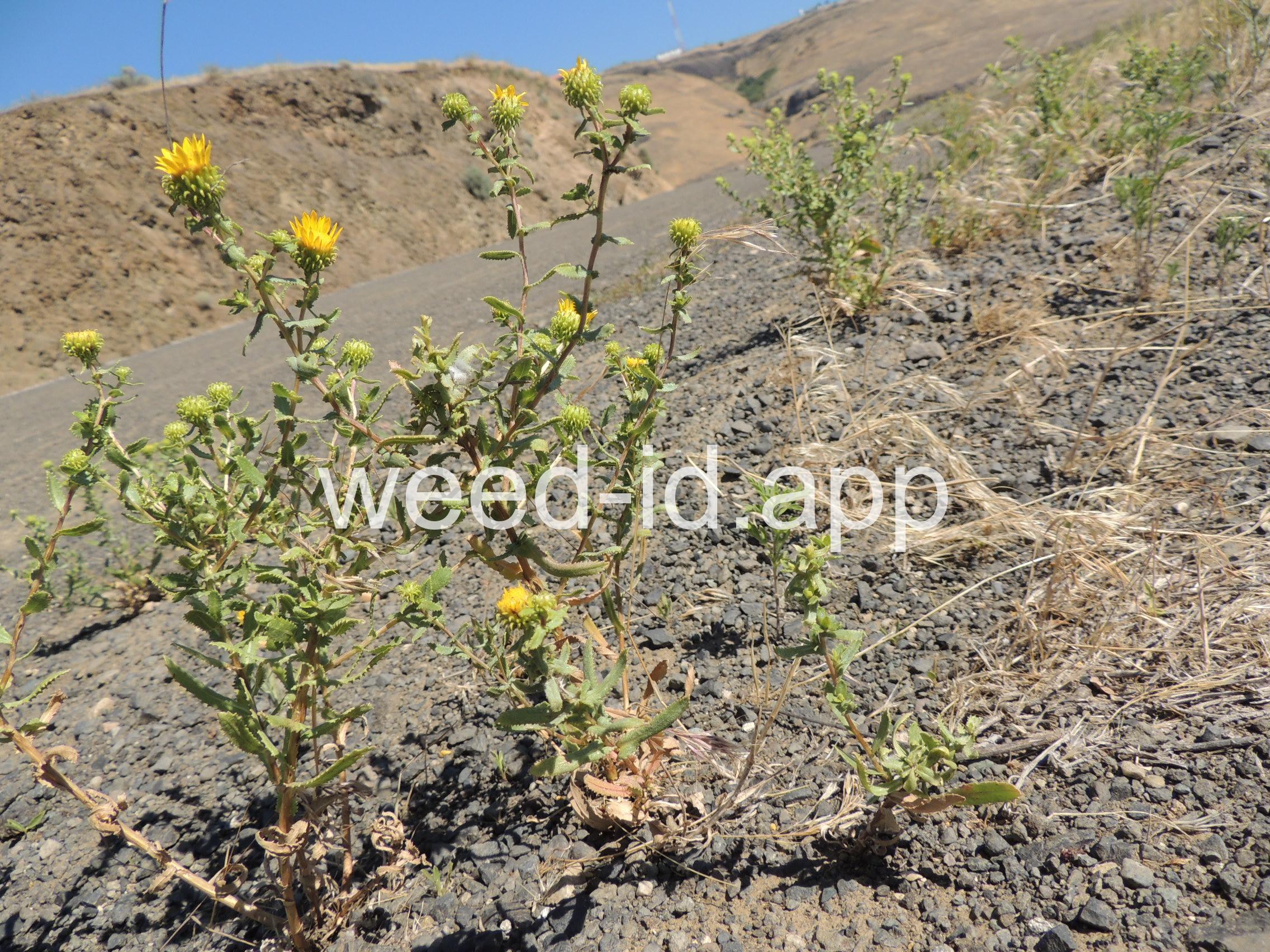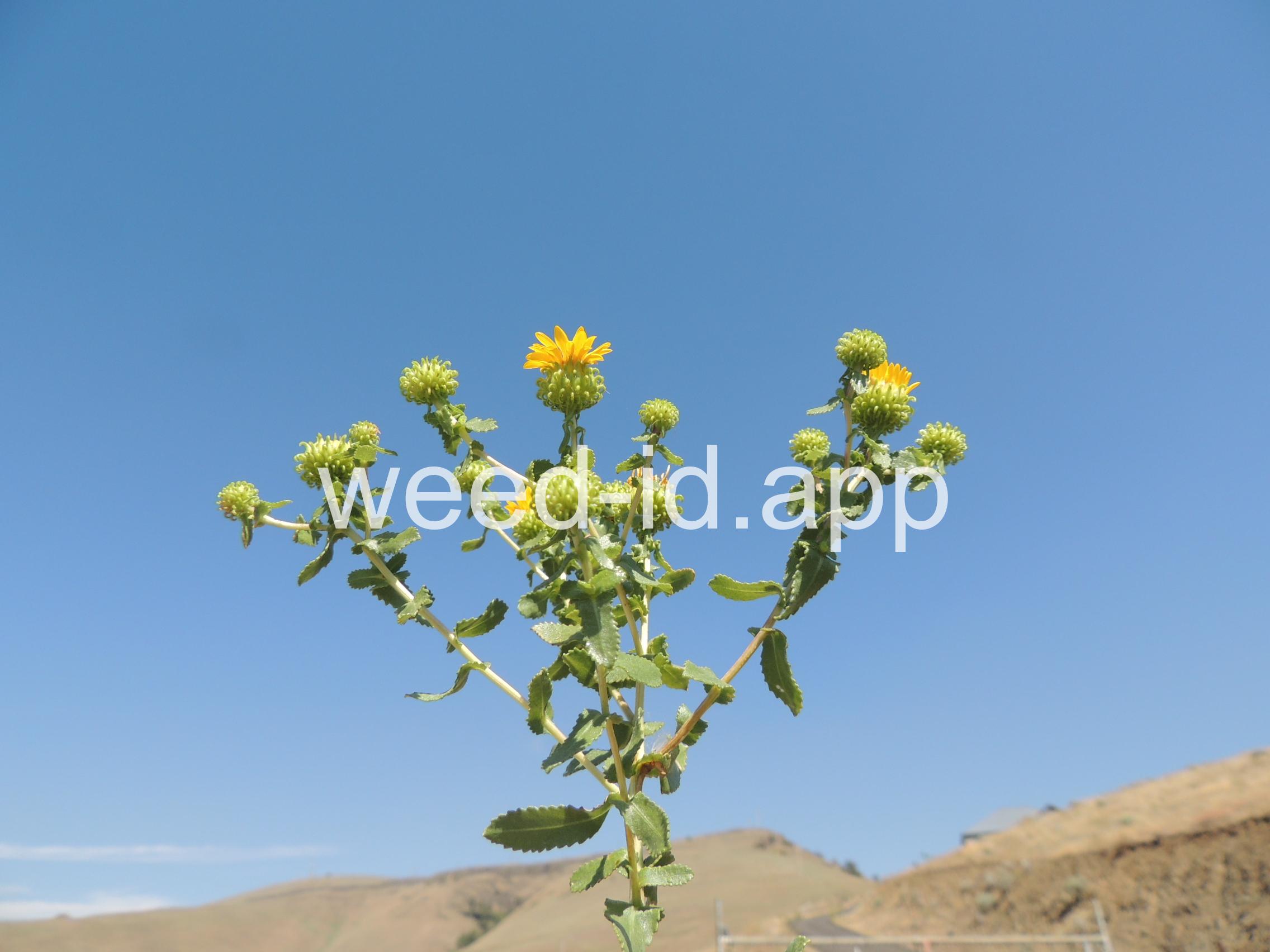 Both portions of the common name refer to the bracts beneath the yellow flower heads. The common name is `curlycup` because the bracts curl backwards around the cup-shaped base of the head, and `gumweed` due to the fact that they are covered with a sticky resin. The leaves are hairless and finely toothed.