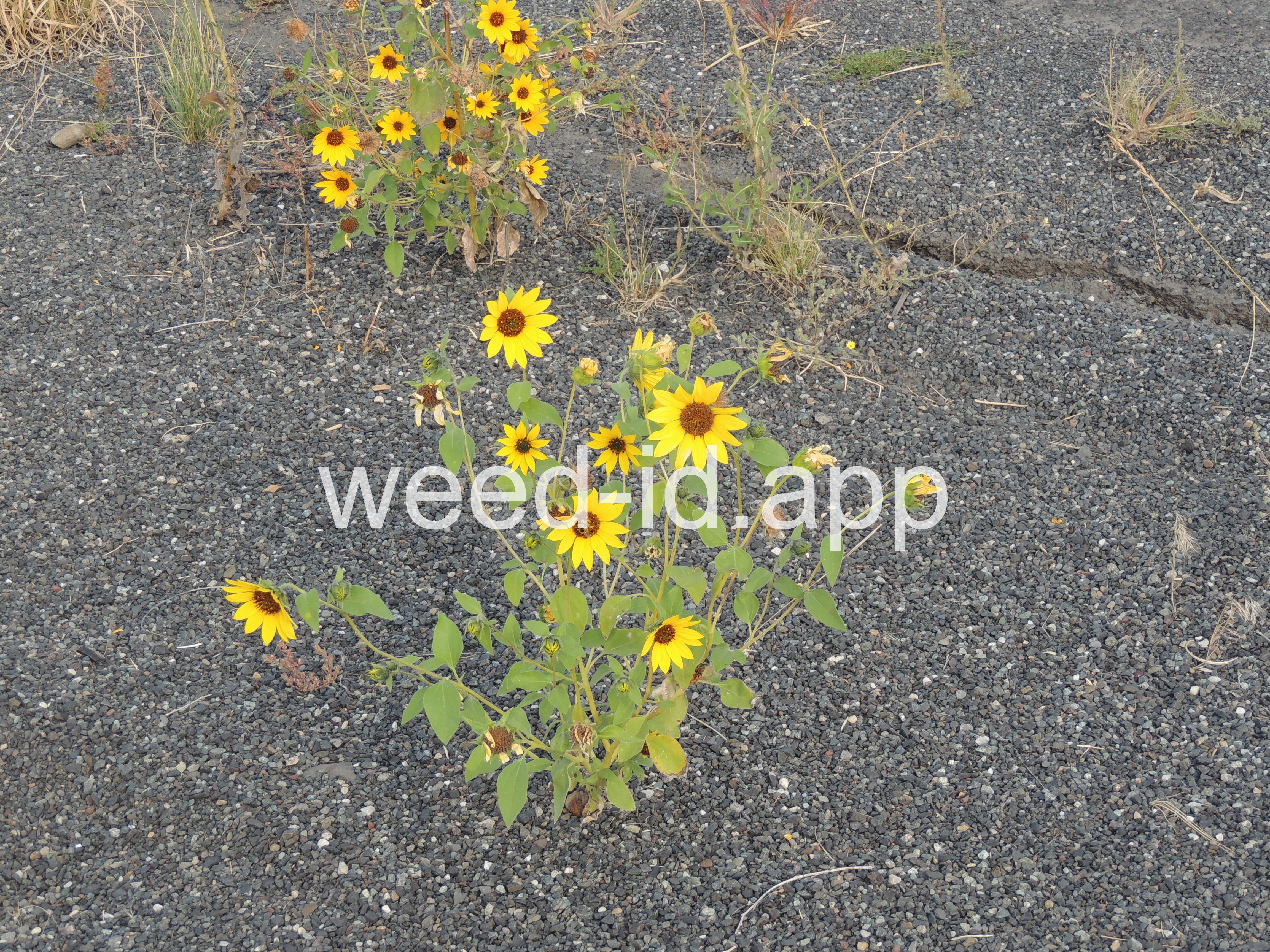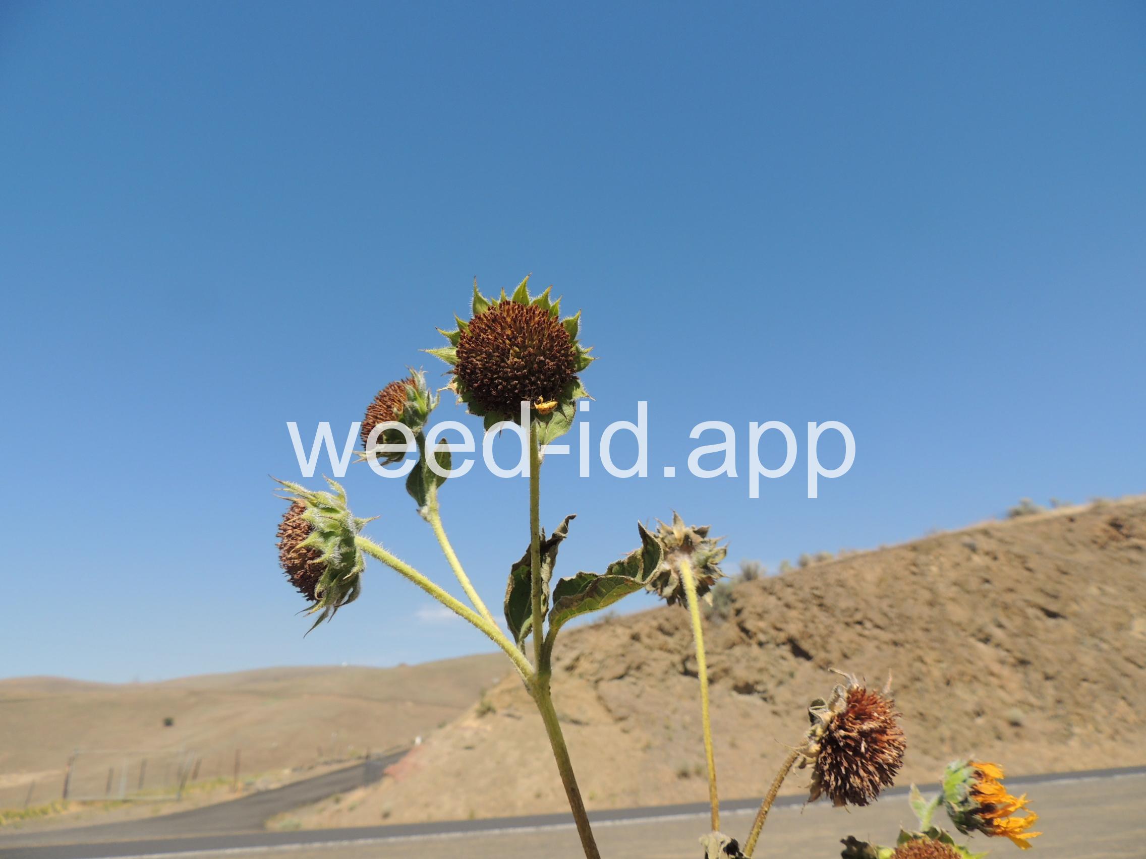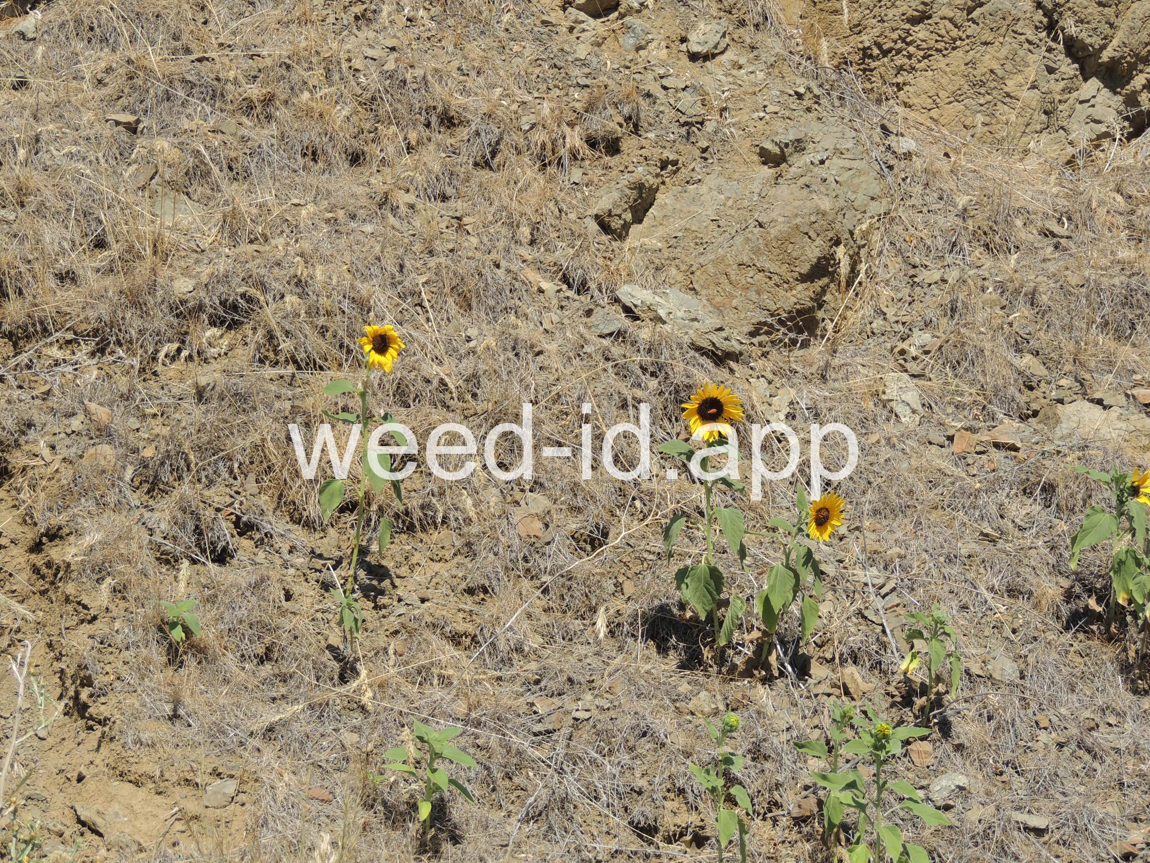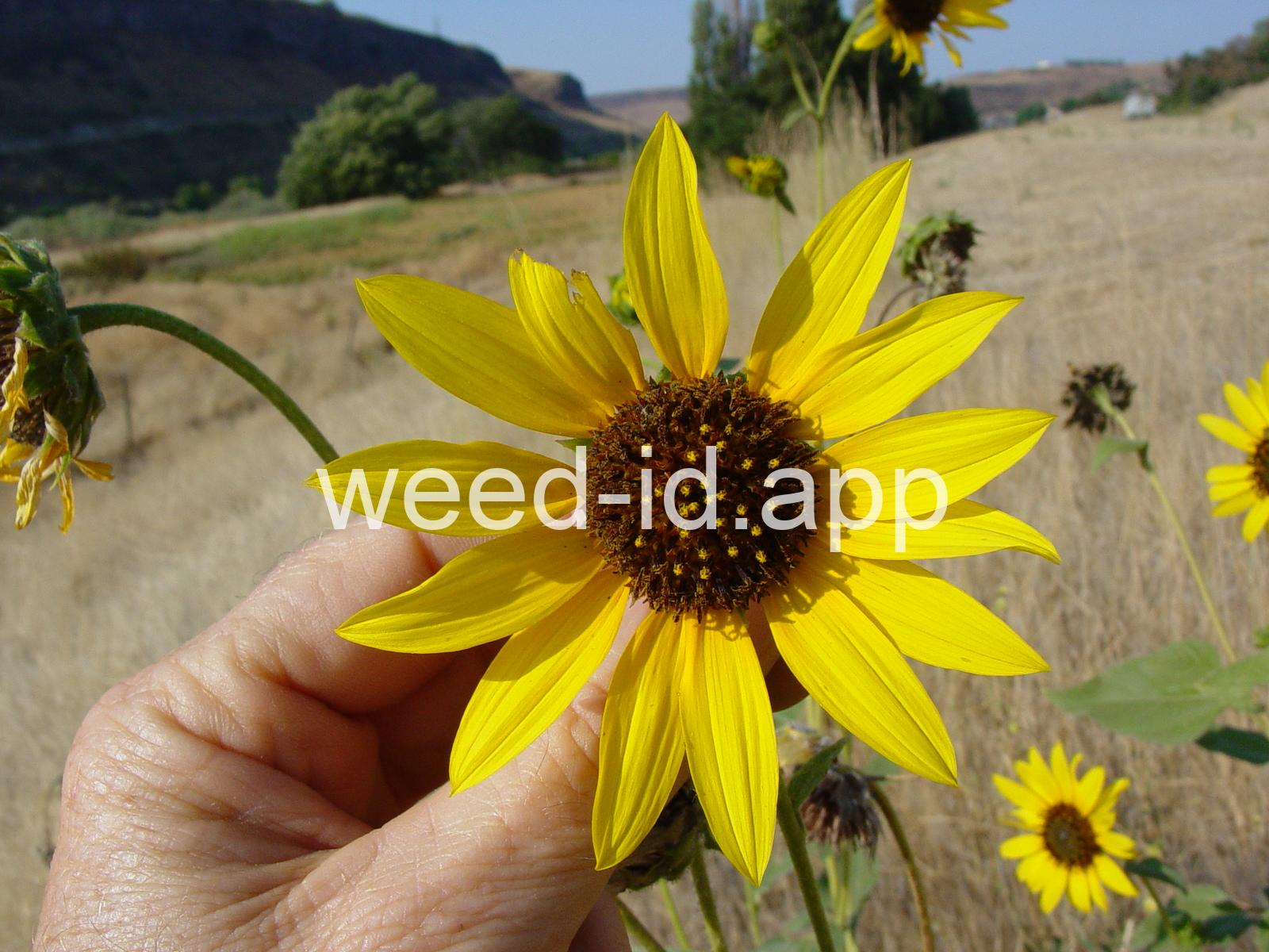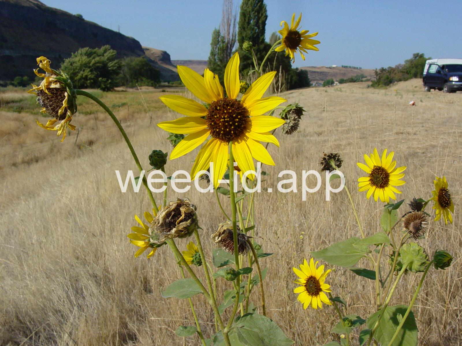 The wild ancestor of today`s cultivated sunflower. The lowest leaves are opposite but most above are alternate, and all are scabrous (rough and scratchy). The flowers are in large heads with yellow ray flowers and brownish disk flowers. This species is common in dry wasteland and natural areas, blooming from mid to late summer.