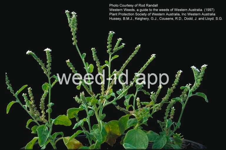 An escaped ornamental. Note the coiled clusters of white flowers and the grayish, fuzzy leaves with prominent veins.