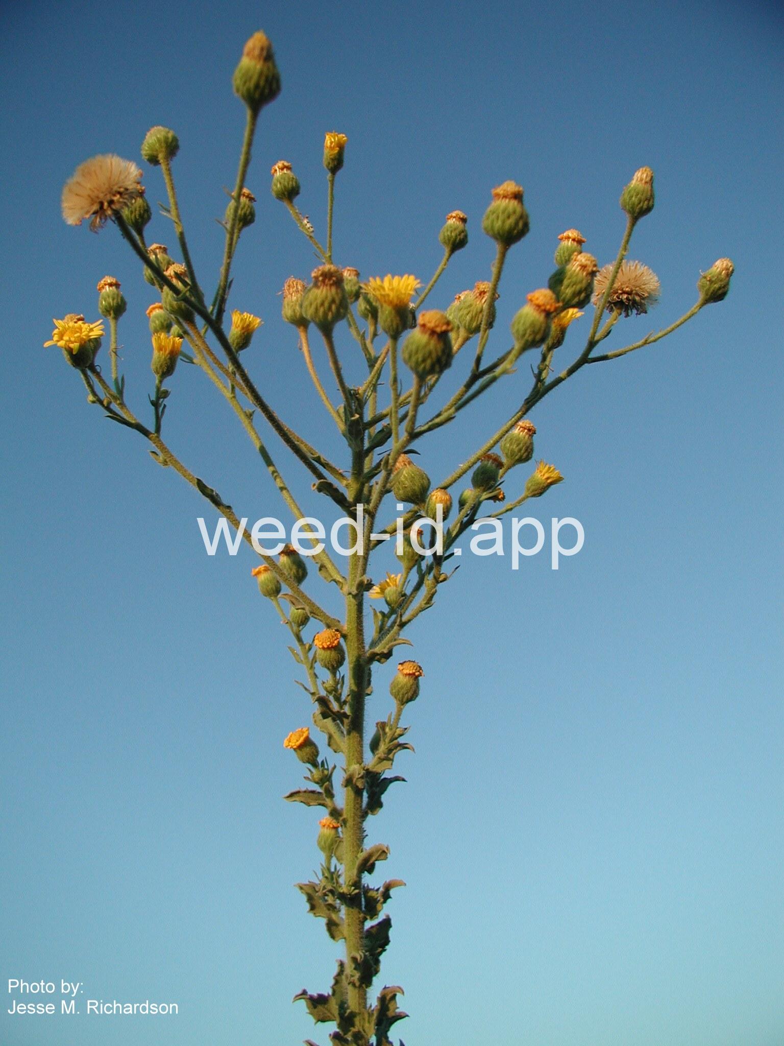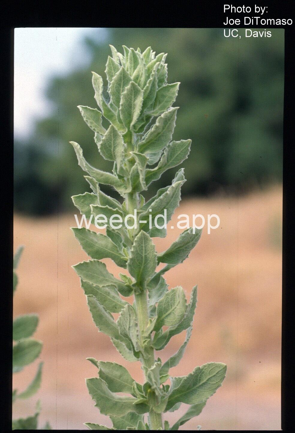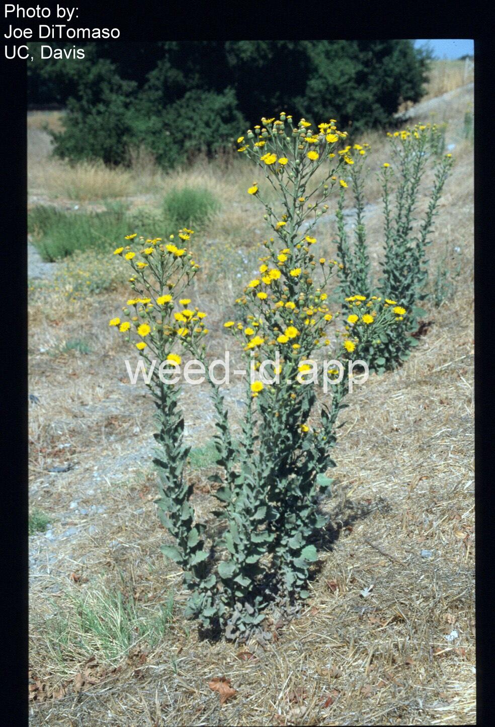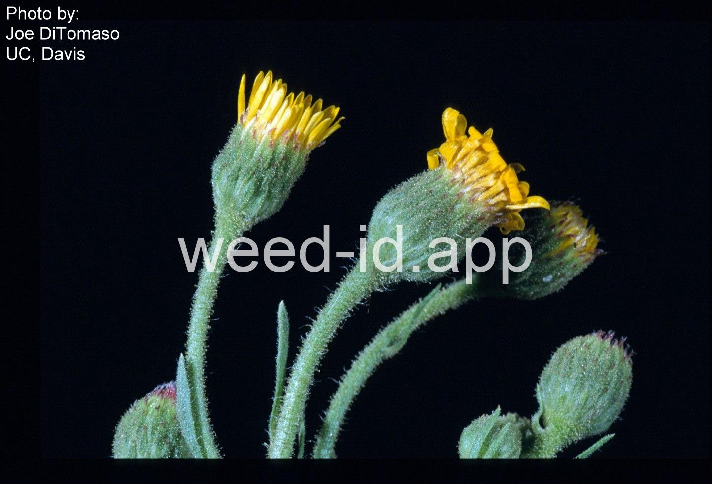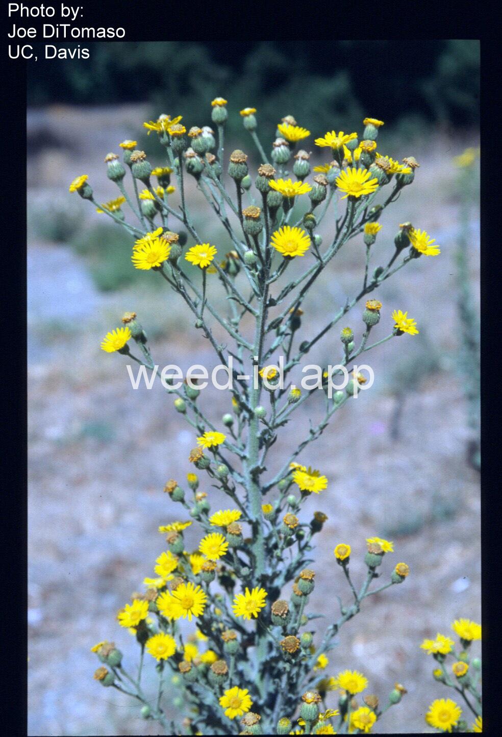 The mature plants are erect with a narrowly columnar growth form reminiscent of a telegraph pole; hence the common name. It is a taprooted annual or biennial with small heads containing yellow ray and disk flowers. The upper portion of the plant is covered with aromatic glandular hairs.