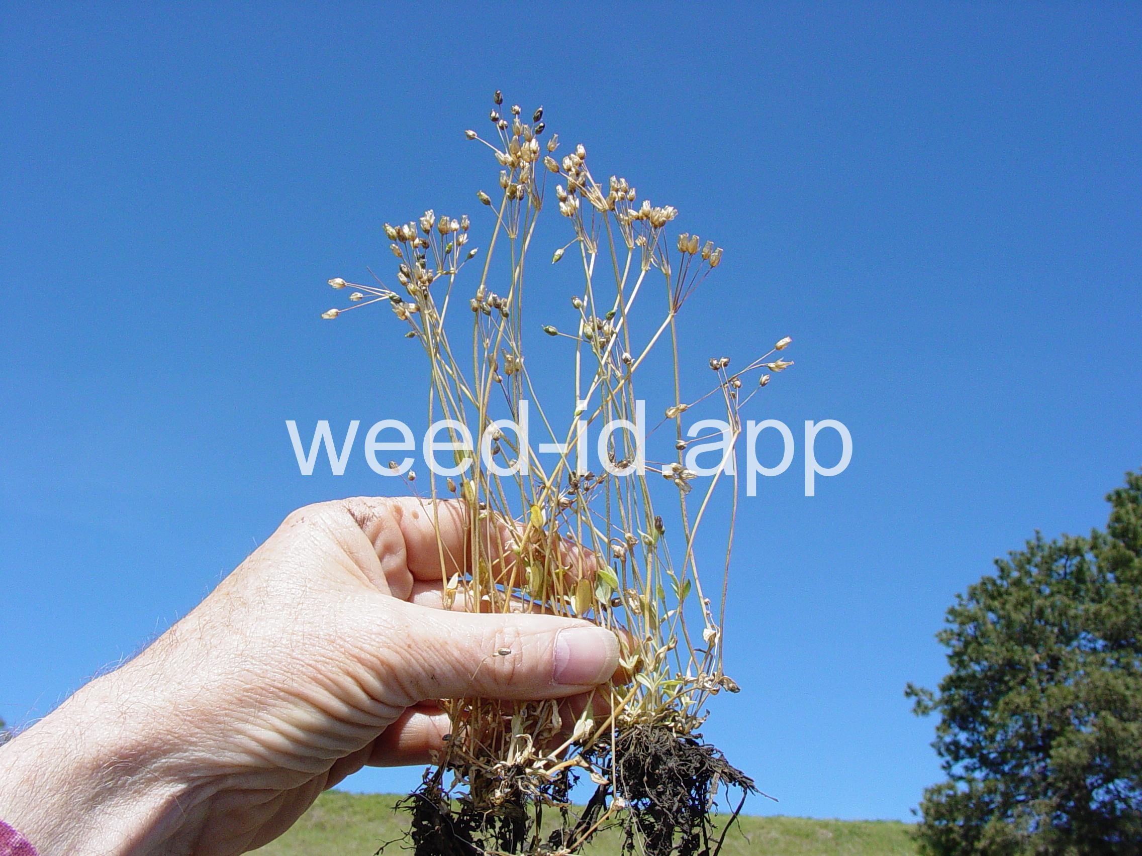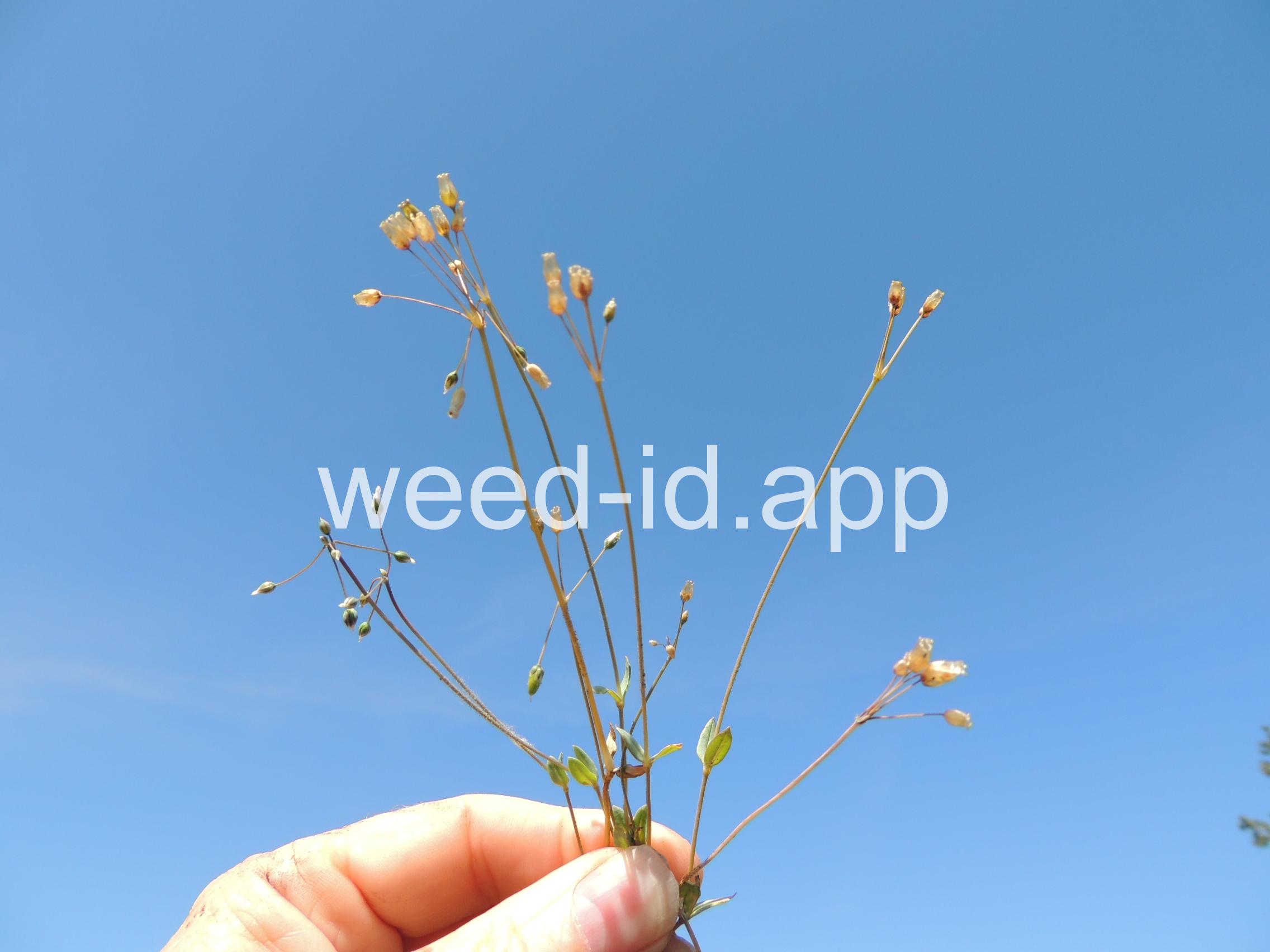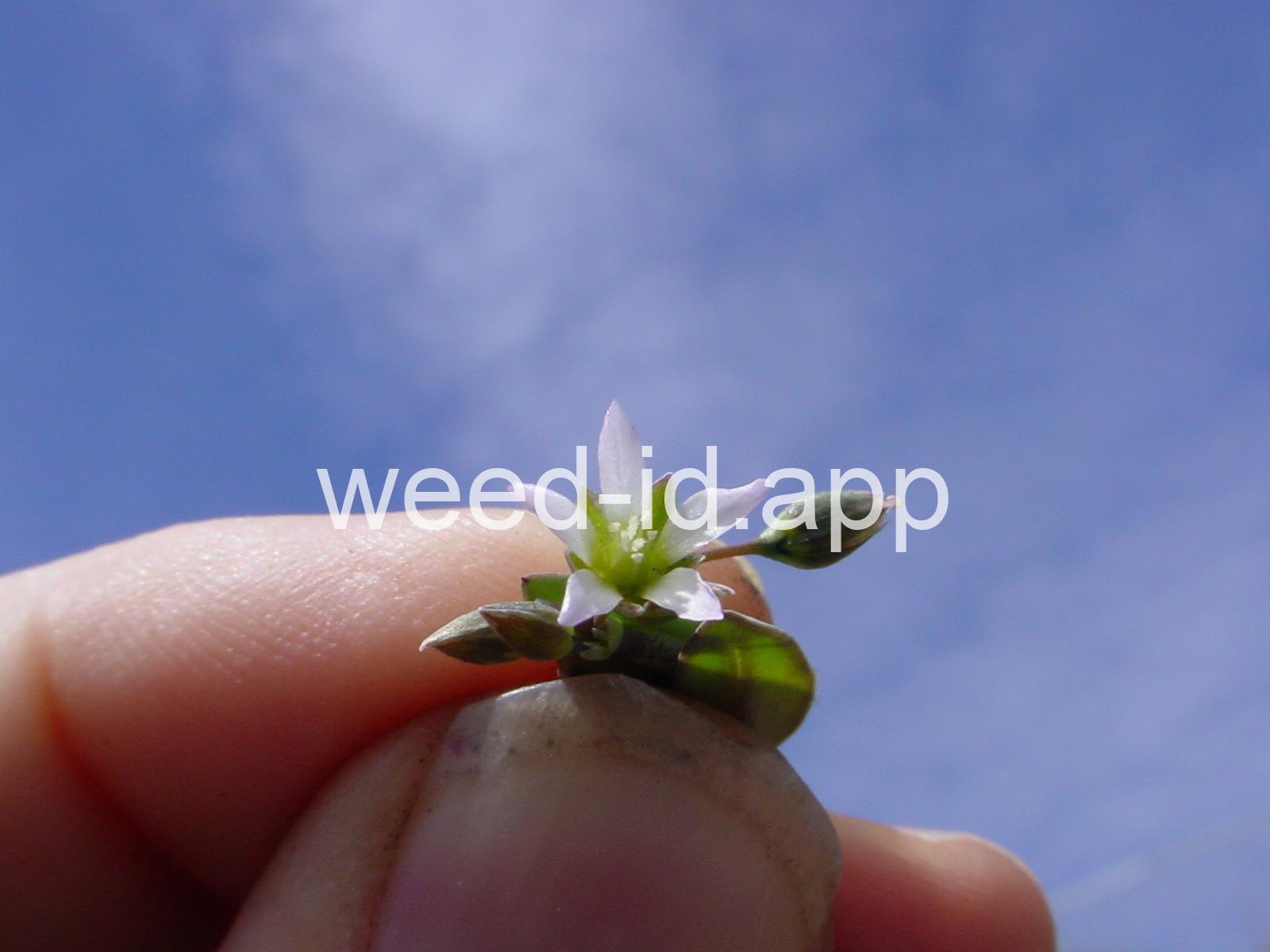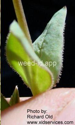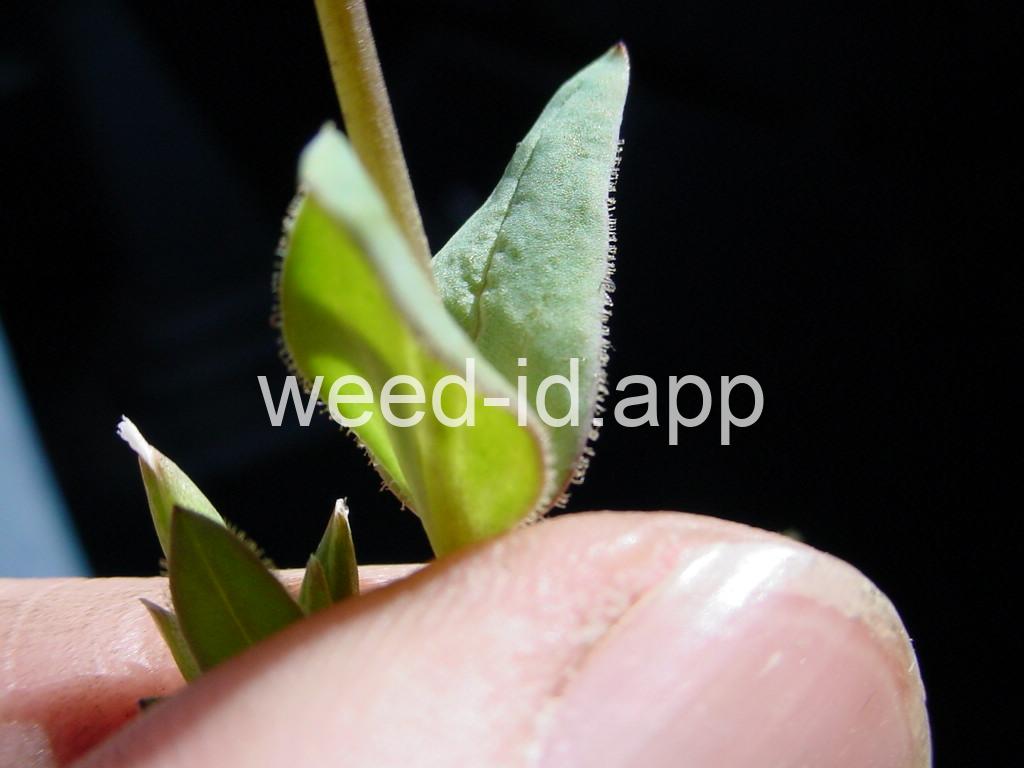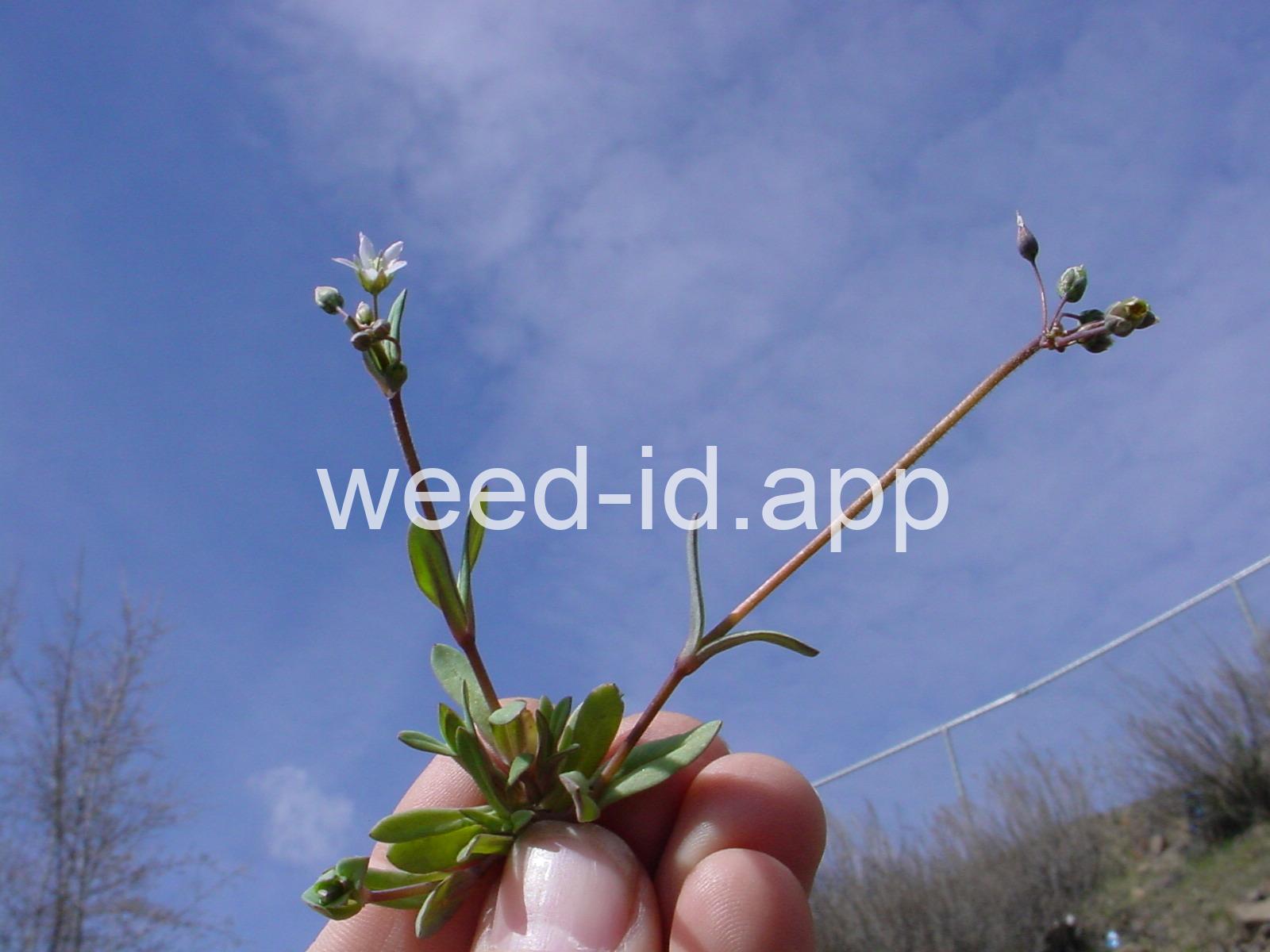Also known as `jagged chickweed.` The opposite leaves and simple umbel inflorescence make this a very distinctive annual. The leaves are hairless except for their ciliate margins. It is often one of the first species to flower in the spring.