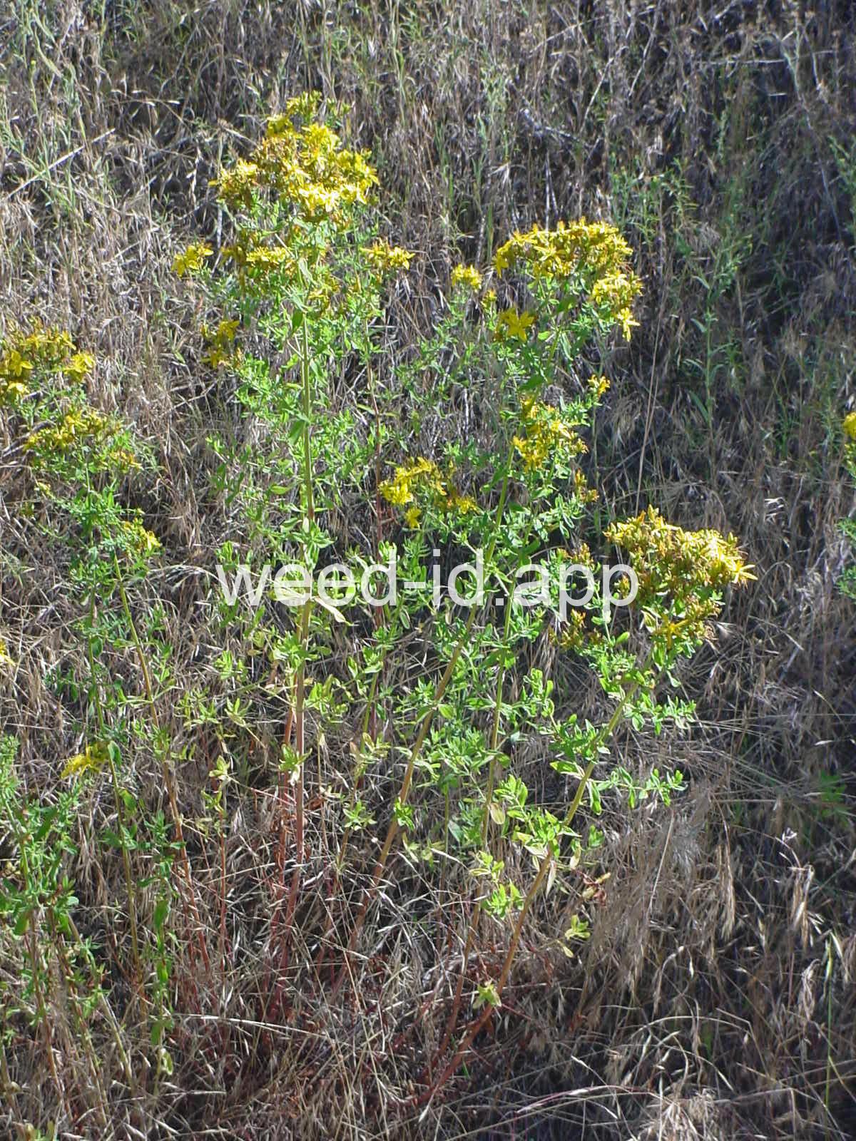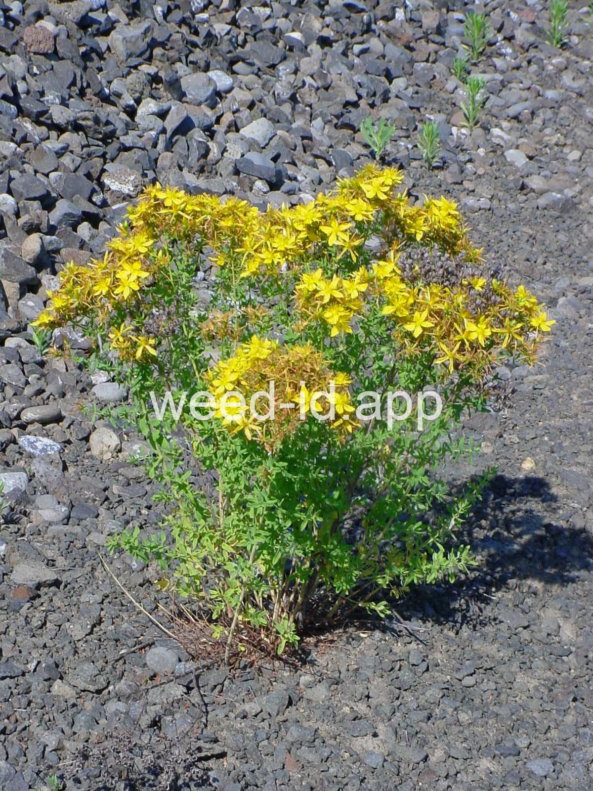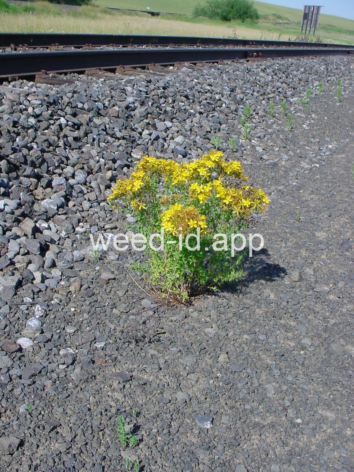 This perennial produces a toxin which, when consumed, causes white-skinned animals to develop massive skin lesions when exposed to the sun. The leaves are small, hairless, and opposite. When held up to the light, one can see numerous `perforations` which are actually clear, window-like glands that produce the toxin. Three biocontrol agents have been released on this species; the most noticeable is an iridescent black beetle which feeds on the leaves. Also called goatweed and Klamathweed.