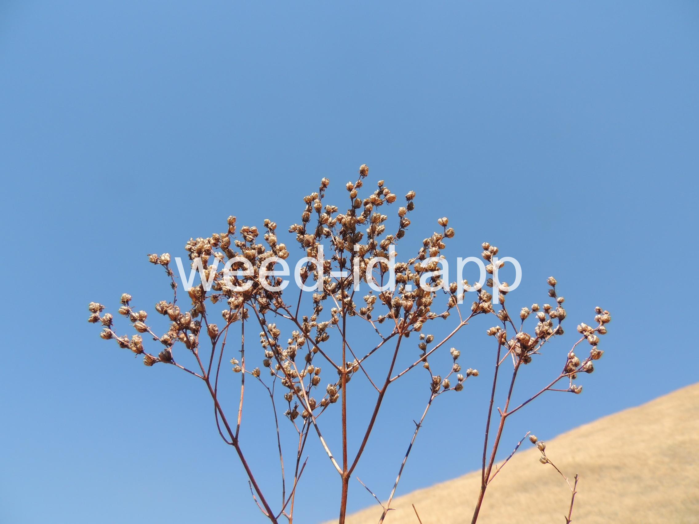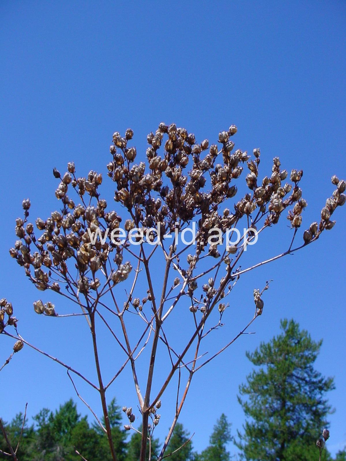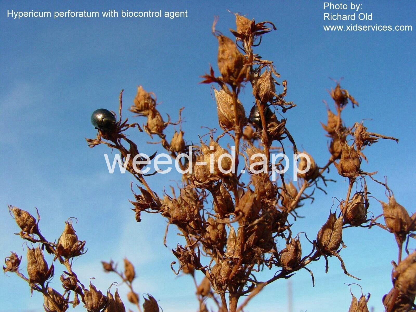 This perennial produces a toxin which, when consumed, causes white-skinned animals to develop massive skin lesions when exposed to the sun. The leaves are small, hairless, and opposite. When held up to the light, one can see numerous `perforations` which are actually clear, window-like glands that produce the toxin. Three biocontrol agents have been released on this species; the most noticeable is an iridescent black beetle which feeds on the leaves. Also called goatweed and Klamathweed.