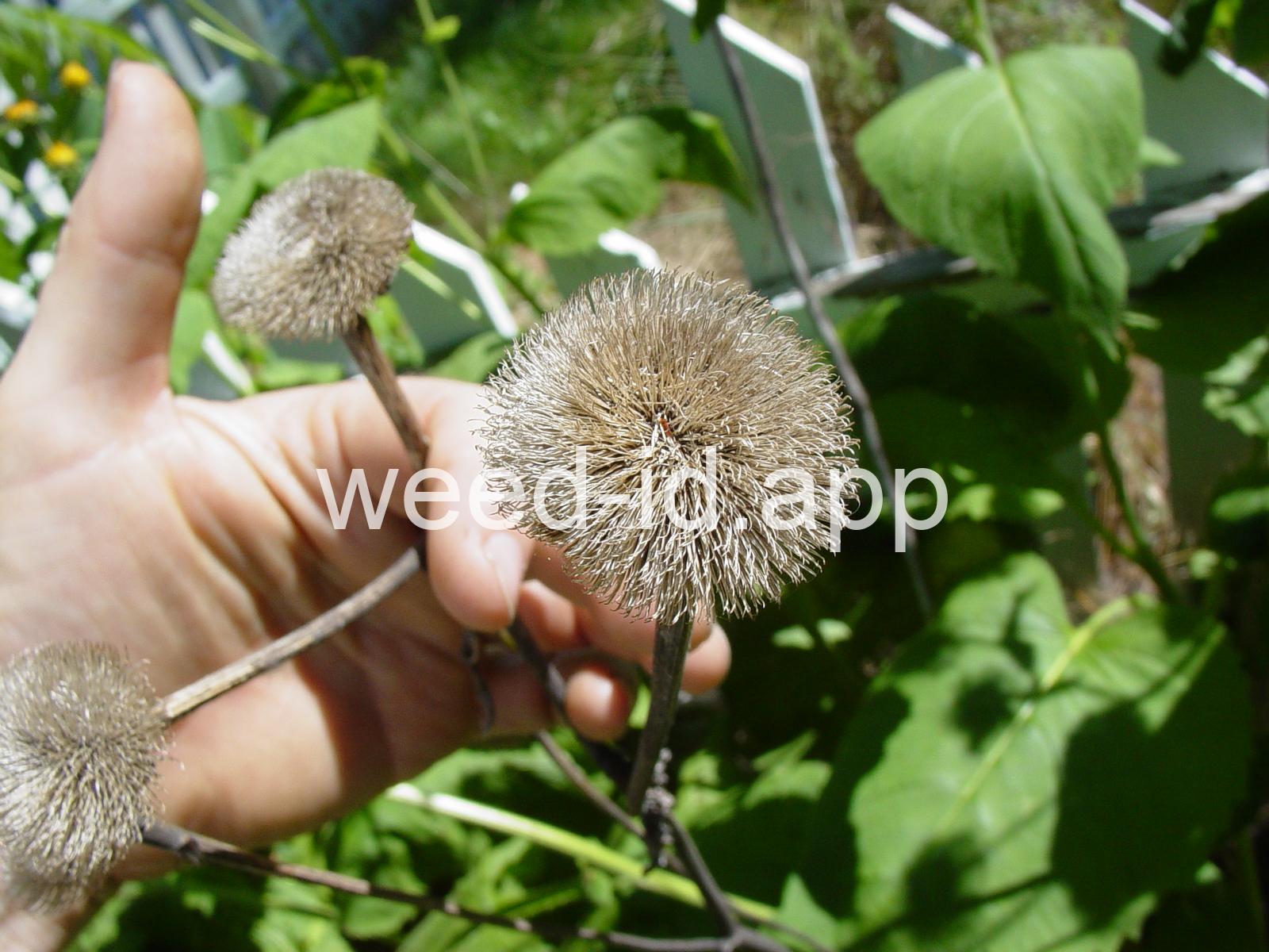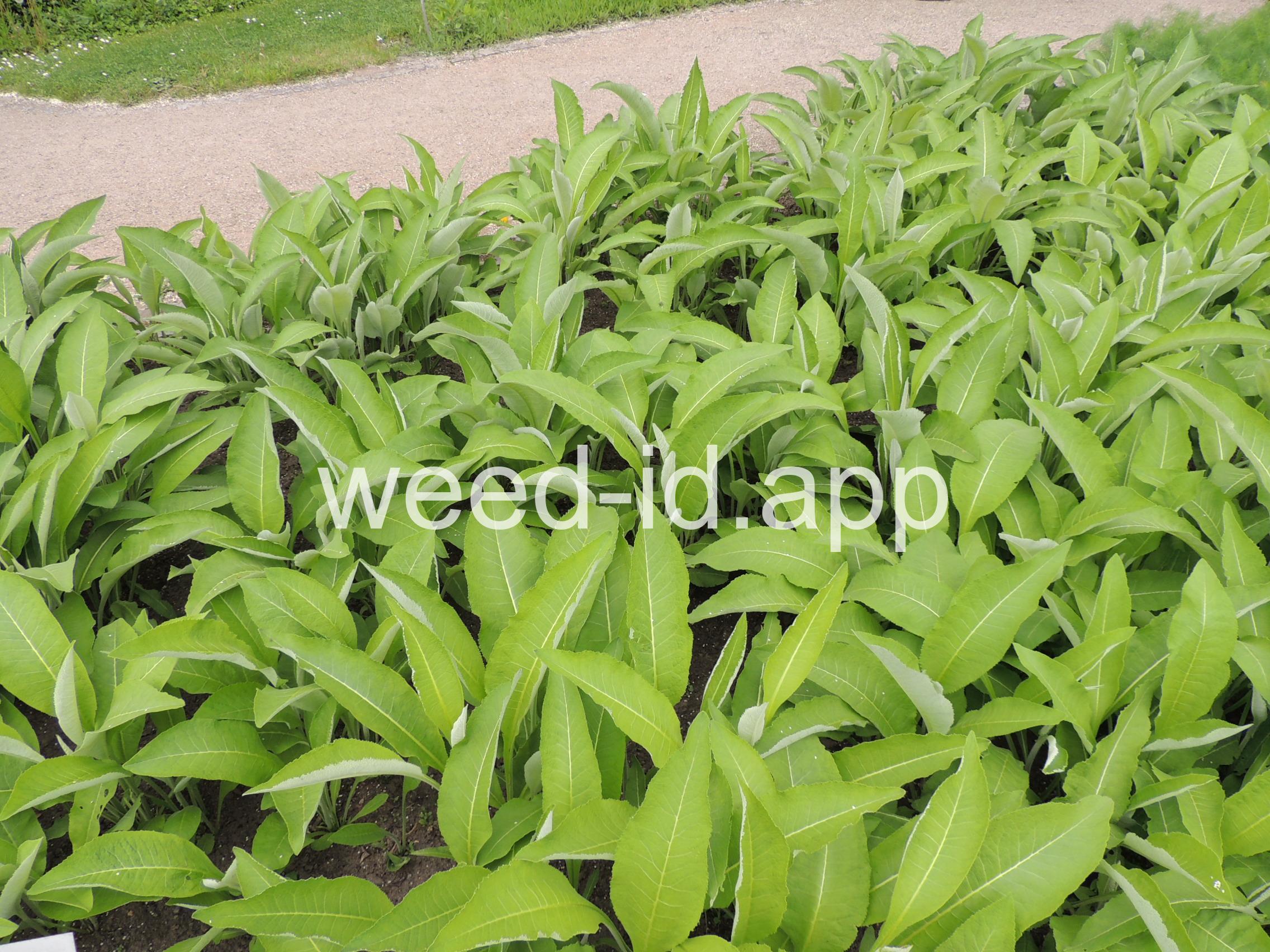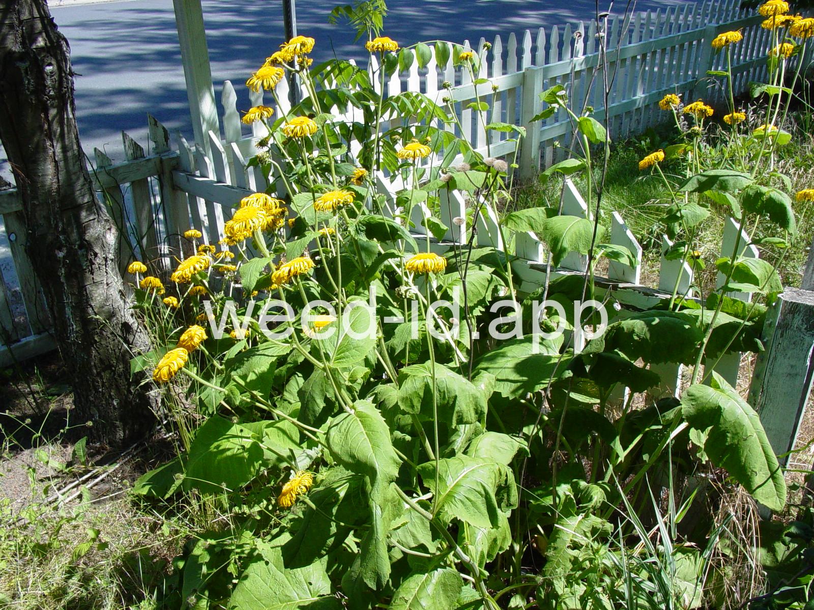 Plants large in many respects: up to six feet tall, heads two inches across and the leaves up to two feet long and eight inches wide. The leaves are strongly and regularly toothed on the margin and densely velvety hairy on the underside. The root is a large fleshy taproot.