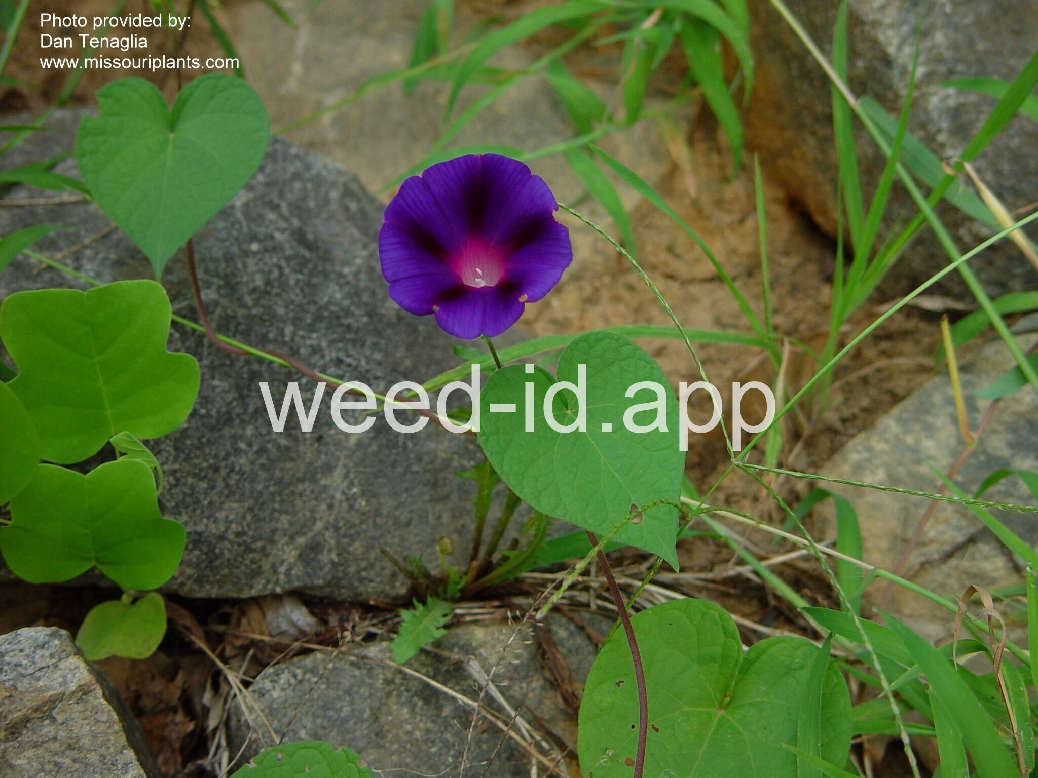 A twining annual vine with tubular, purple and white flowers. The leaves alternate and heart-shaped or 3-lobed.
