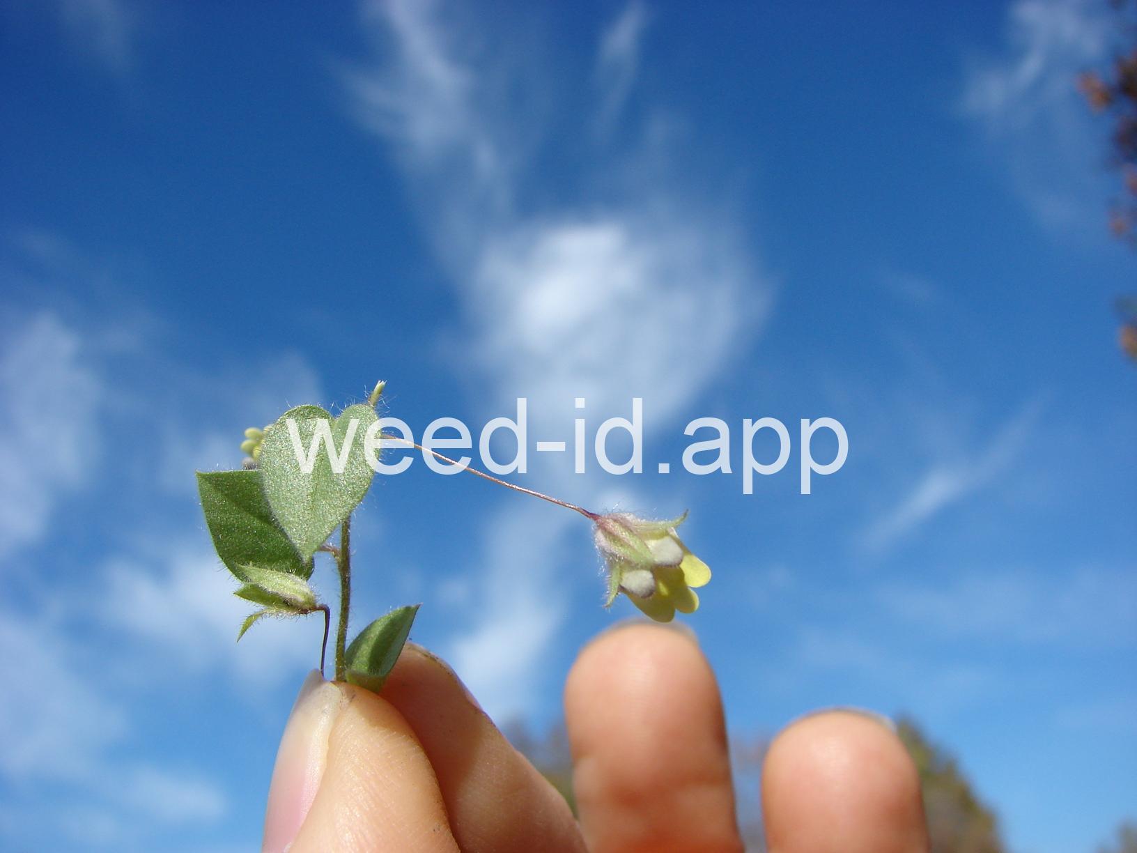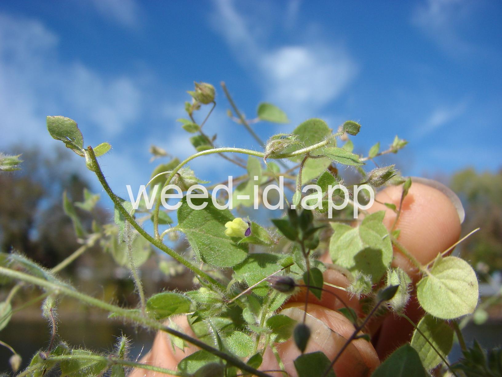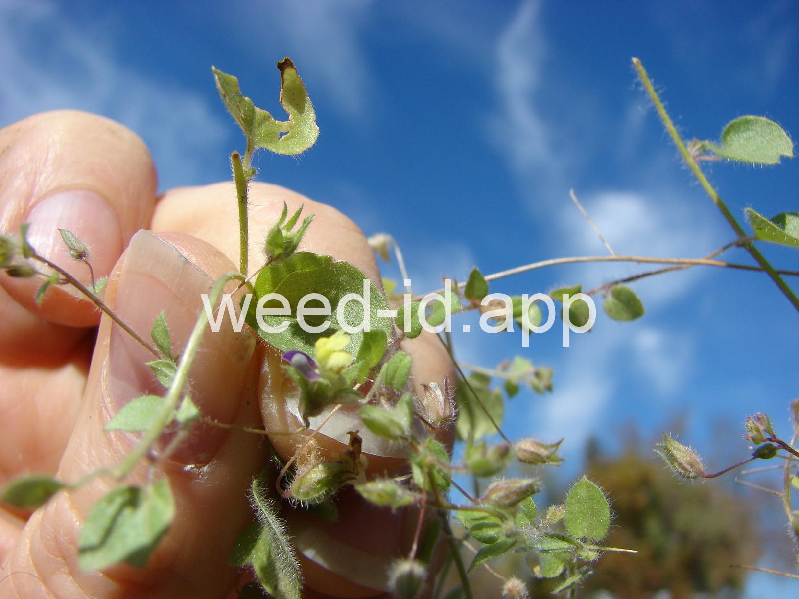 This prostrate perennial has oval leaves and strongly irregular yellow and purple flowers which are borne singly in the axils of the leaves. The leaf shape is the major feature which distinguishes it from sharppoint fluvellin (Kickxia elatine) which has spearhead-shaped leaves.