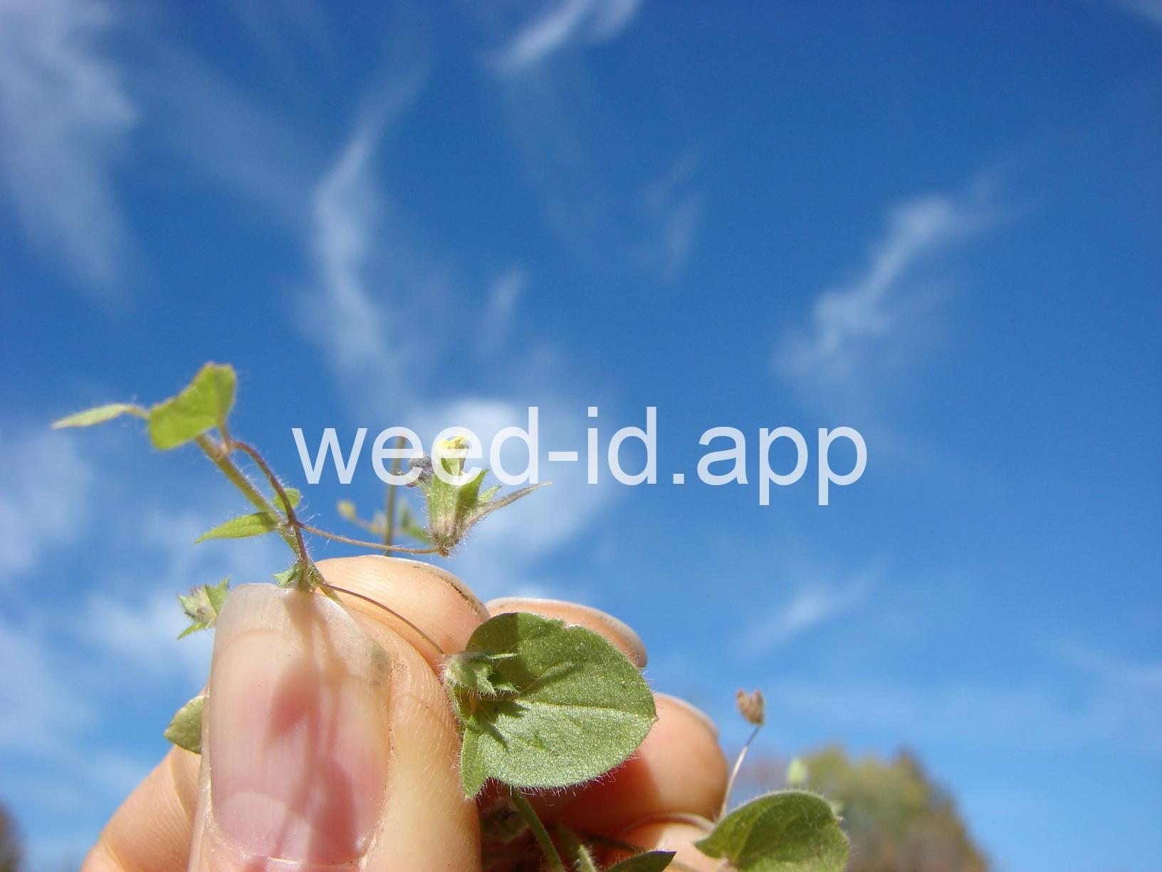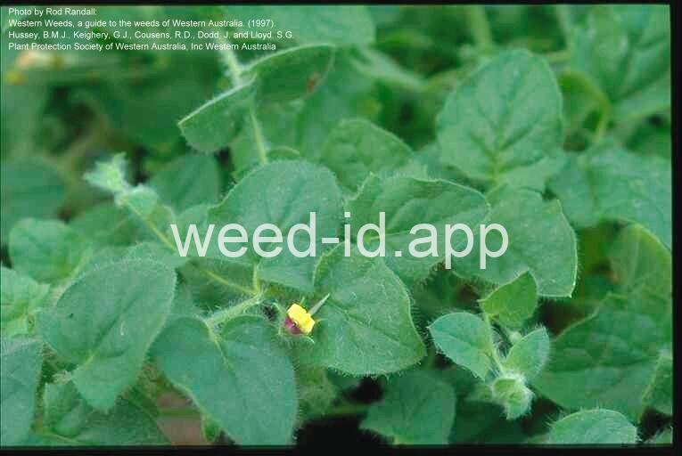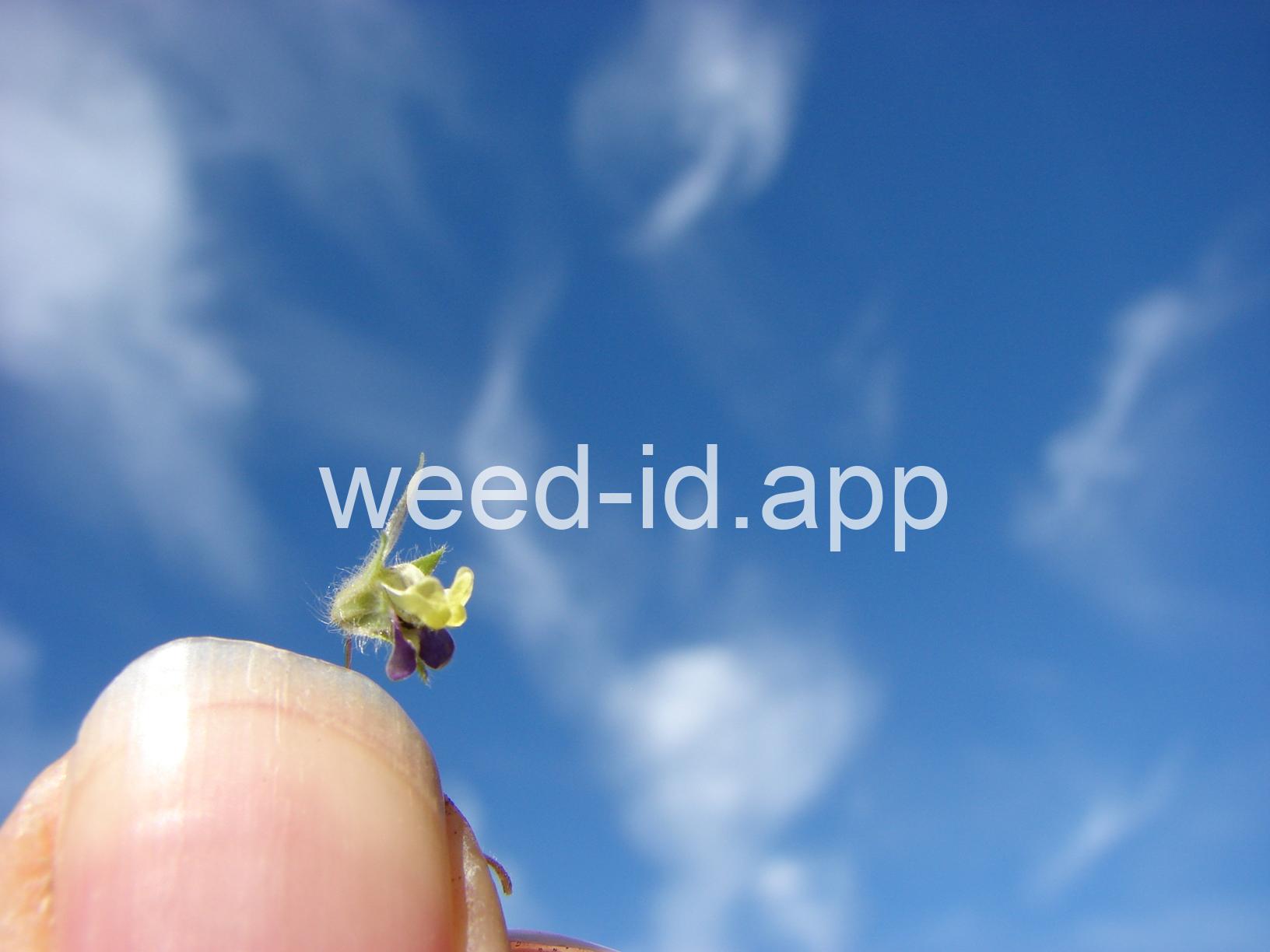 This prostrate perennial has oval leaves and strongly irregular yellow and purple flowers which are borne singly in the axils of the leaves. The leaf shape is the major feature which distinguishes it from sharppoint fluvellin (Kickxia elatine) which has spearhead-shaped leaves.