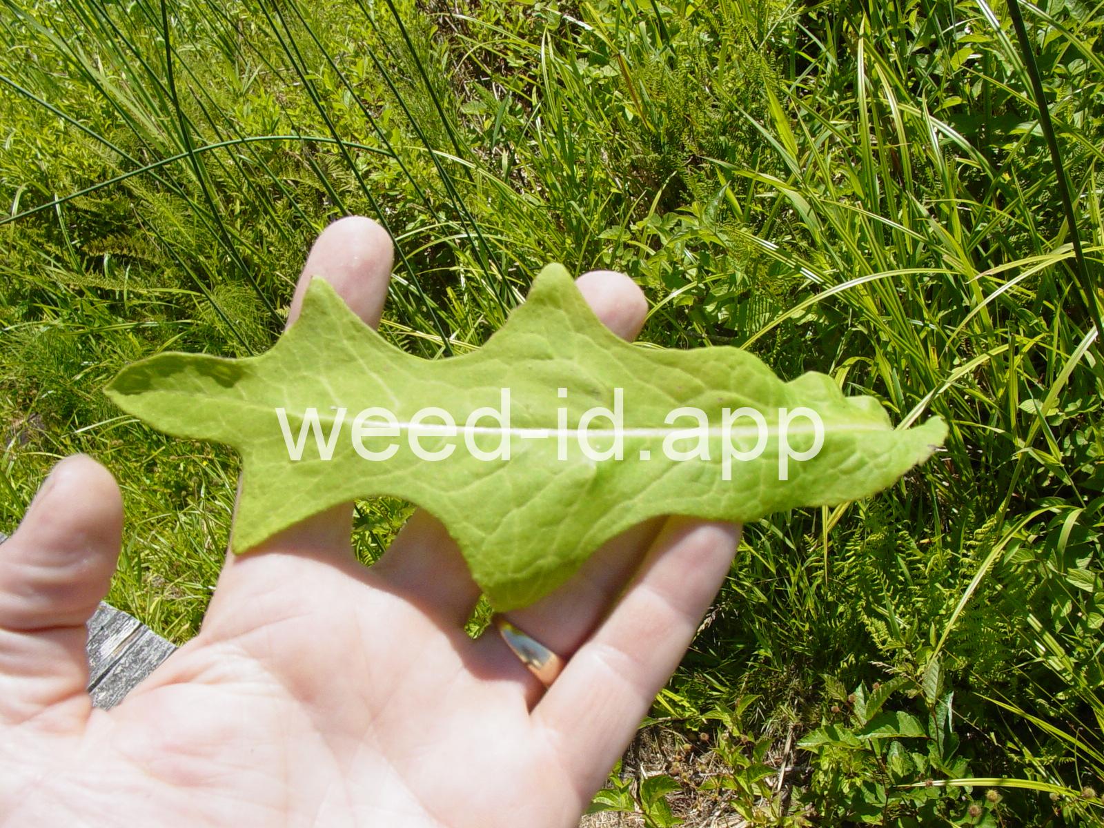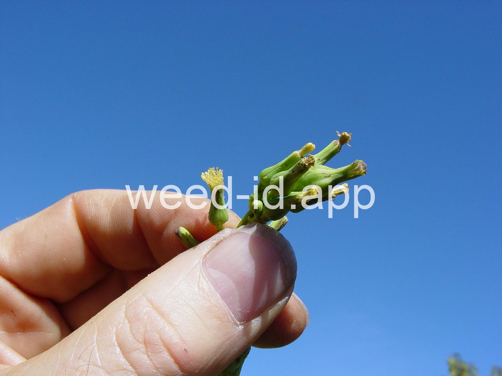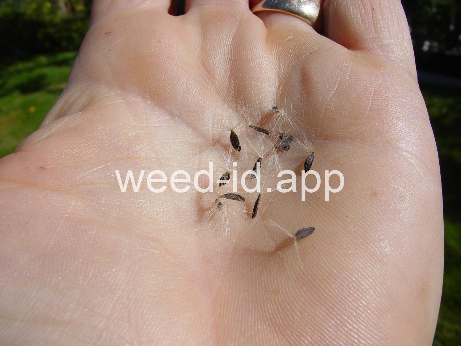 Flowers commonly blue but may be yellow or white. The leaves are lobed almost to the mid-vein, hairless above and soft hairy on the veins beneath. The pappus is brownish and the seed is much broader near the middle with several longitudinal lines on the face.