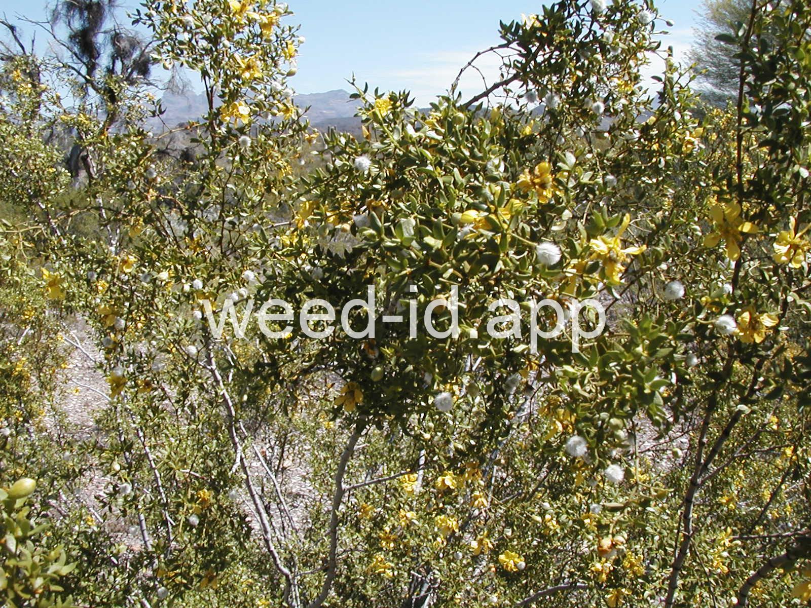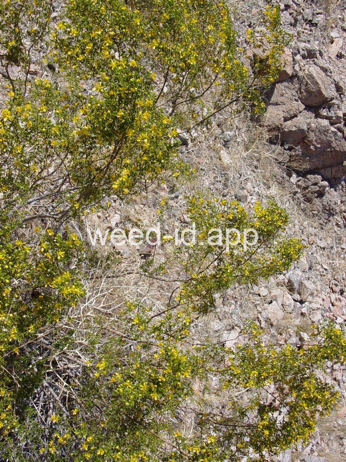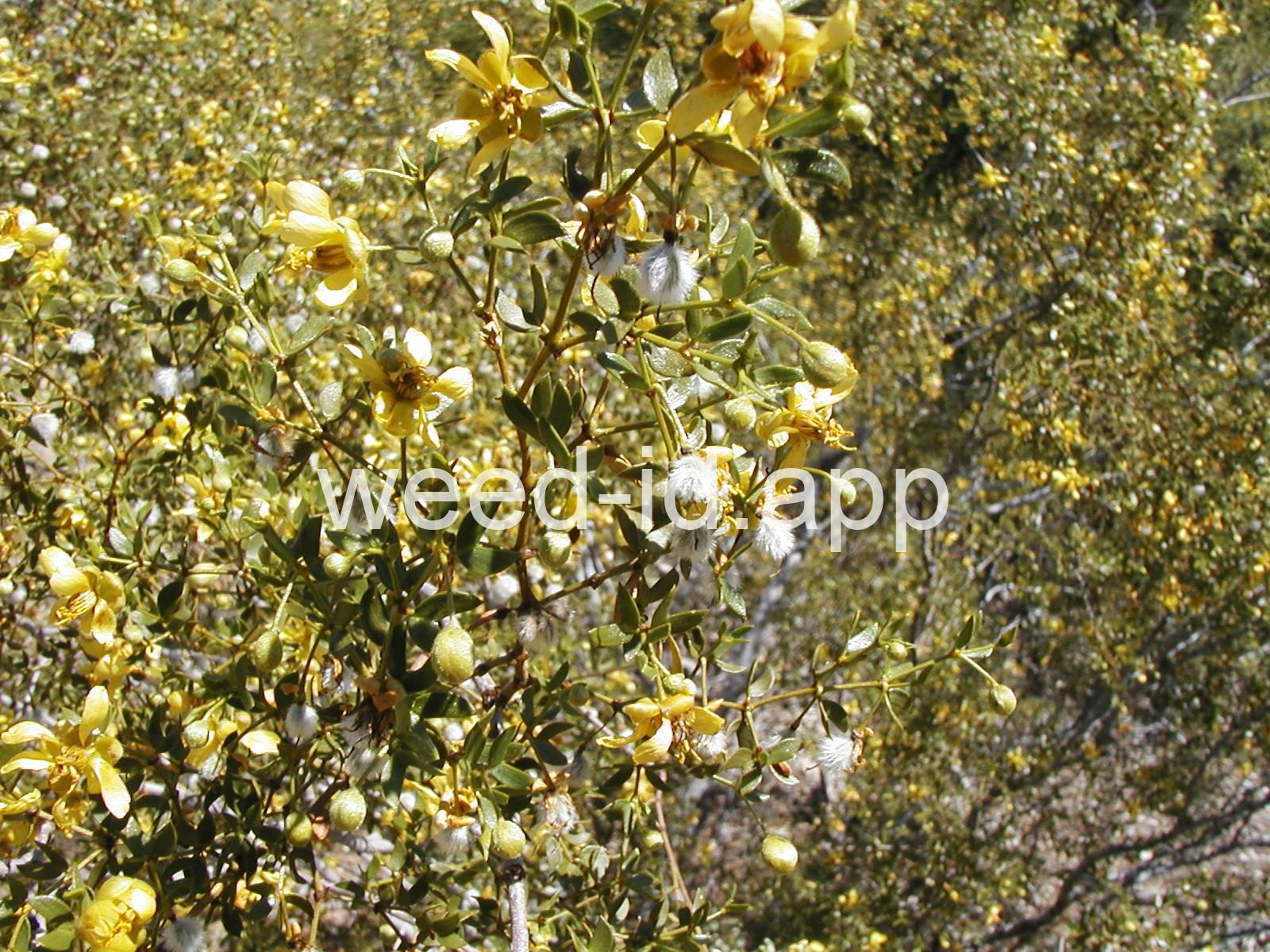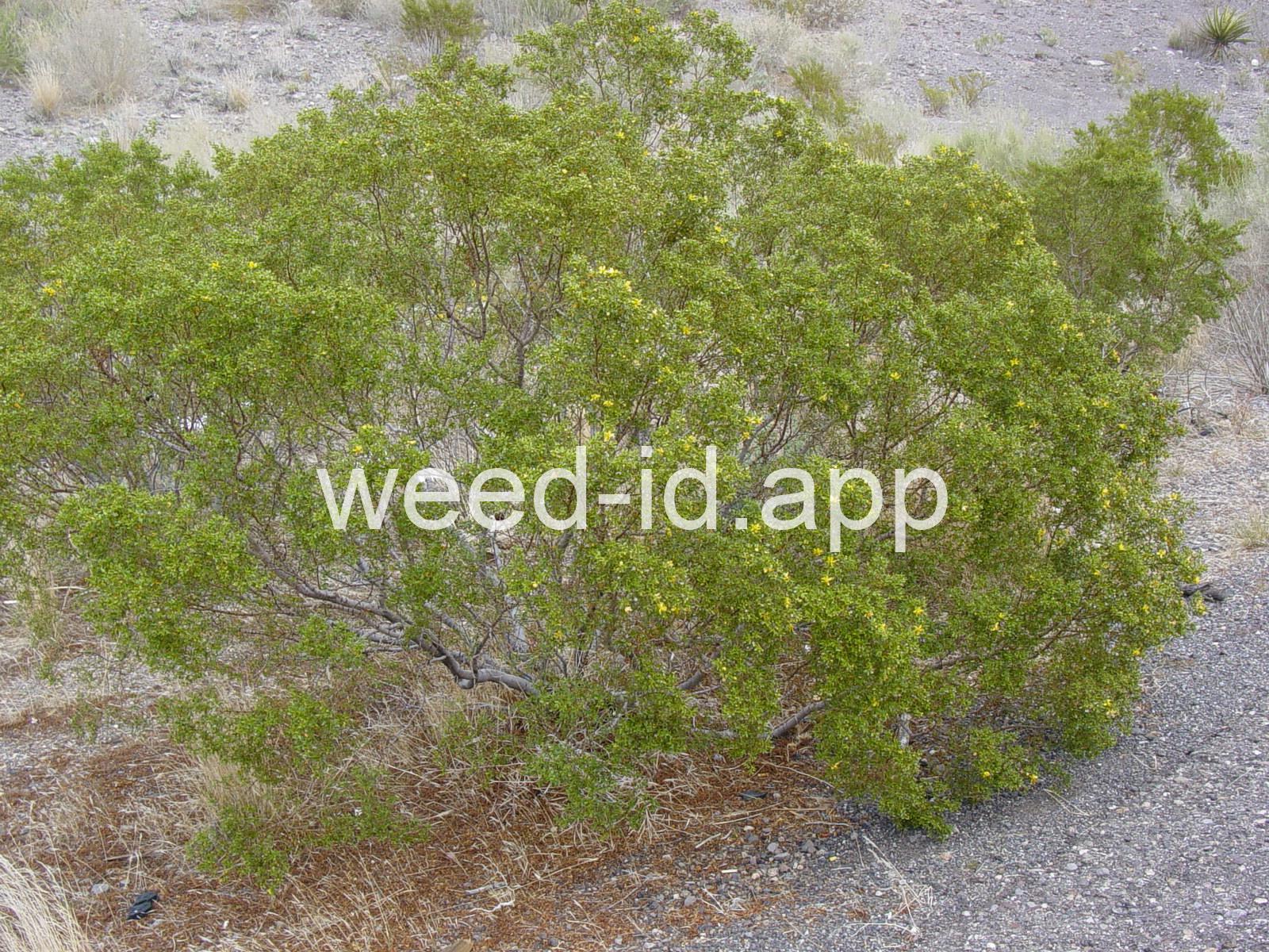 This aromatic shrub has opposite, hairless leaves and yellow flowers. It is native to arid areas in the southwestern United States. The plants are often very uniformly spaced, giving the effect of having been planted.