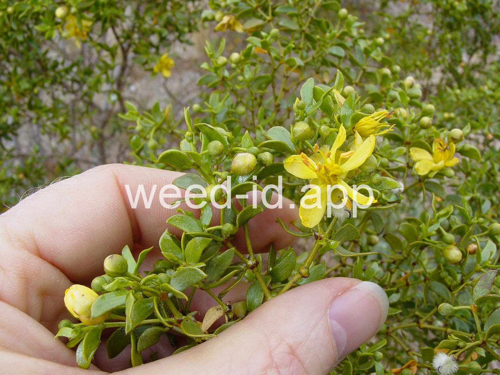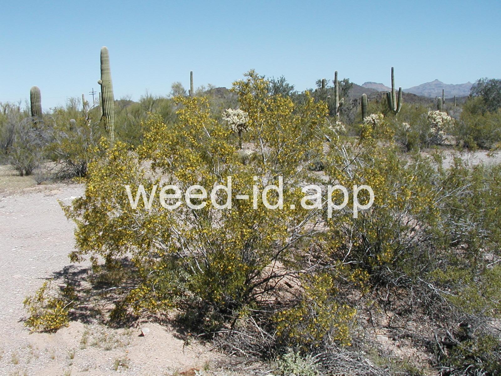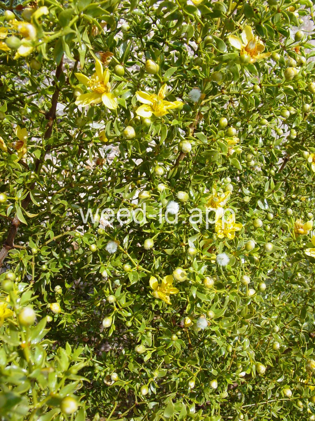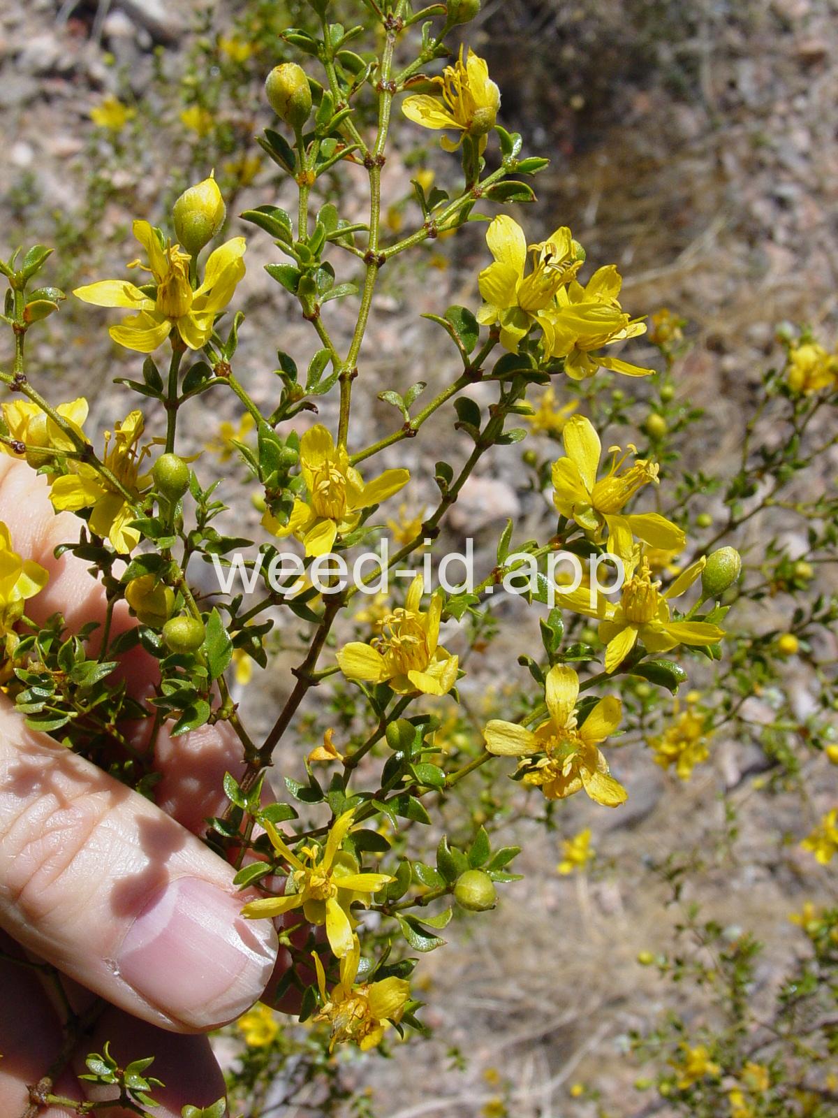 This aromatic shrub has opposite, hairless leaves and yellow flowers. It is native to arid areas in the southwestern United States. The plants are often very uniformly spaced, giving the effect of having been planted.