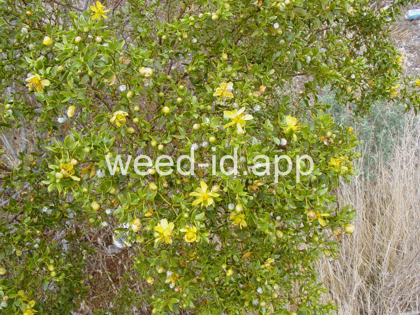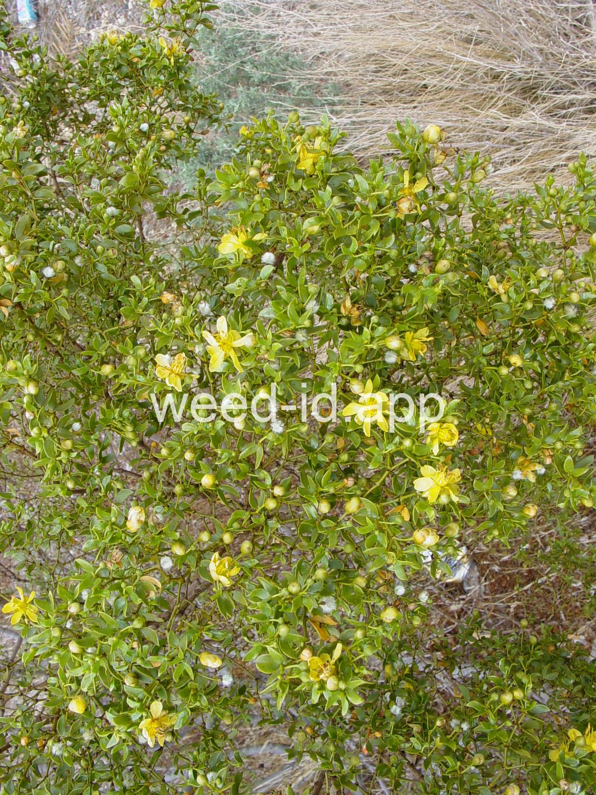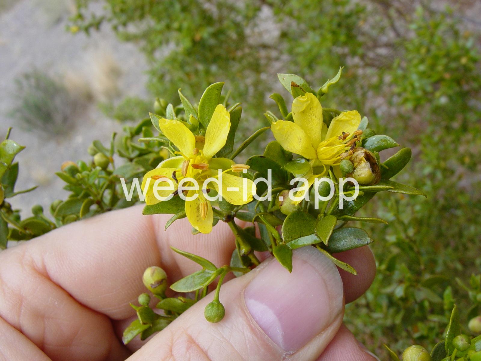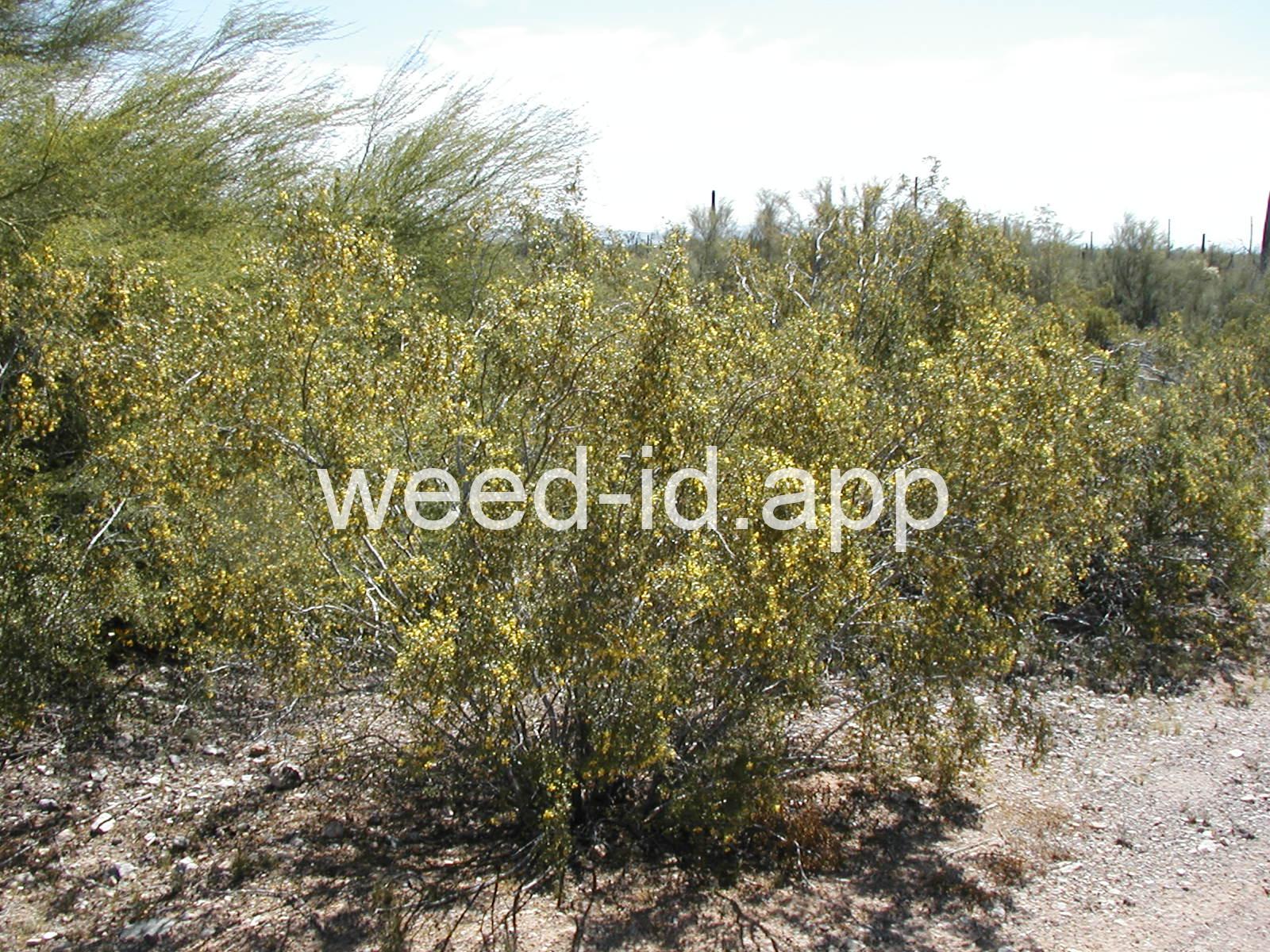 This aromatic shrub has opposite, hairless leaves and yellow flowers. It is native to arid areas in the southwestern United States. The plants are often very uniformly spaced, giving the effect of having been planted.