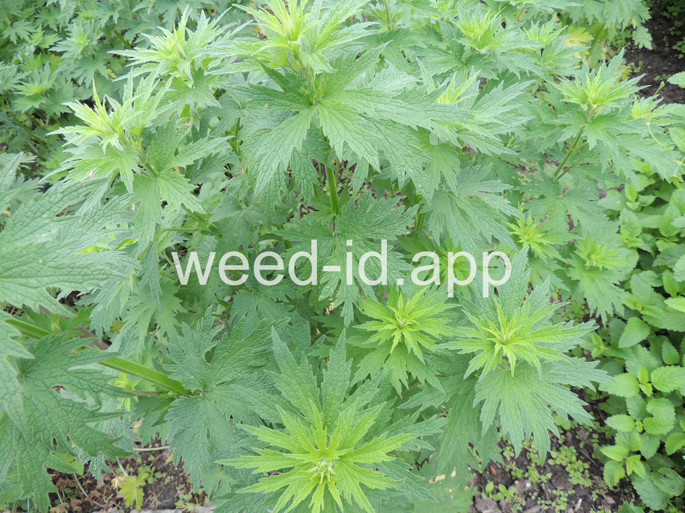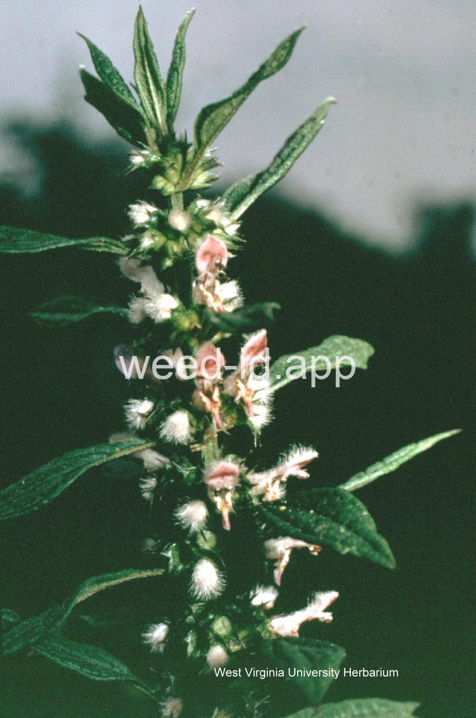 The leaves are opposite with palmate veins and 3 to 5 lanceolate segments. The flowers arise in widely spaced axillary whorls. The petals are pink to purple, and the sepals form a spiny bur at maturity. Two of the spinose sepals are oriented at right angles to the other three.