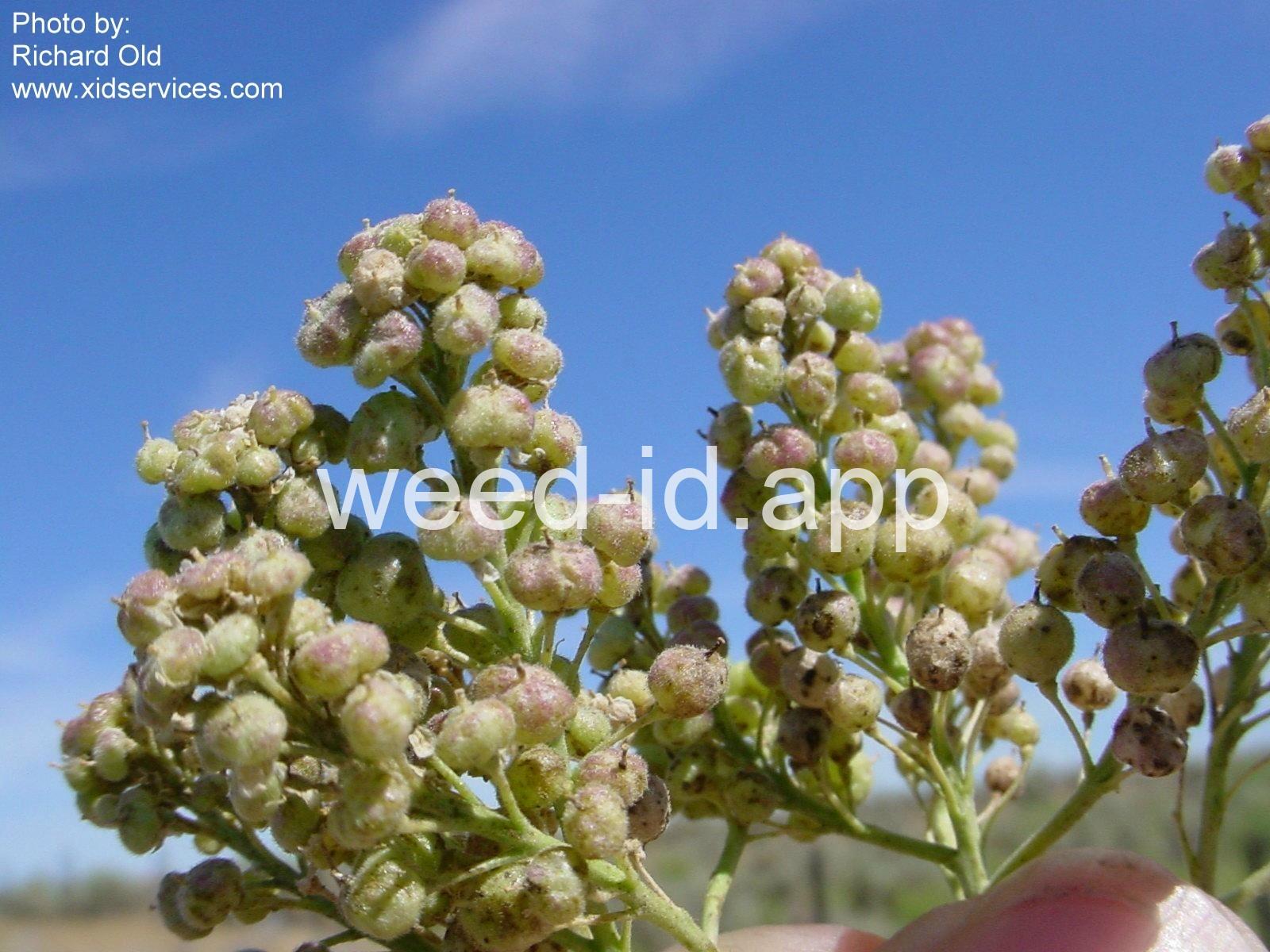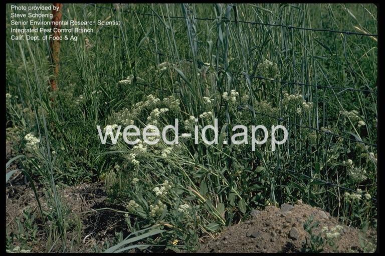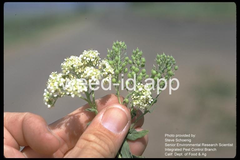 The genus Cardaria has recently been merged into the genus Lepidium, so the scientific nomenclature here will not be in agreement with many existing weed reference books. There are 3 species of Lepidium referred to as various types of `whitetop.` They are all rhizomatous perennials with flat topped clusters of white flowers that form somewhat inflated fruits. They are distinguished as follows: Sepals and fruits pubescent = Lepidium appelianum Fruits broadest near the base = Lepidium draba Fruits broadest near the middle or tip = Lepidium chalepense