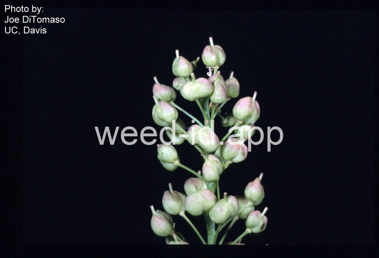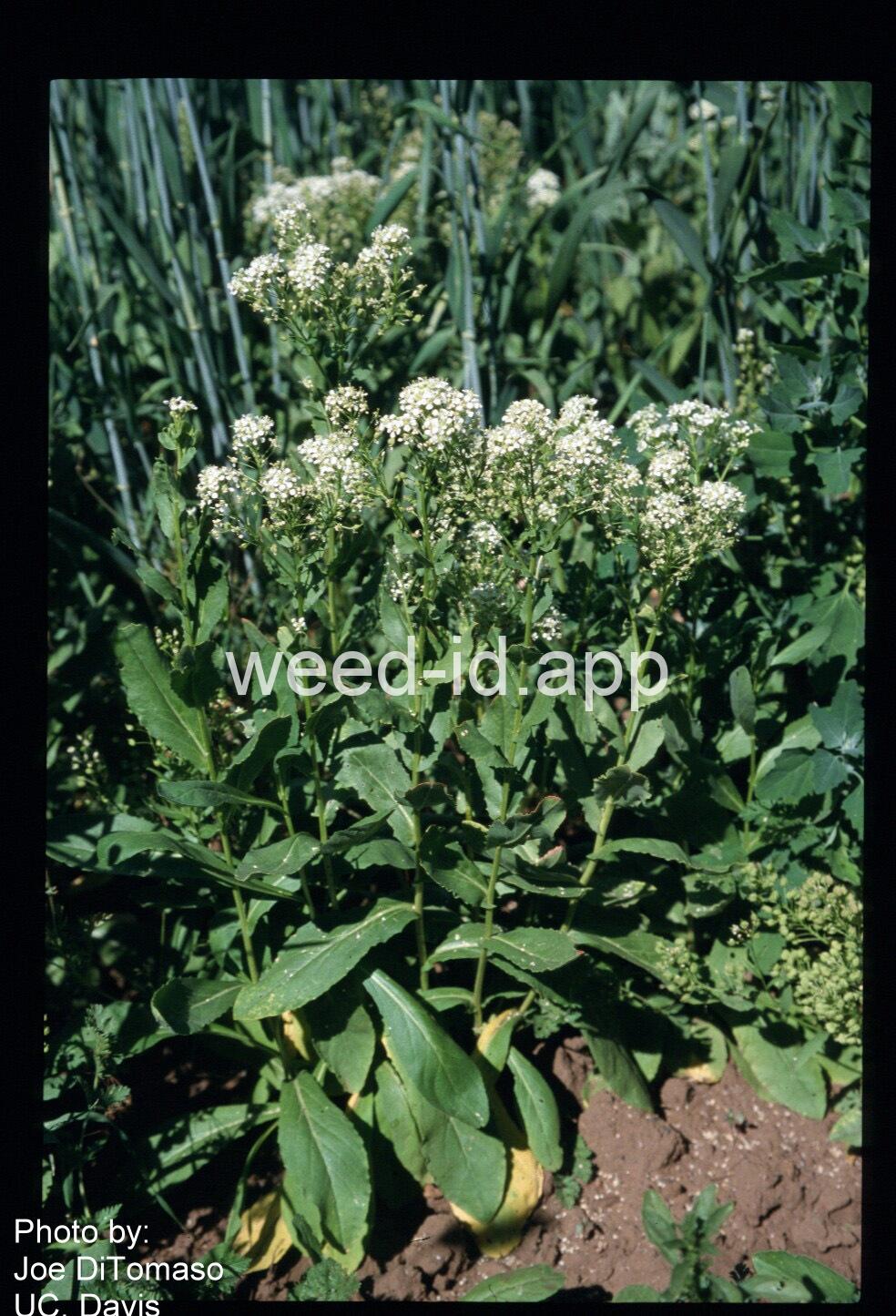 The genus Cardaria has recently been merged into the genus Lepidium, so the scientific nomenclature here will not be in agreement with many existing weed reference books. There are 3 species of Lepidium referred to as various types of `whitetop.` They are all rhizomatous perennials with flat topped clusters of white flowers that form somewhat inflated fruits. They are distinguished as follows: Sepals and fruits pubescent = Lepidium appelianum Fruits broadest near the base = Lepidium draba Fruits broadest near the middle or tip = Lepidium chalepense