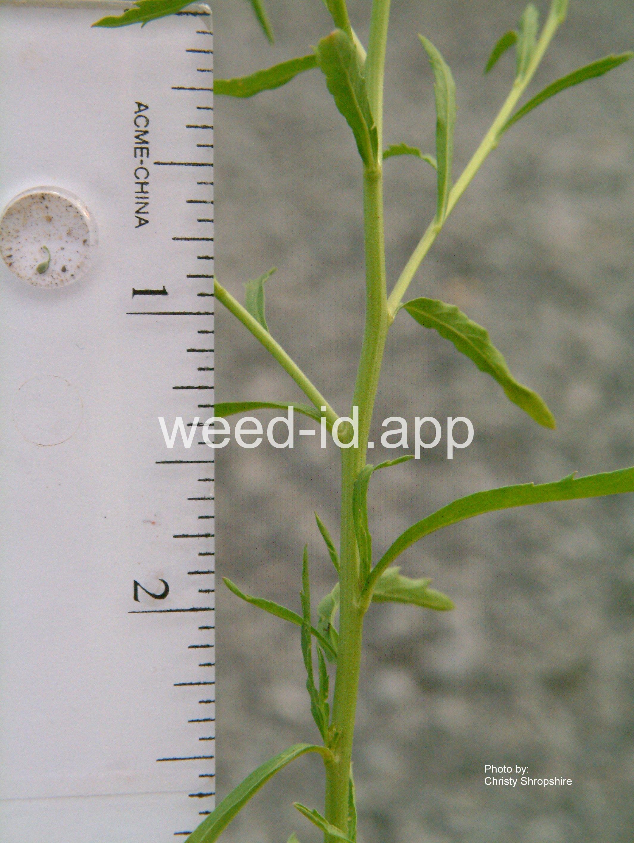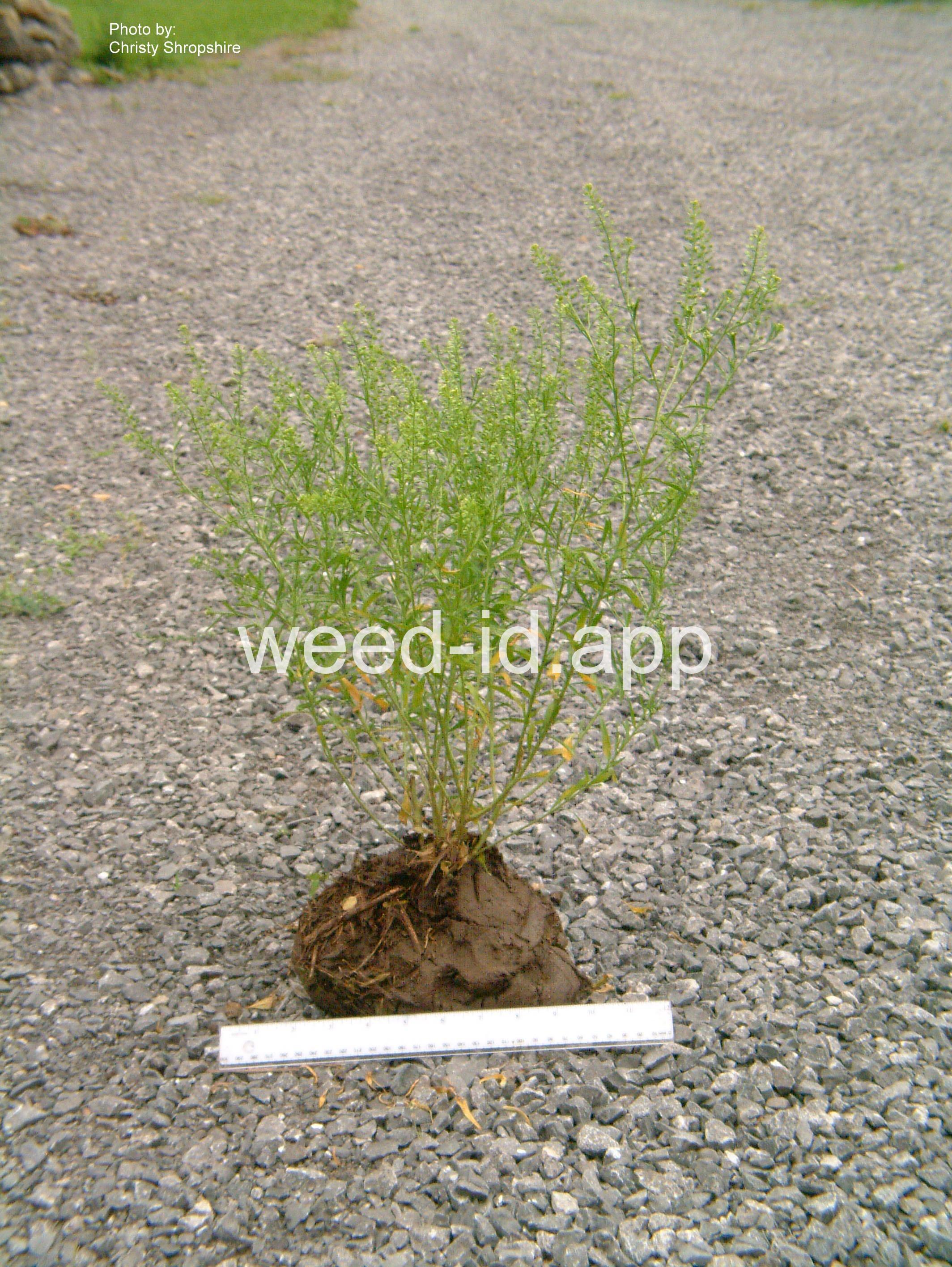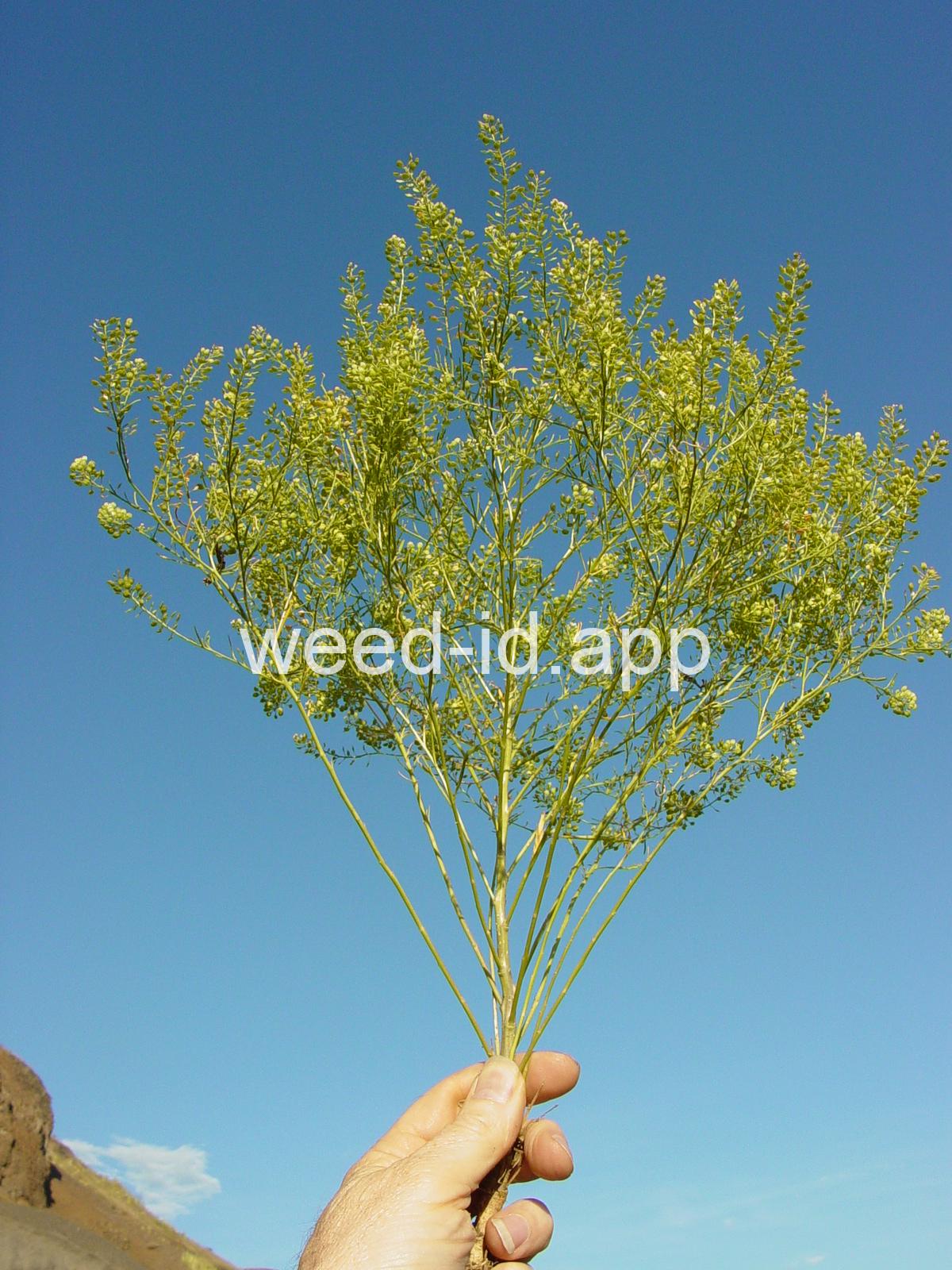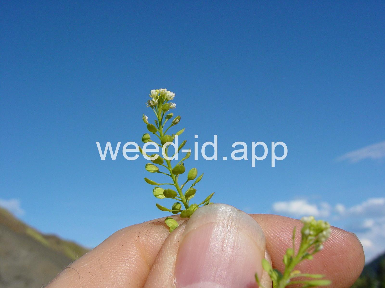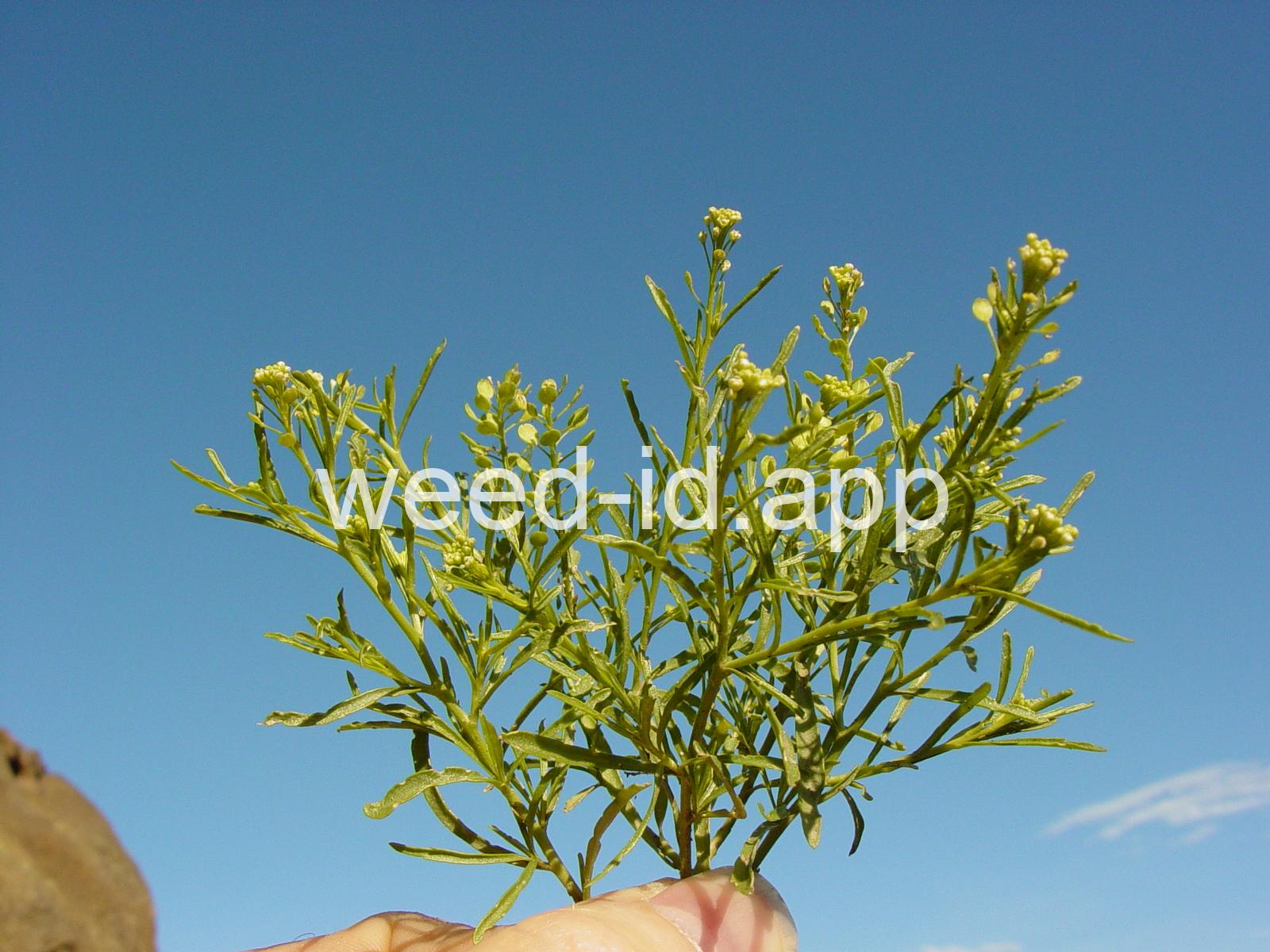 An extensively branched and bushy annual with tiny flowers usually without petals. The seed pods are also tiny (2 mm) with a notch at the tip.