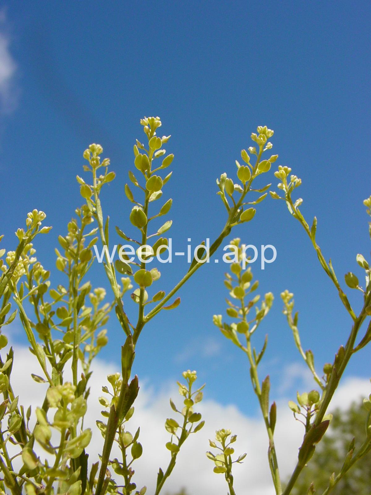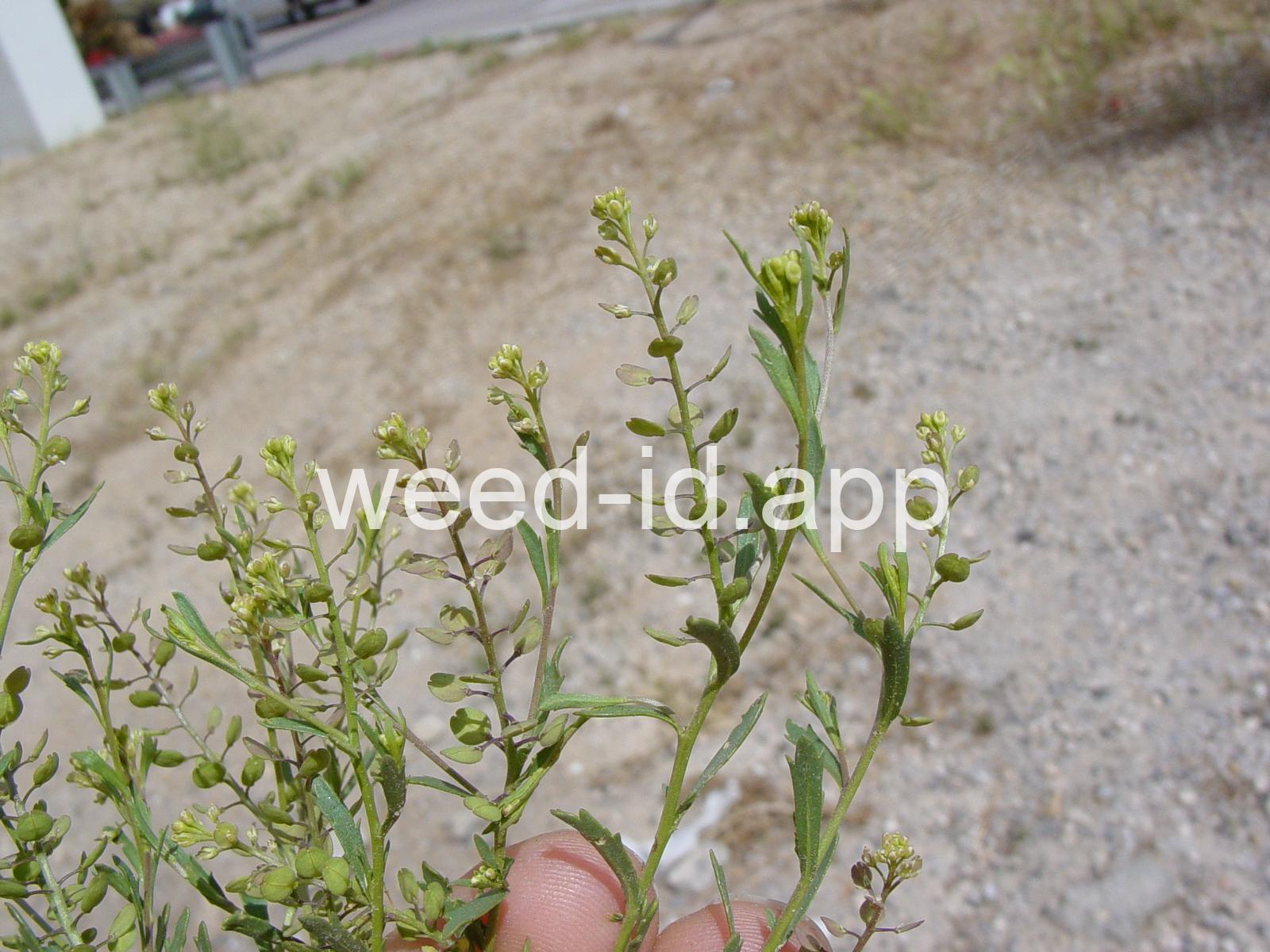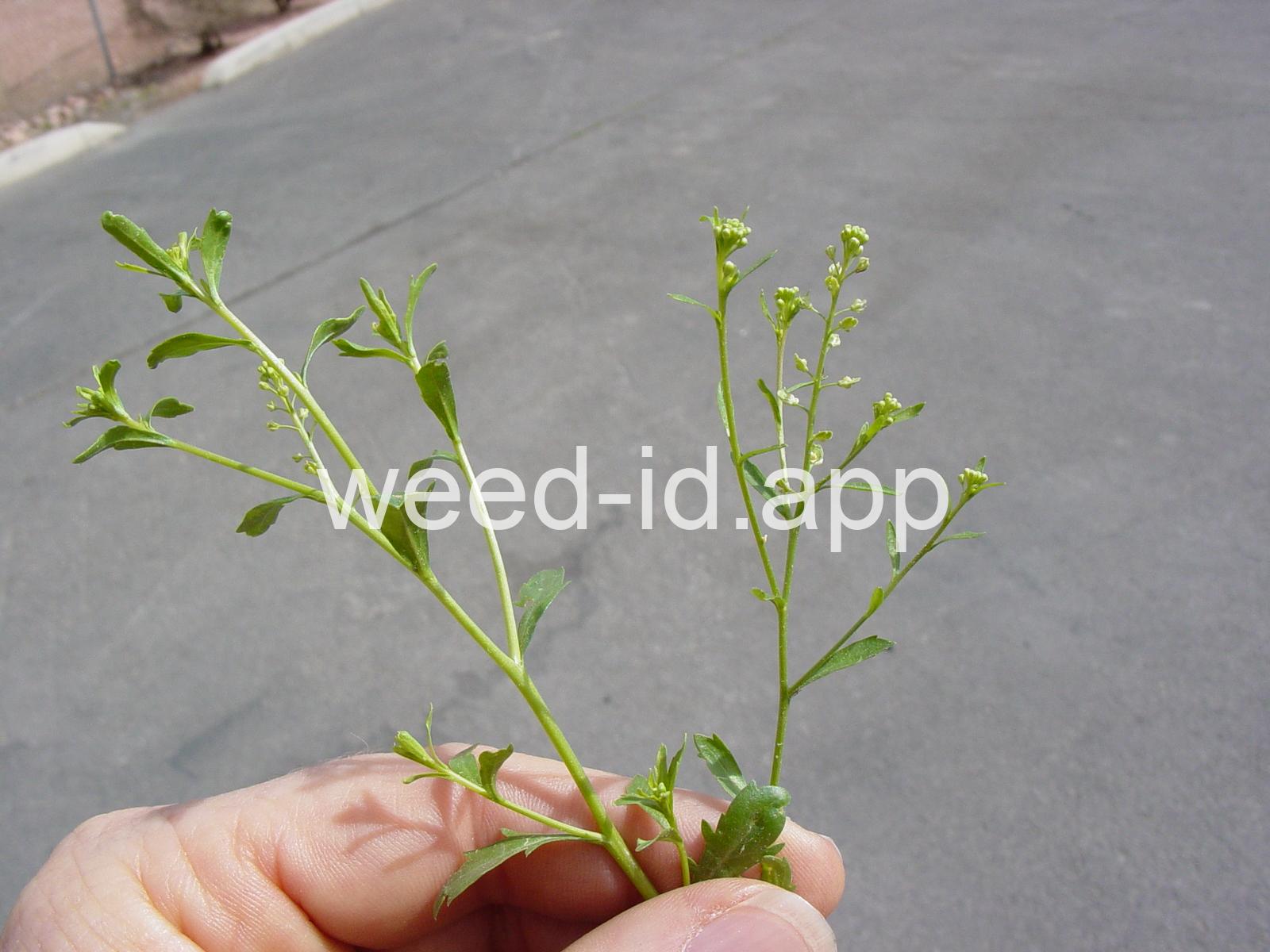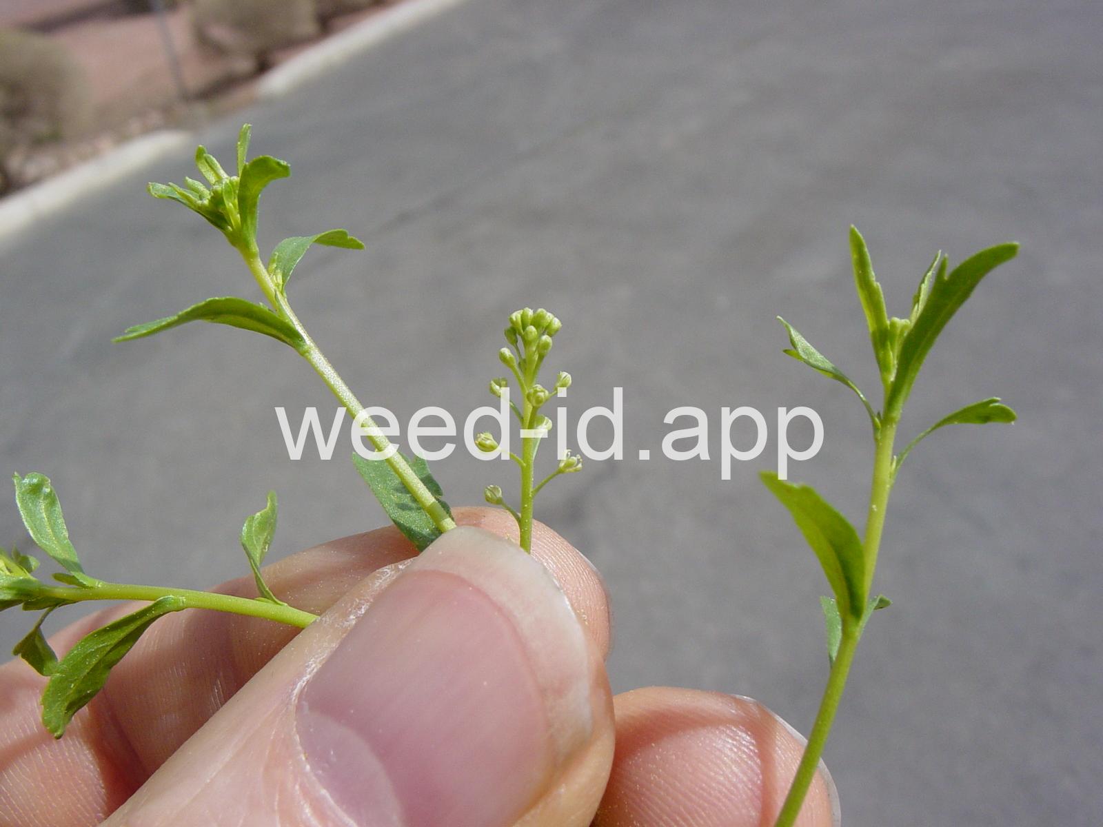 A small annual, the petals tiny and white or absent, stamens 2. The fruit stems are prominently flattened.