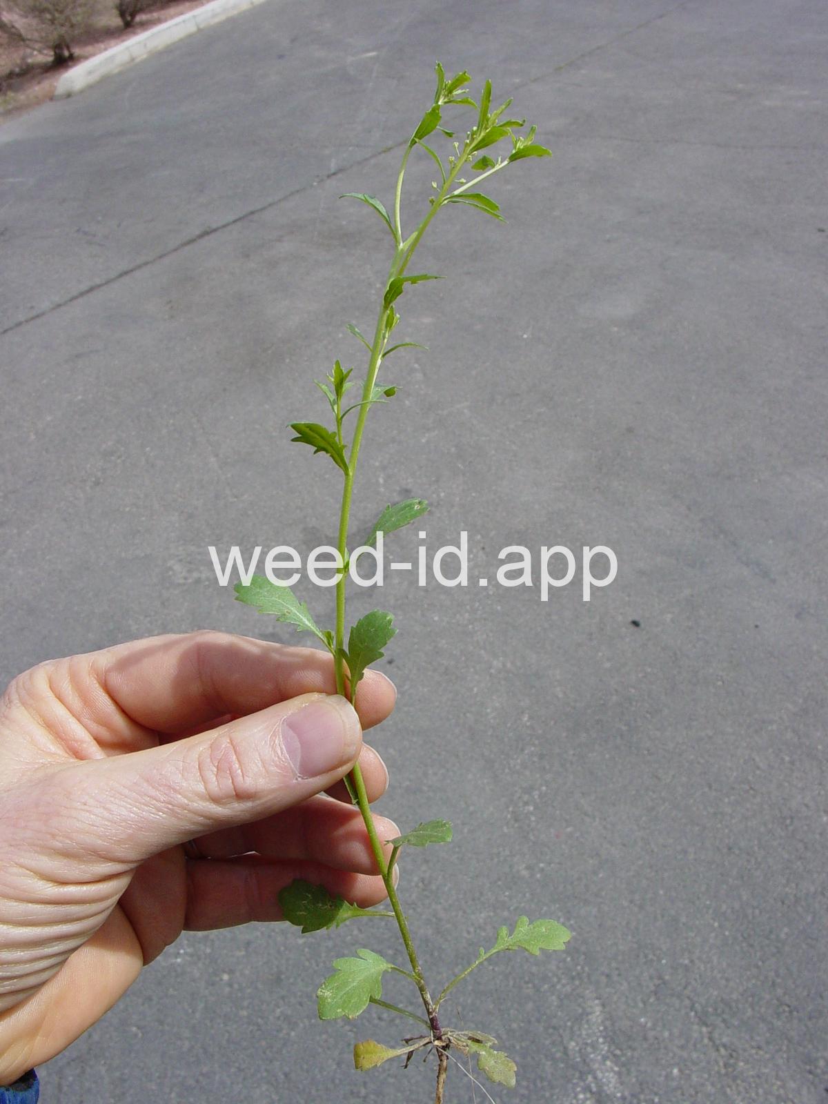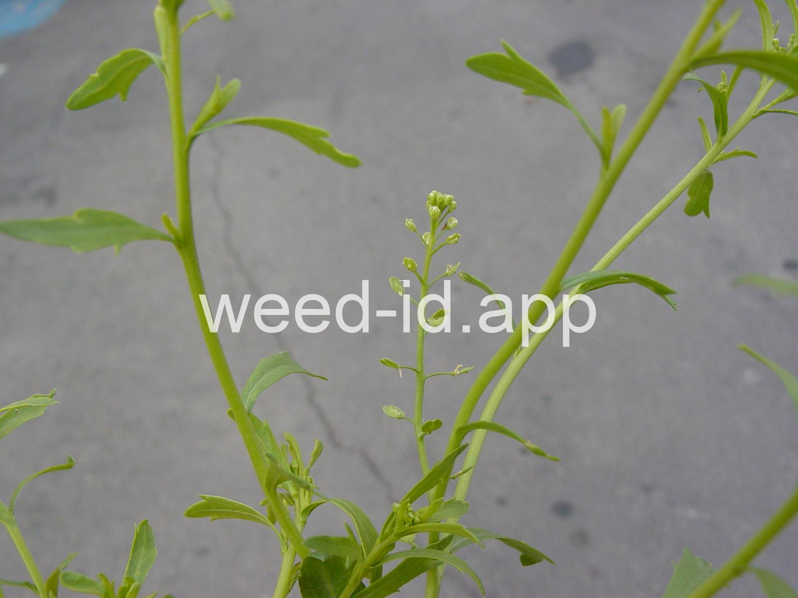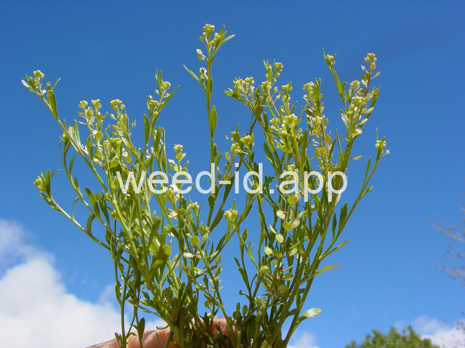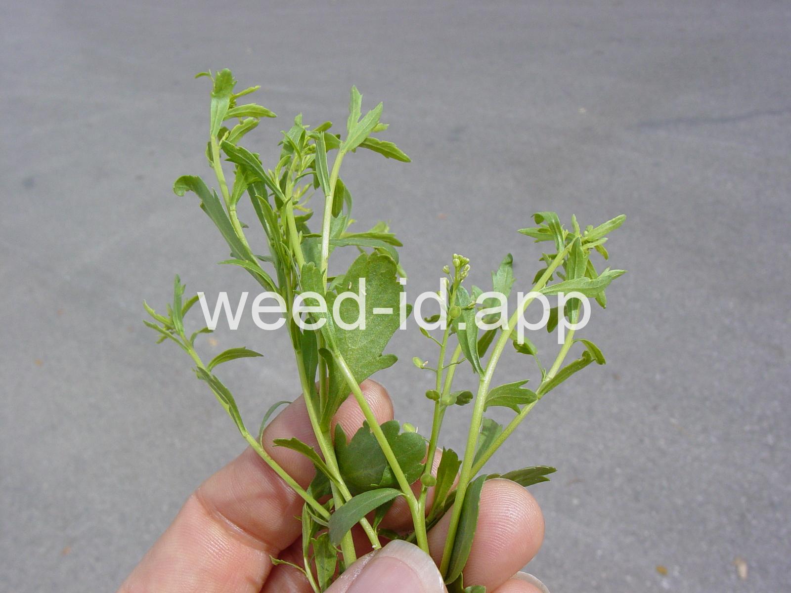 A small annual, the petals tiny and white or absent, stamens 2. The fruit stems are prominently flattened.