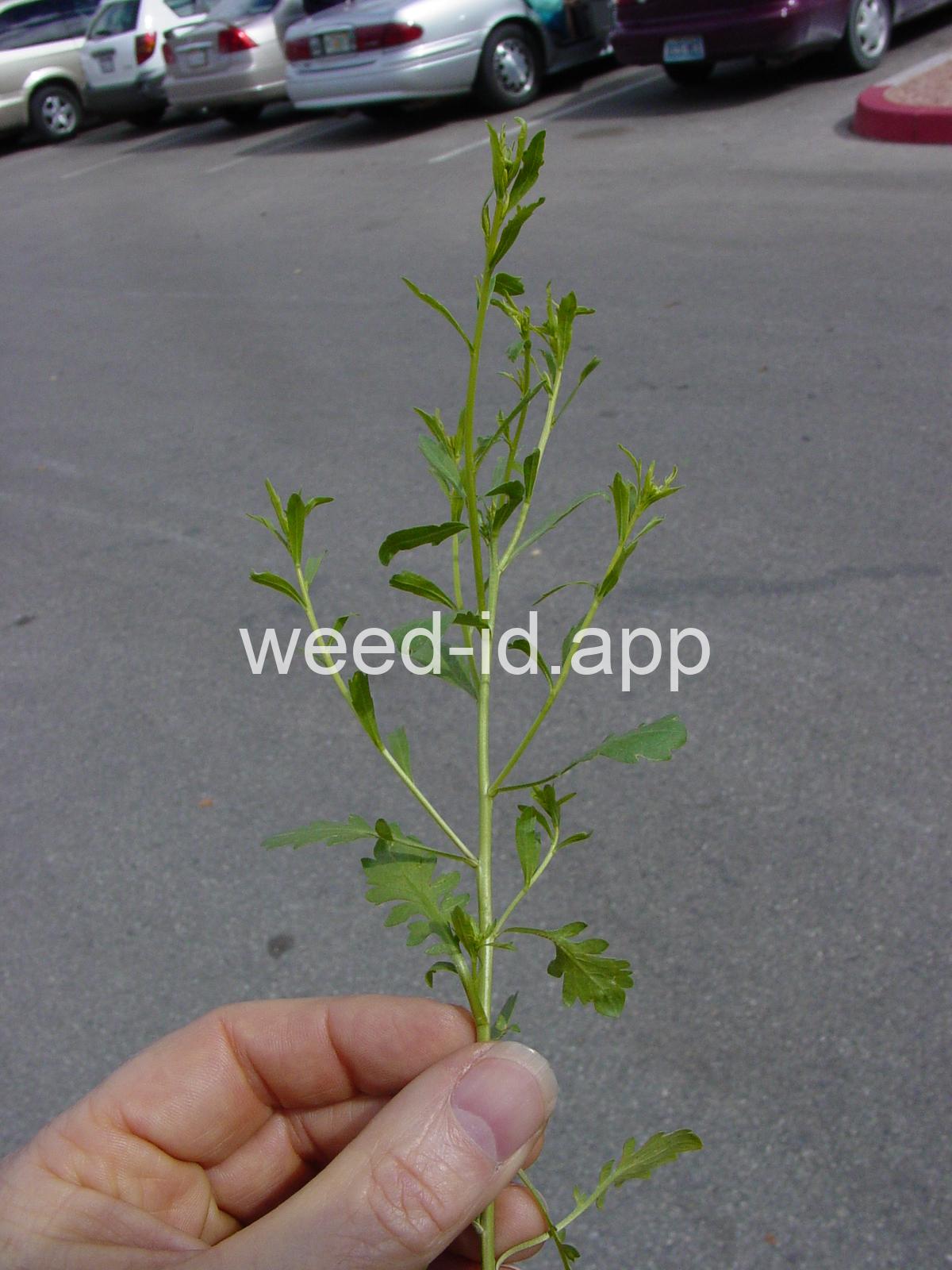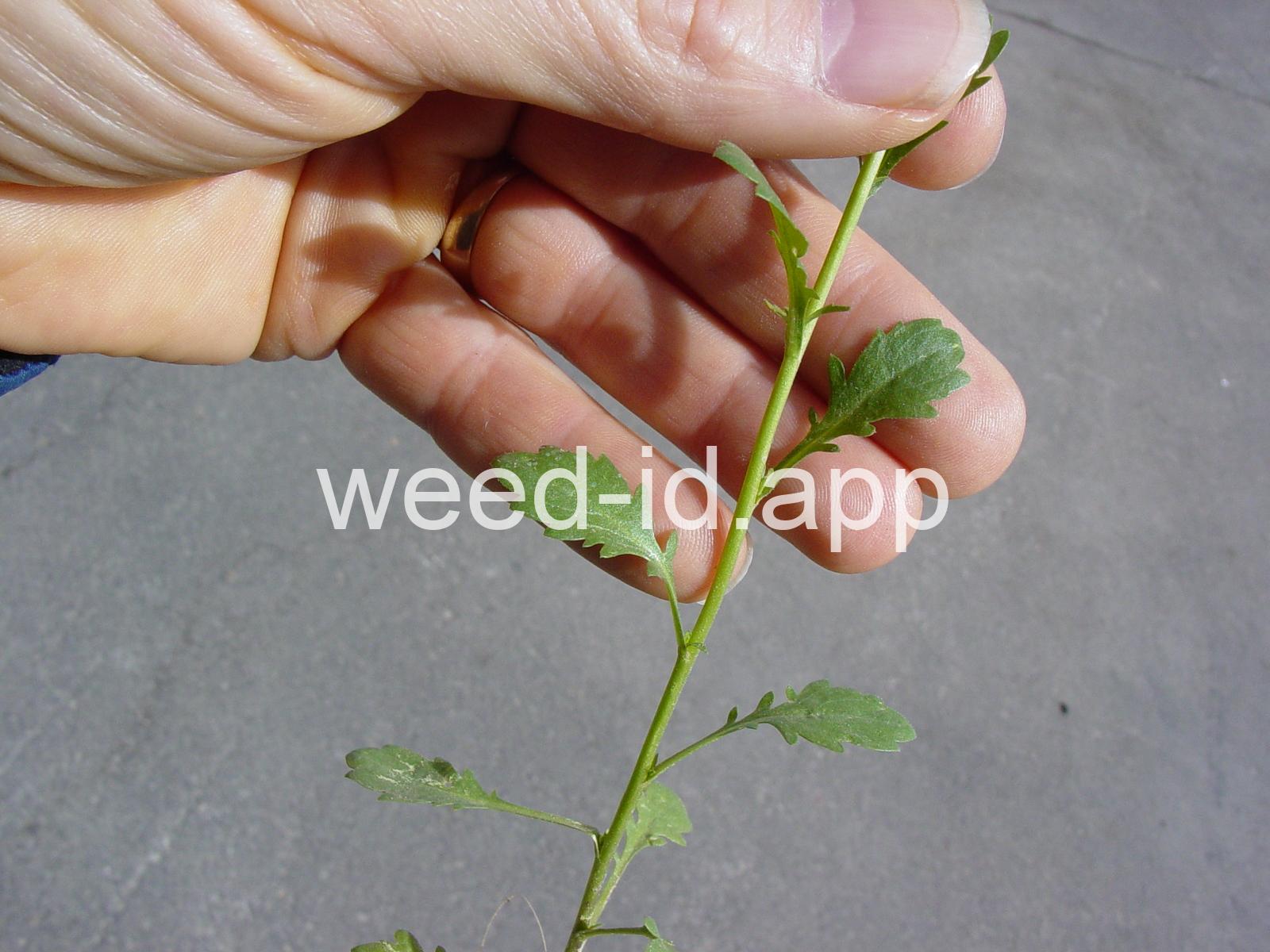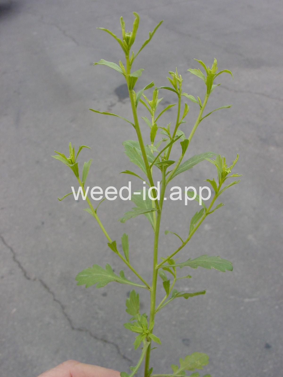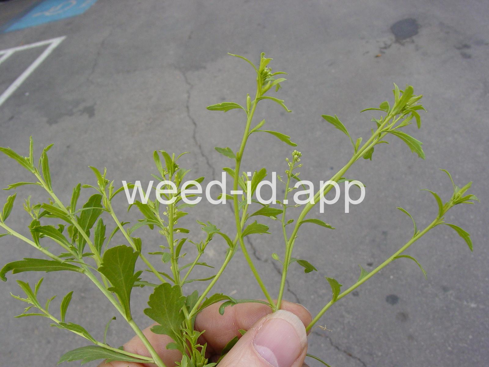 A small annual, the petals tiny and white or absent, stamens 2. The fruit stems are prominently flattened.