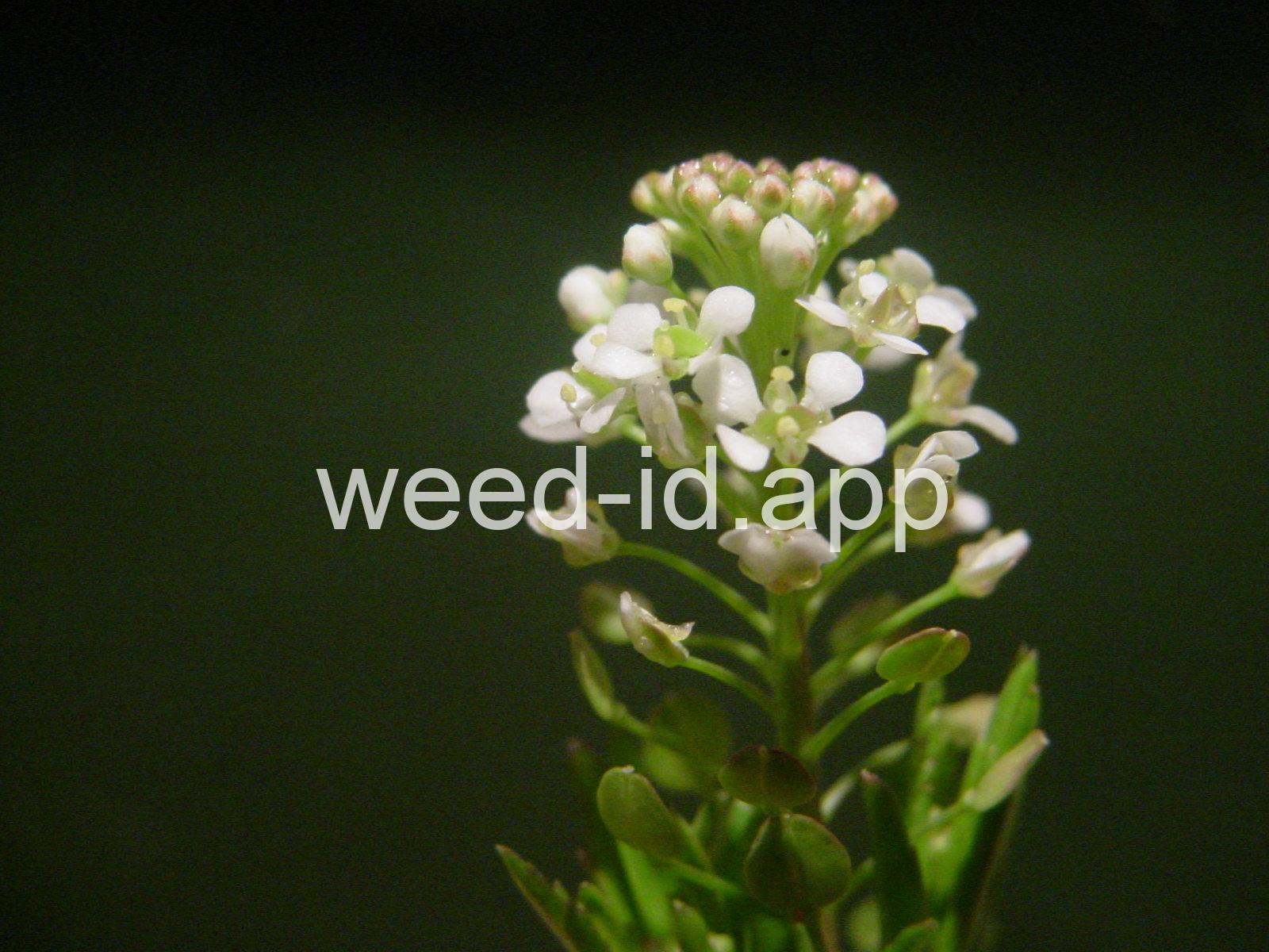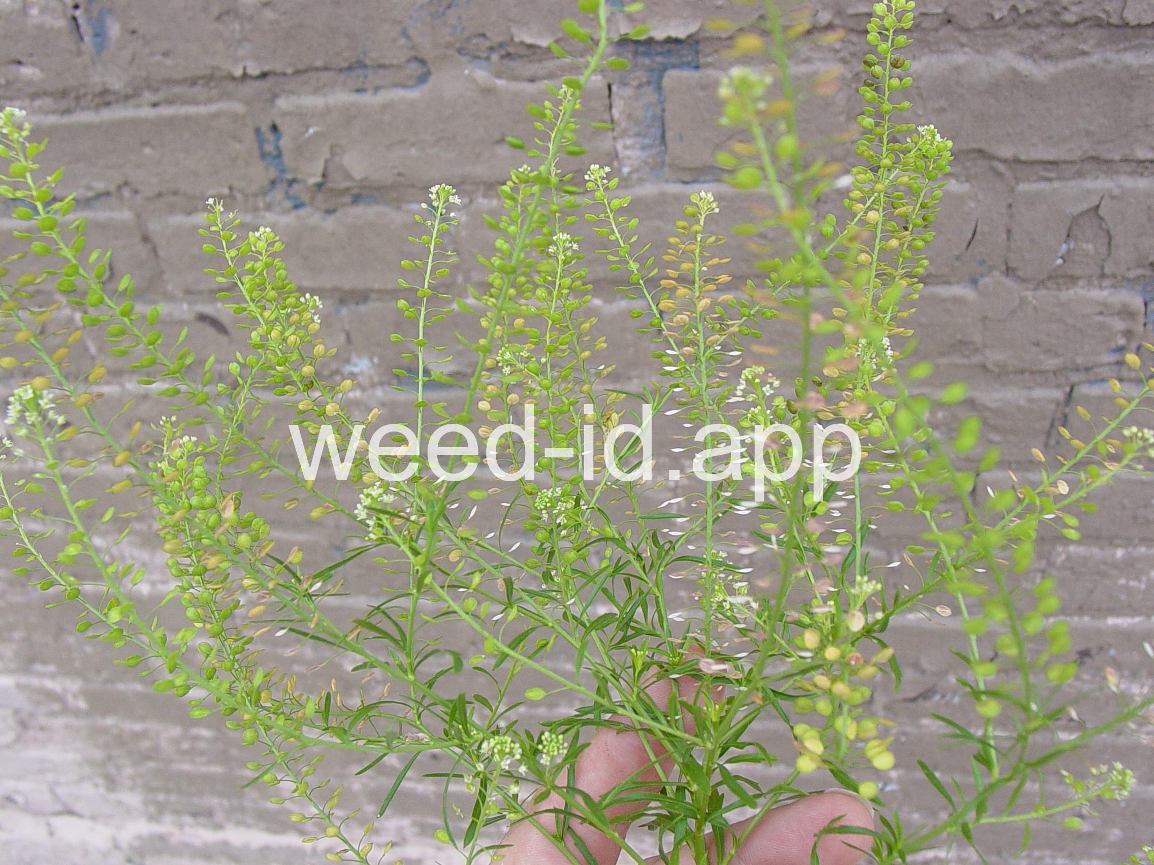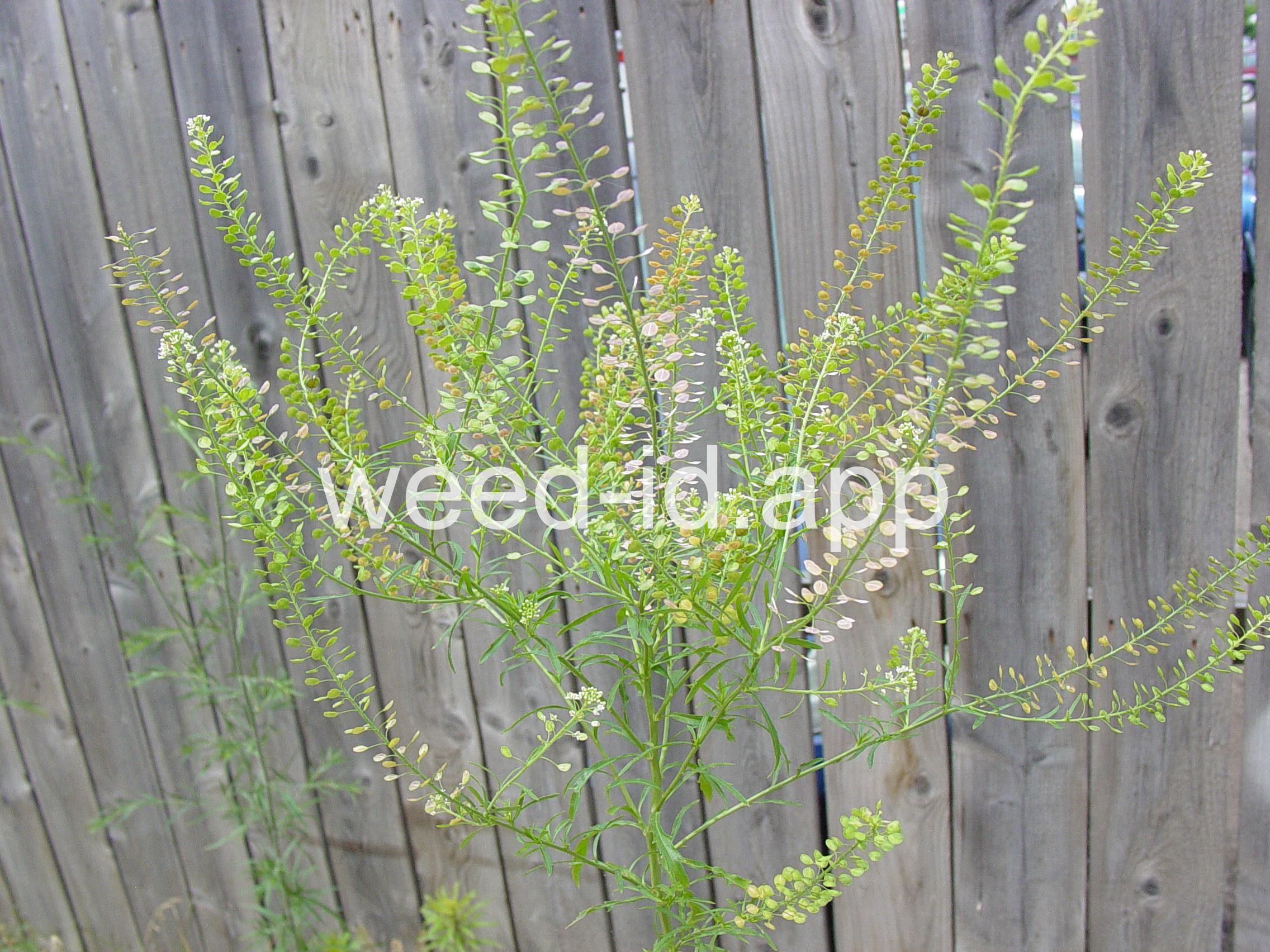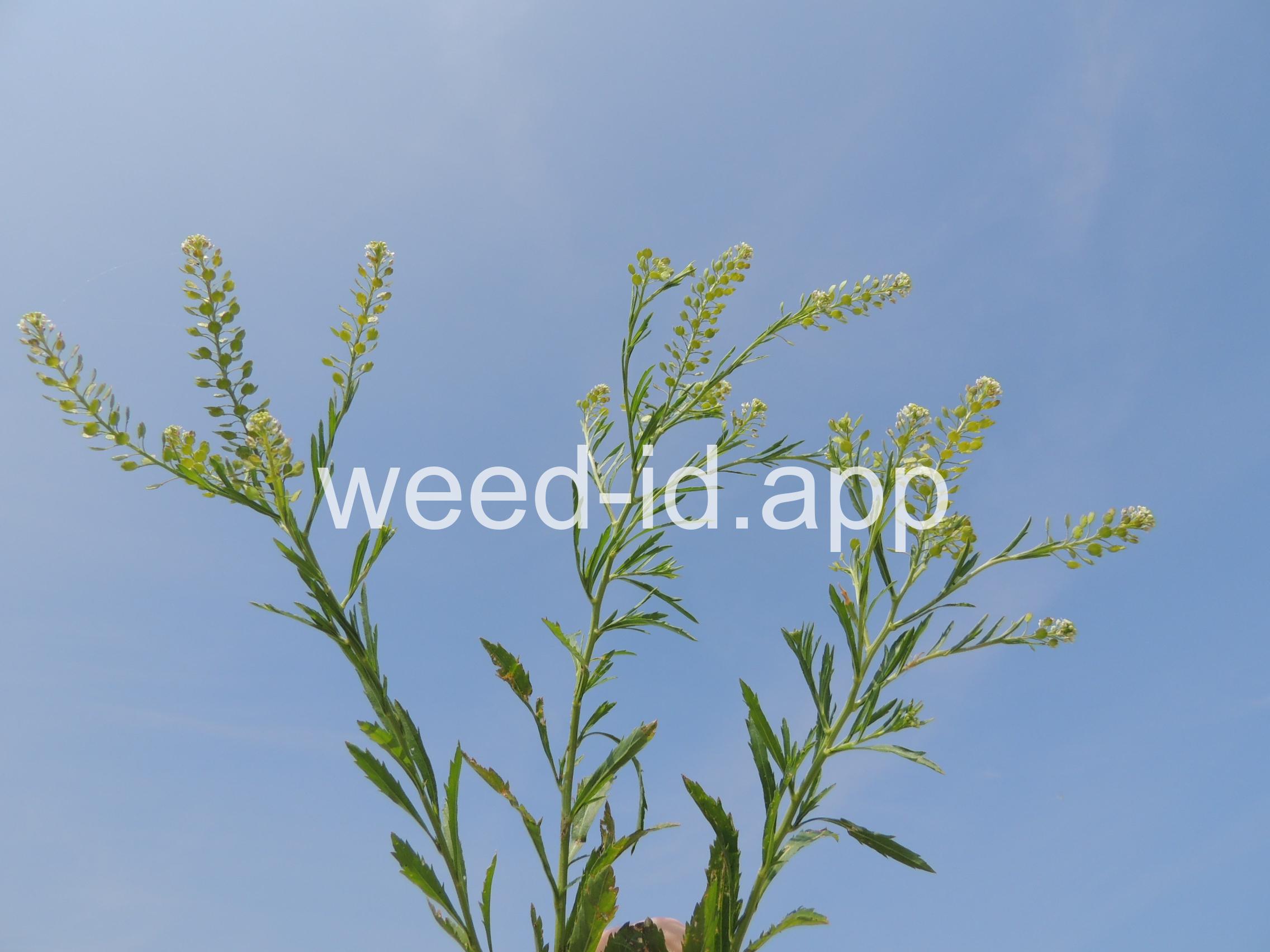 An extremely variable annual weed resembling Lepidium campestre but without clasping stem leaves. Chew the seeds to see why the common name is `pepperweed.`