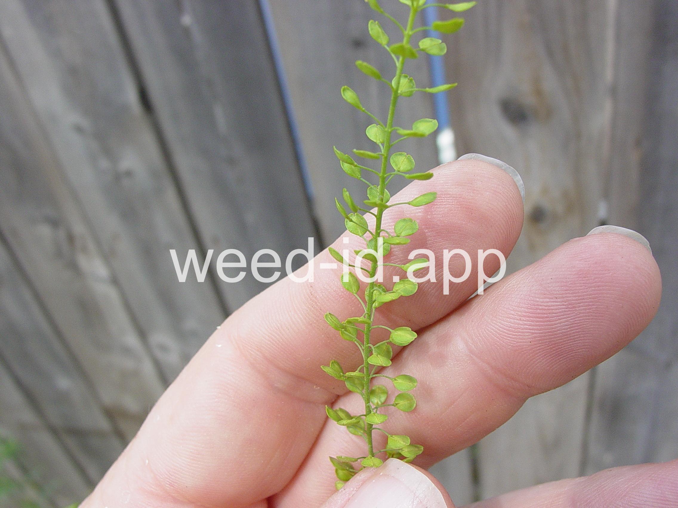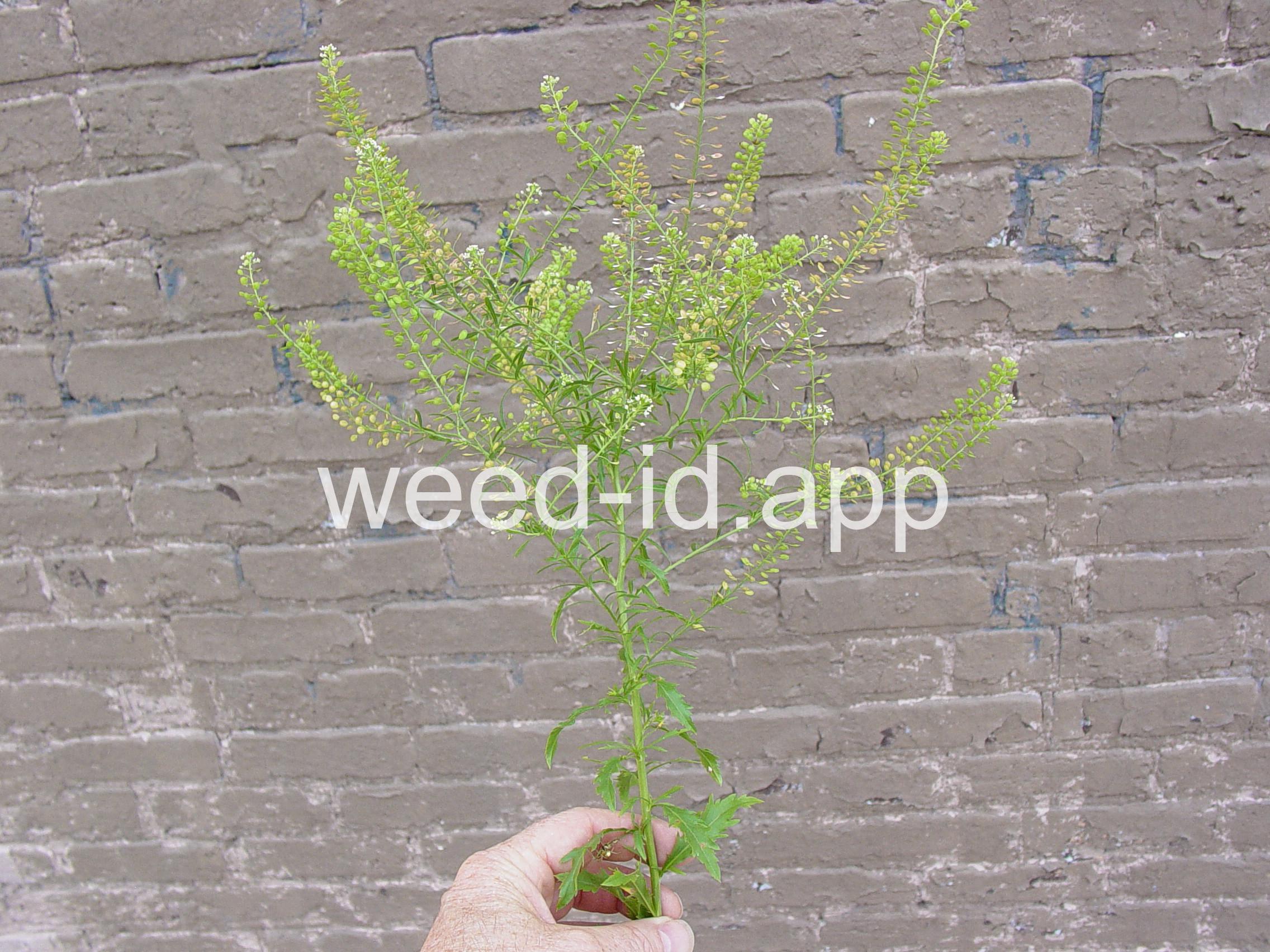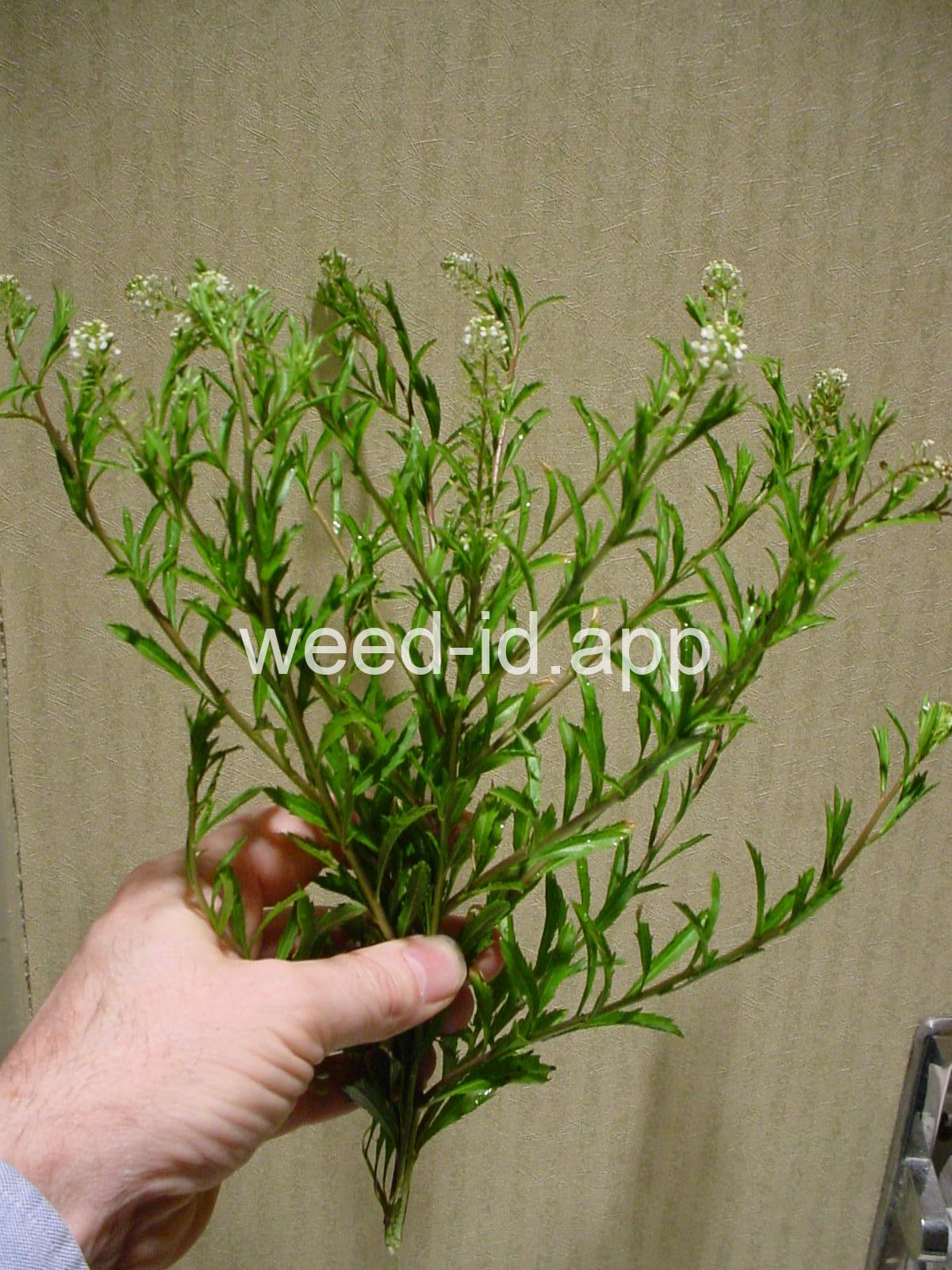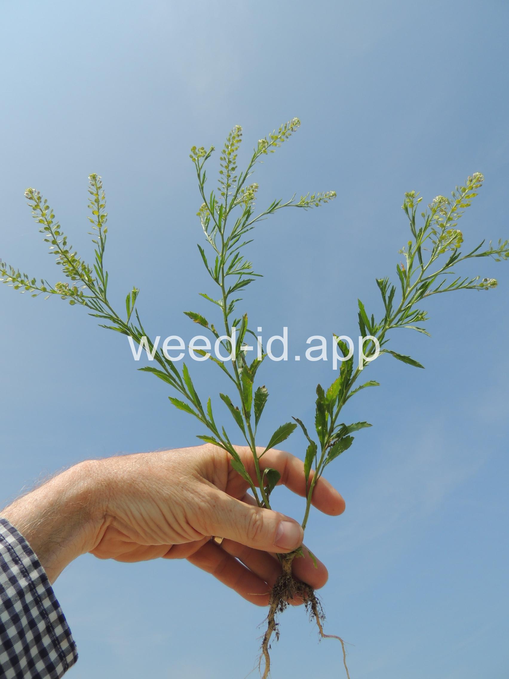An extremely variable annual weed resembling Lepidium campestre but without clasping stem leaves. Chew the seeds to see why the common name is `pepperweed.`