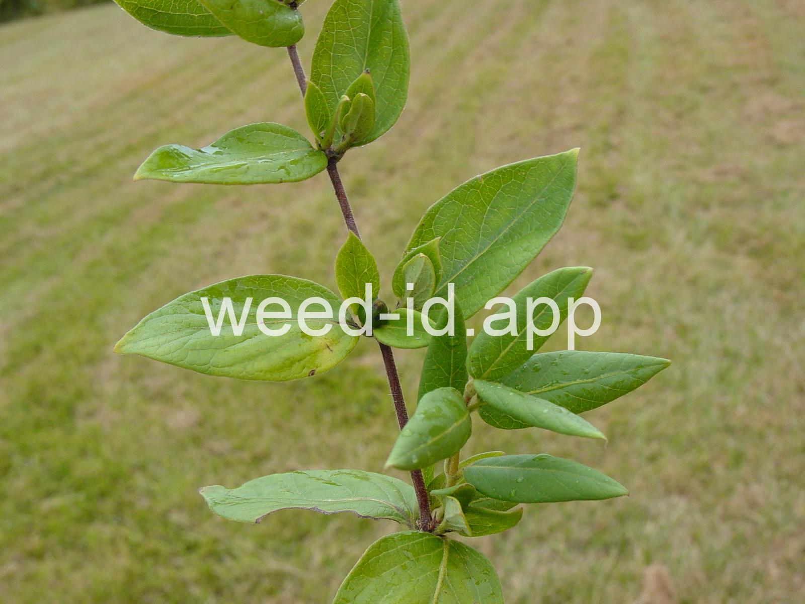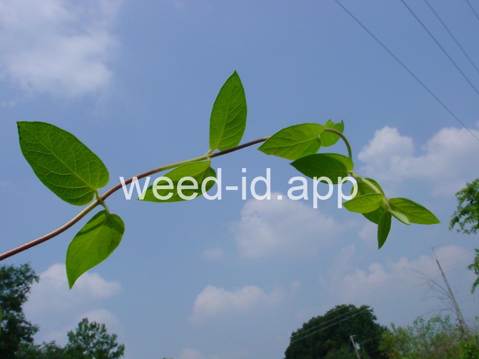 Woody vine with opposite leaves. Flowers borne in pairs. Fruit a black berry. Very weedy on the east coast.