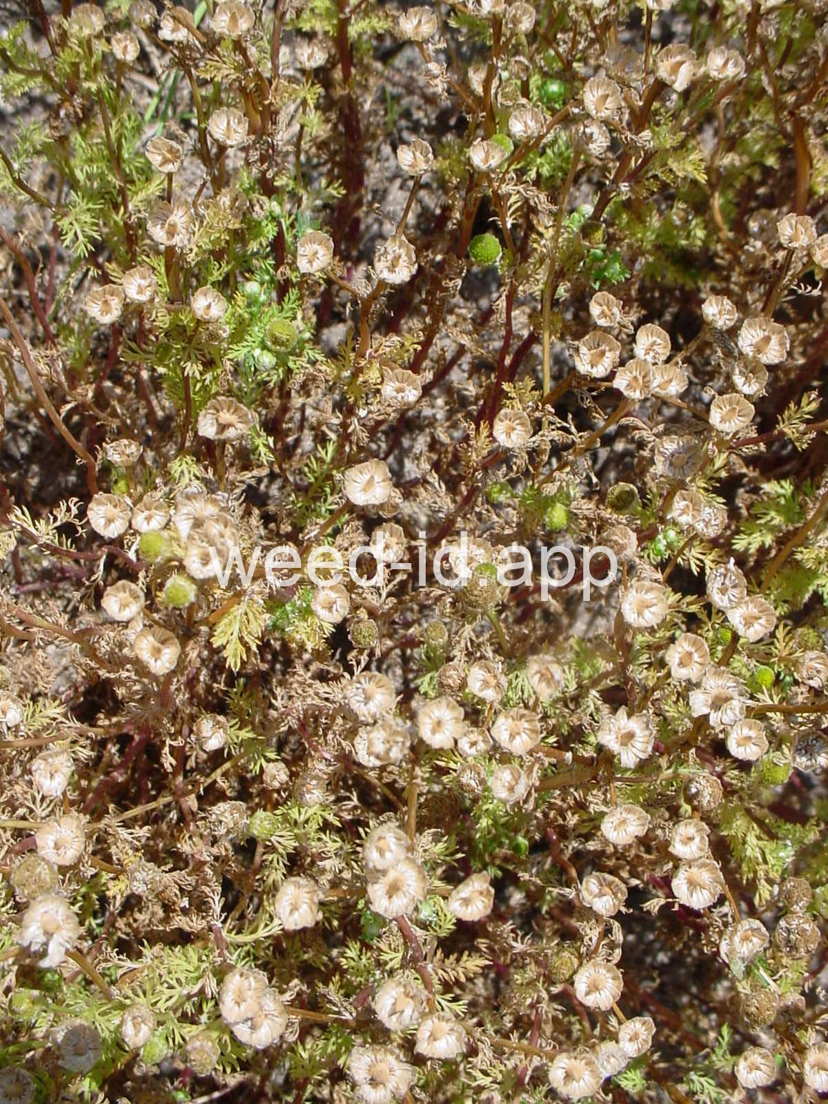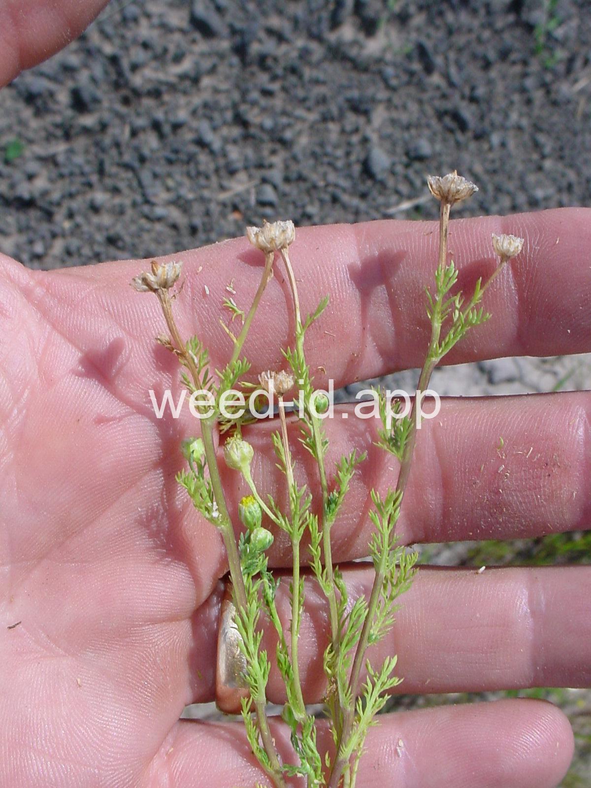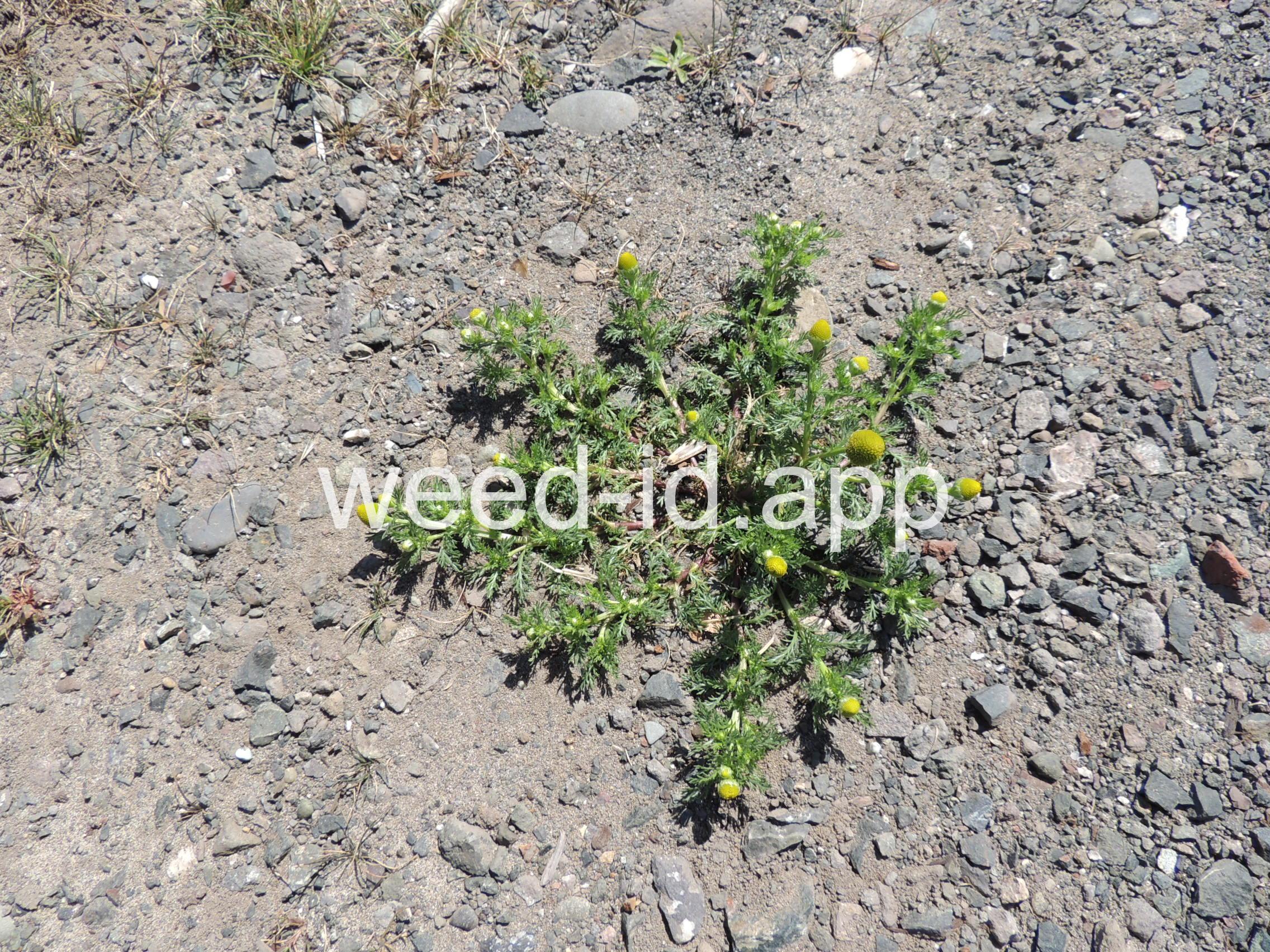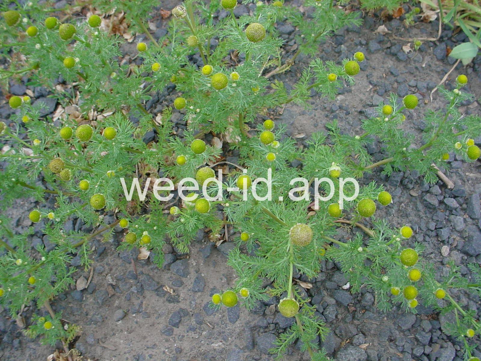 This low growing annual is often confused with mayweed (Anthemis cotula) but can easily be distinguished by its pleasant, sweet odor and lack of ray flowers. It is often found in compacted soils, such as paths and driveways, with prostrate knotweed.