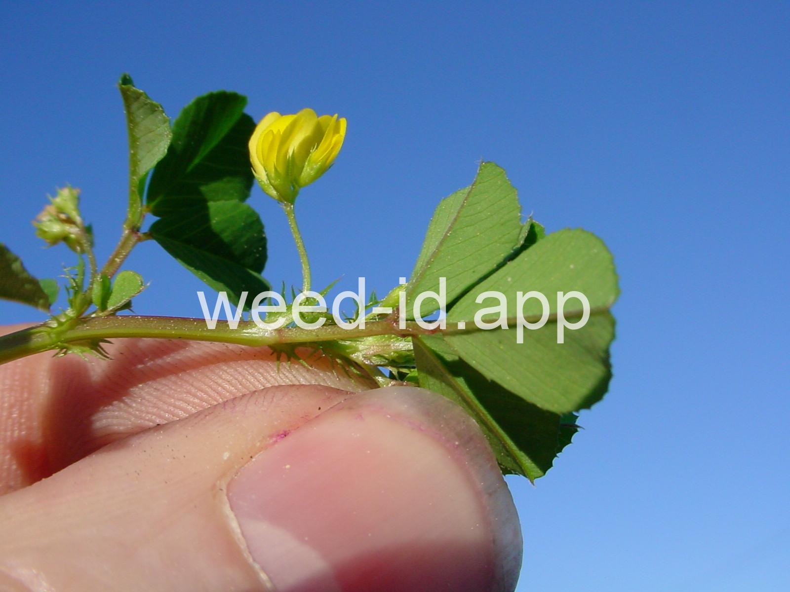 The trifoliate leaves are often distinctly notched at the tips and arise from a long petiole. The small, yellow flowers appear in clusters of 2-5 on the ends of long, naked stems. At maturity the coiled pod forms a bur.