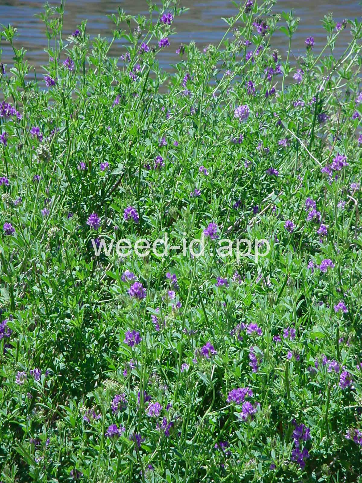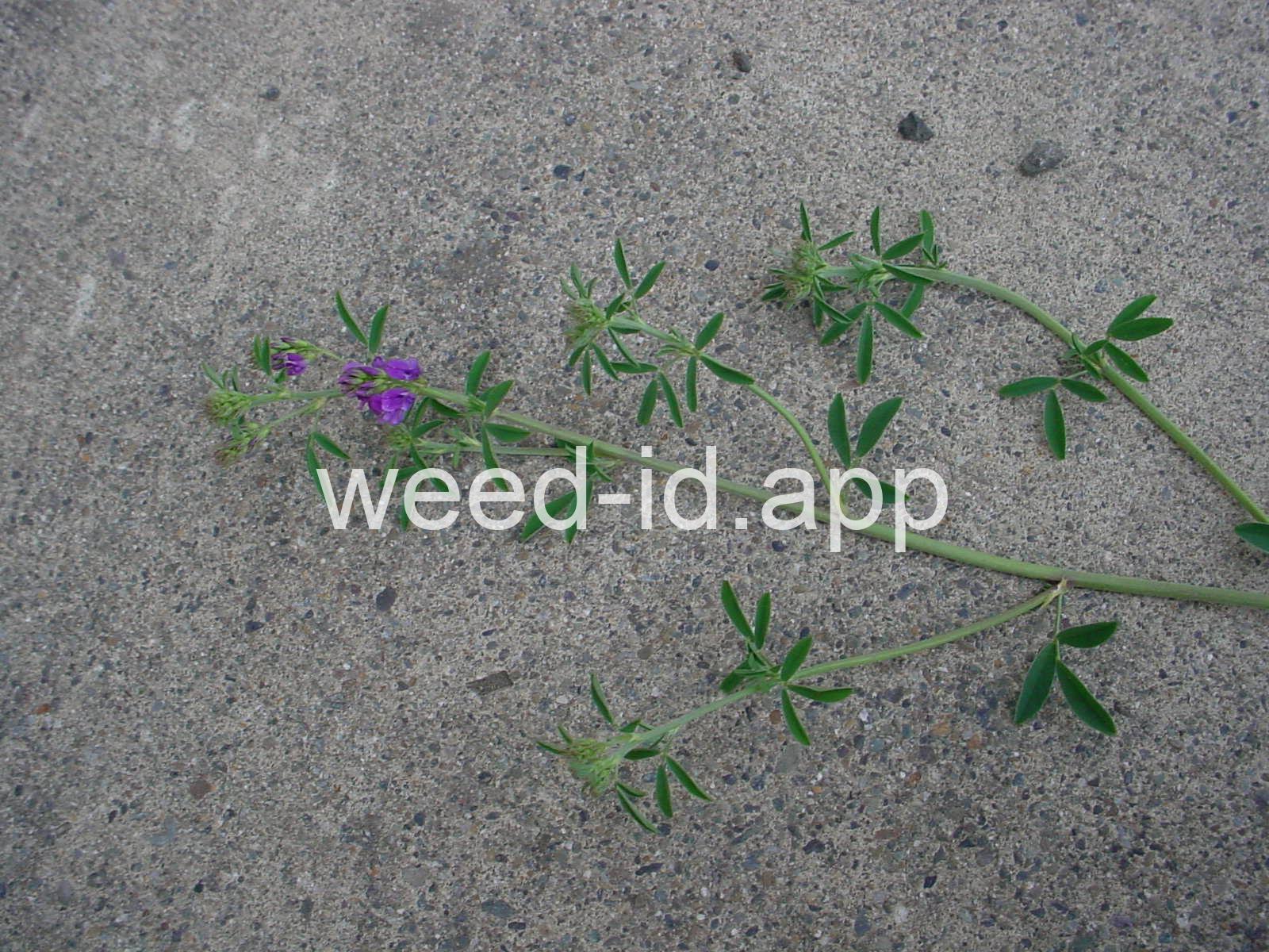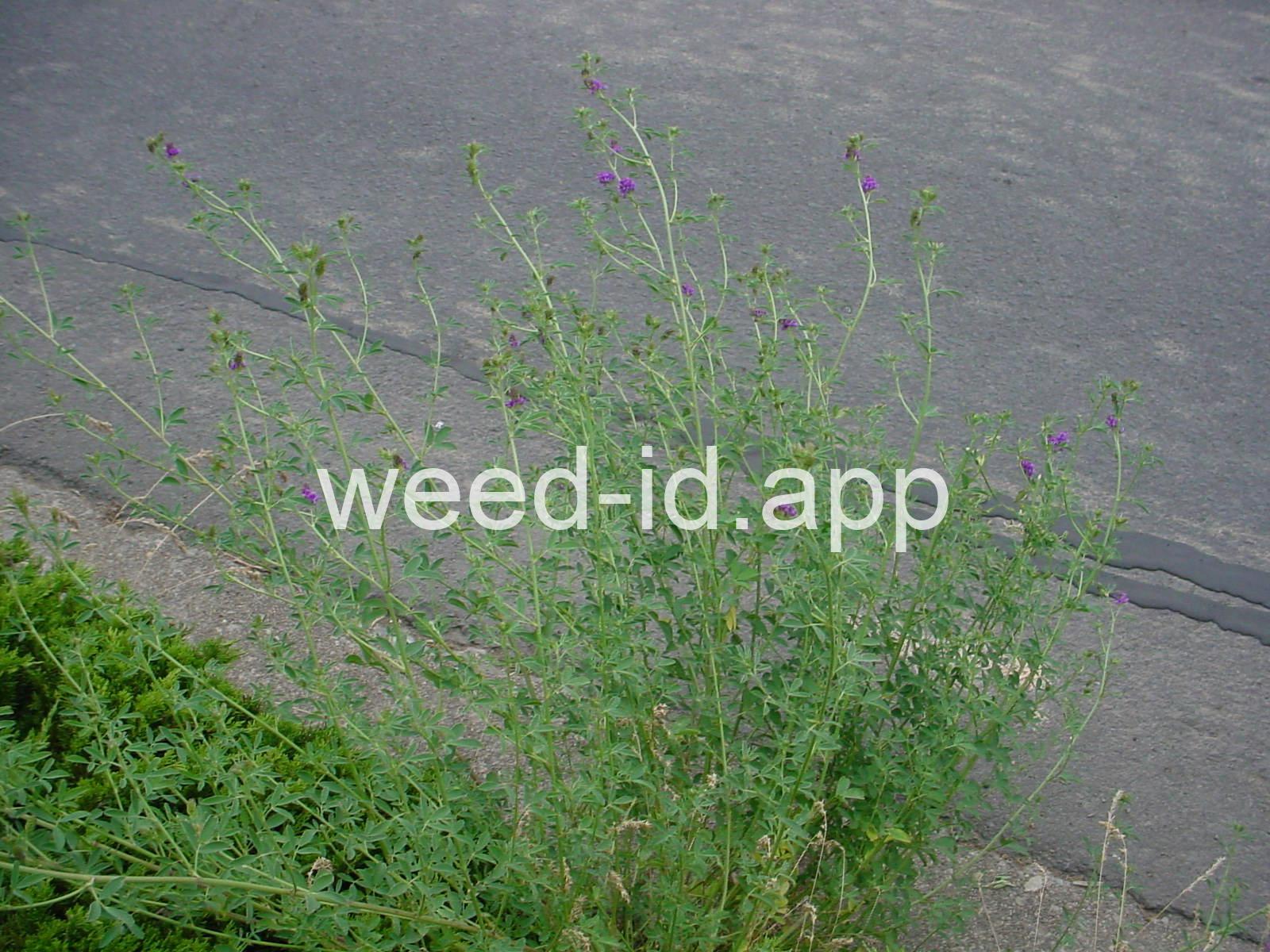 While most commonly known as a cultivated crop, alfalfa also can be very weedy in disturbed habitats. The flowers are commonly blue-purple but can also be various combinations of blue, yellow, and white. Look for the coiled pod on last year`s growth for positive identification. Medicago falcata = Medicago sativa var. falcata