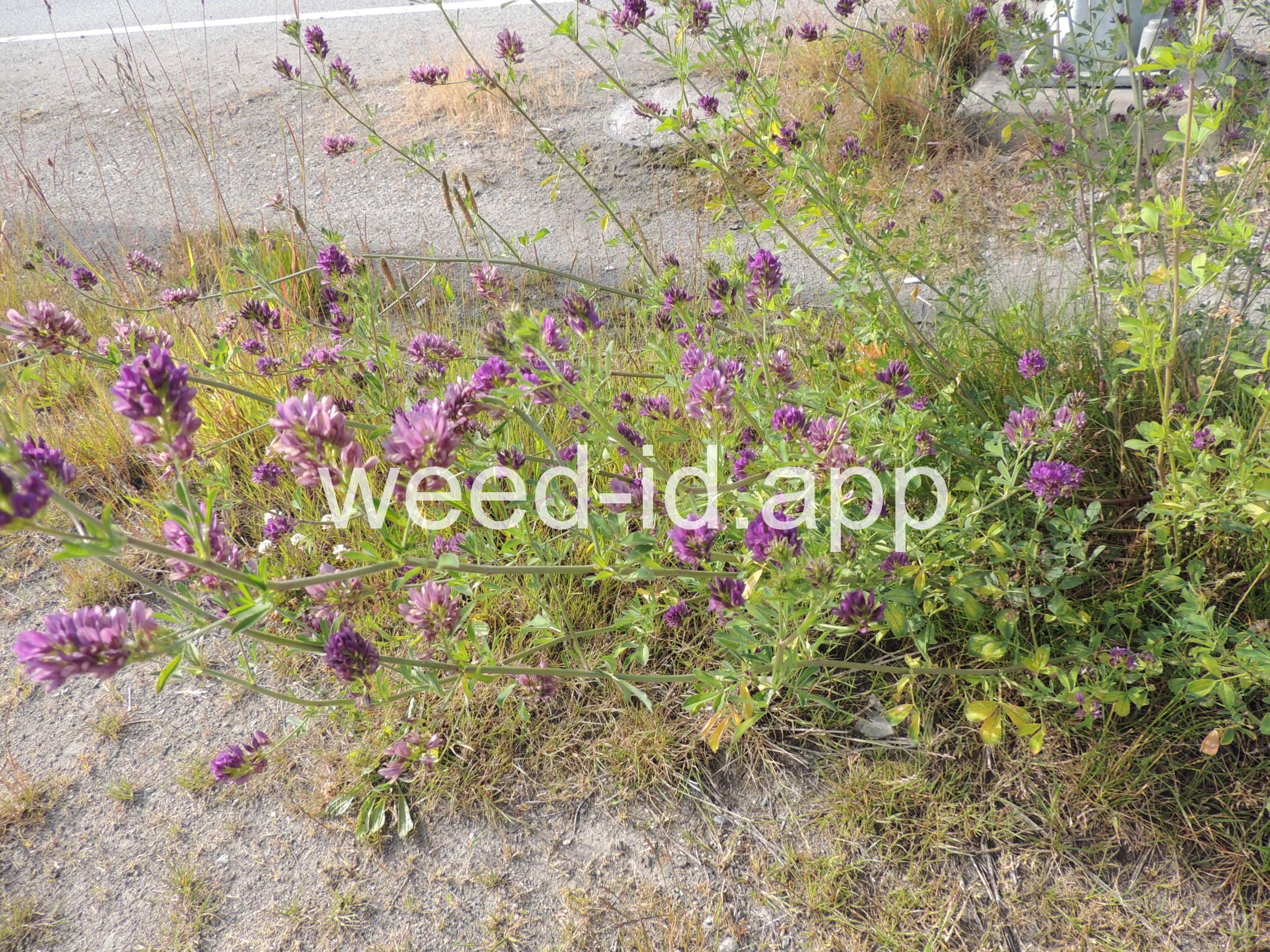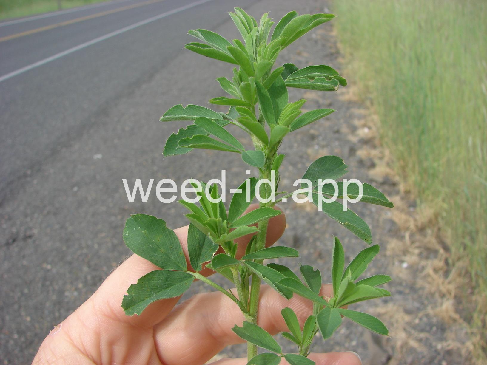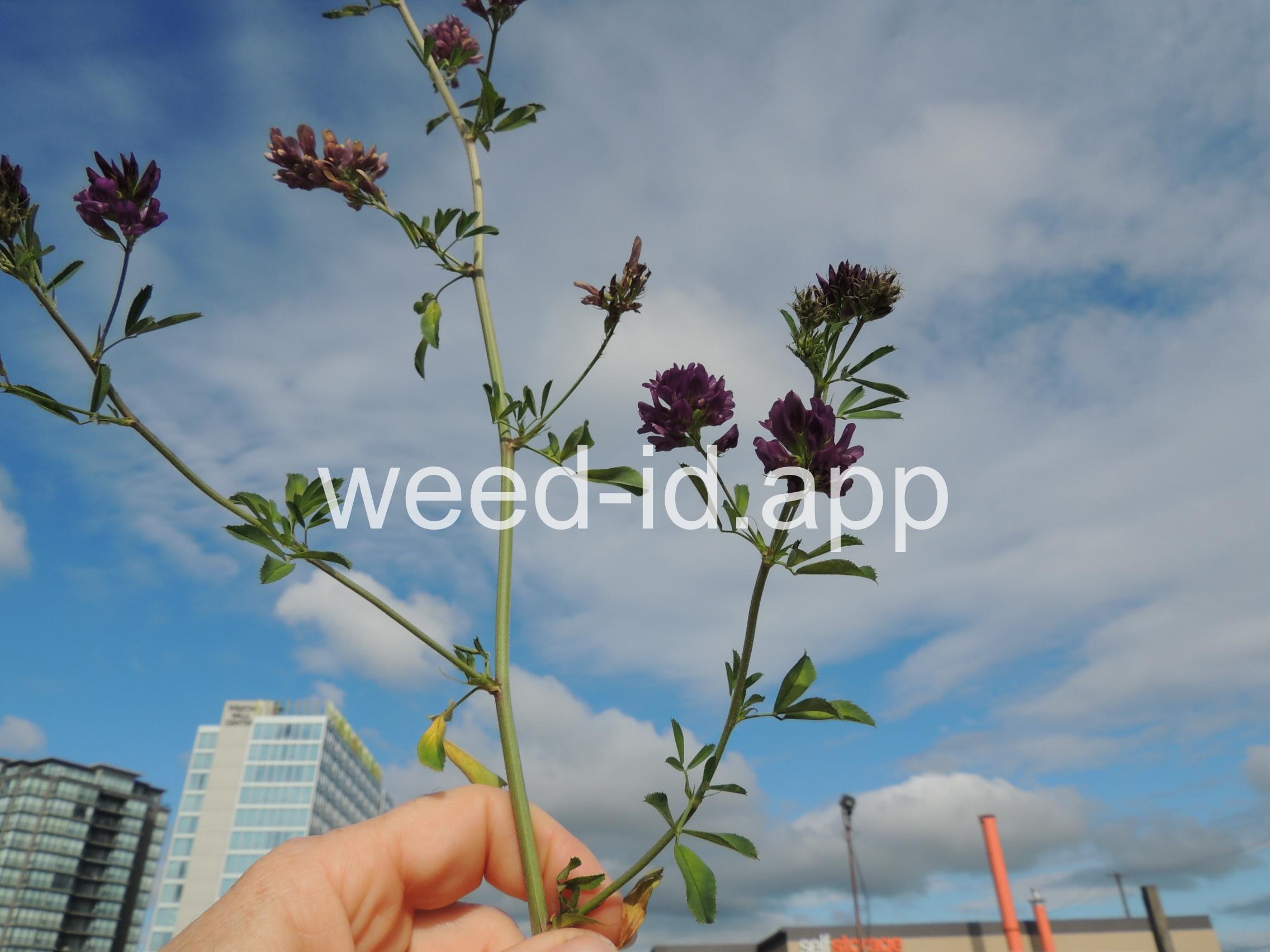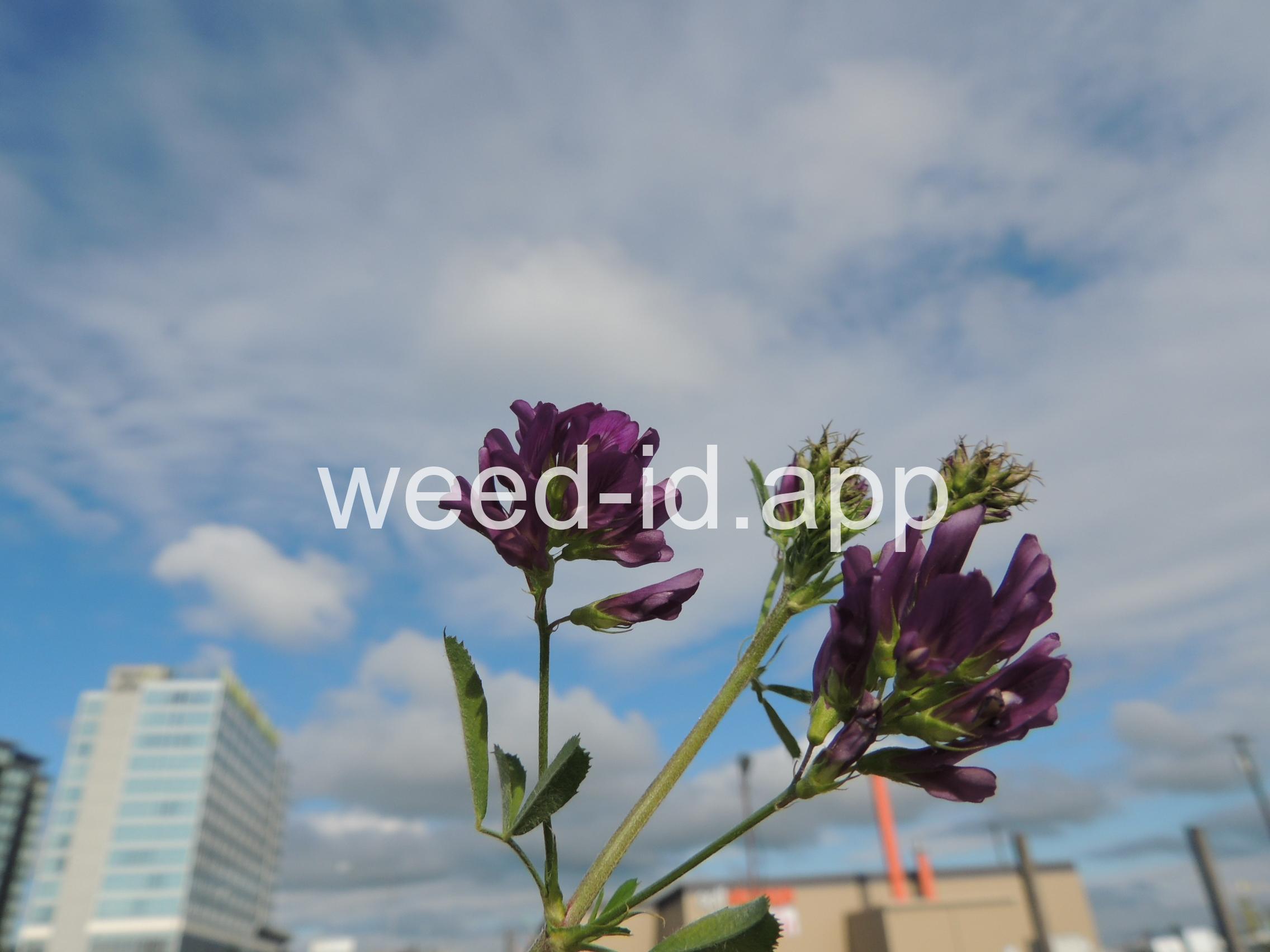 While most commonly known as a cultivated crop, alfalfa also can be very weedy in disturbed habitats. The flowers are commonly blue-purple but can also be various combinations of blue, yellow, and white. Look for the coiled pod on last year`s growth for positive identification. Medicago falcata = Medicago sativa var. falcata