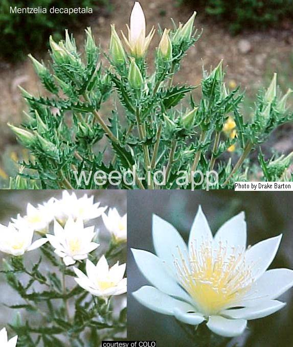 Similar to Mentzelia nuda but with the petals 5-7 cm long and creamy colored. Nebraska Weeds says tenpetal stickleaf prefers sandy soils, but Flora of the Great Plains says it seldom occurs on sandy soils. Note the velcro-like hair typical of the genus.