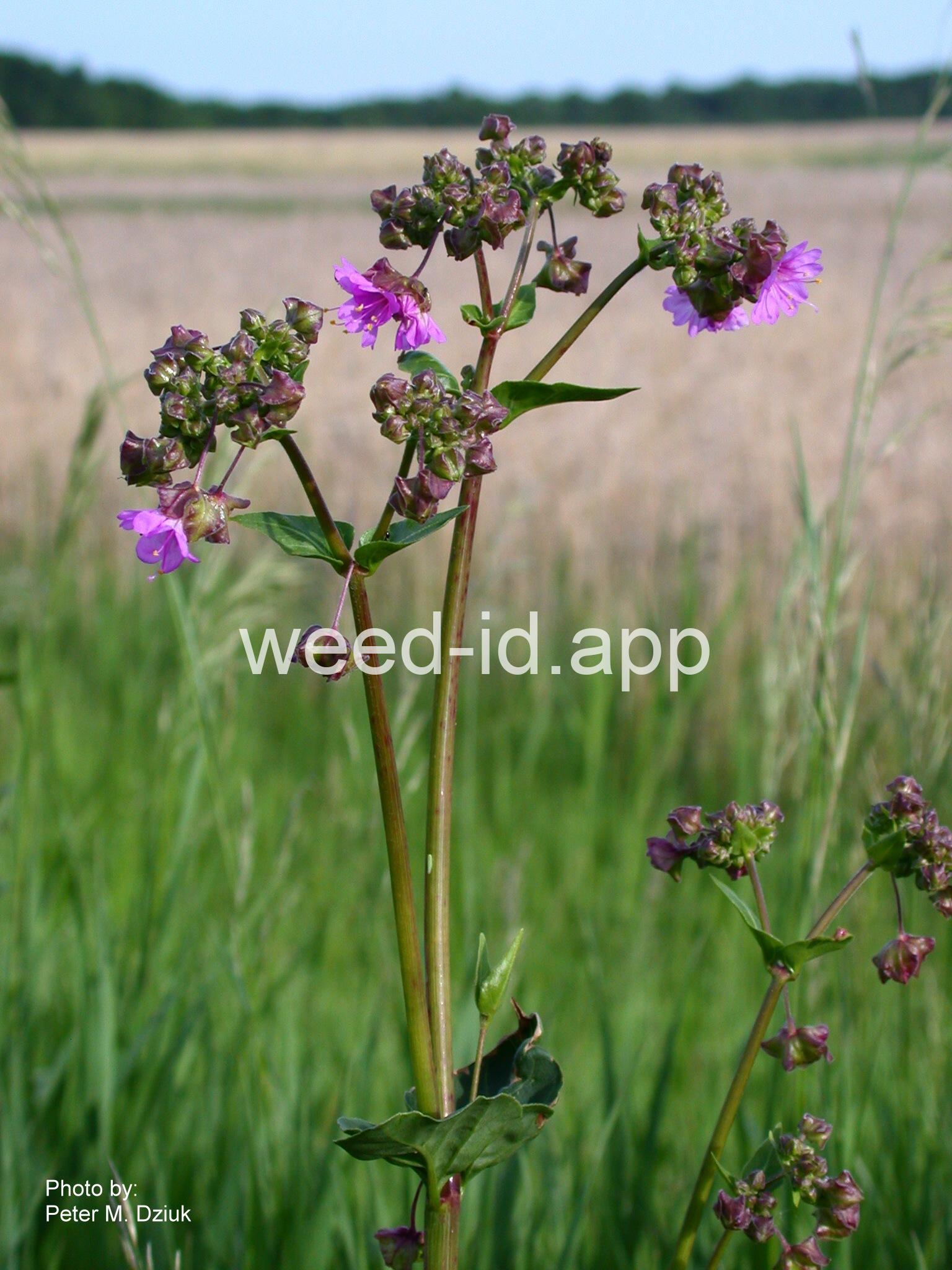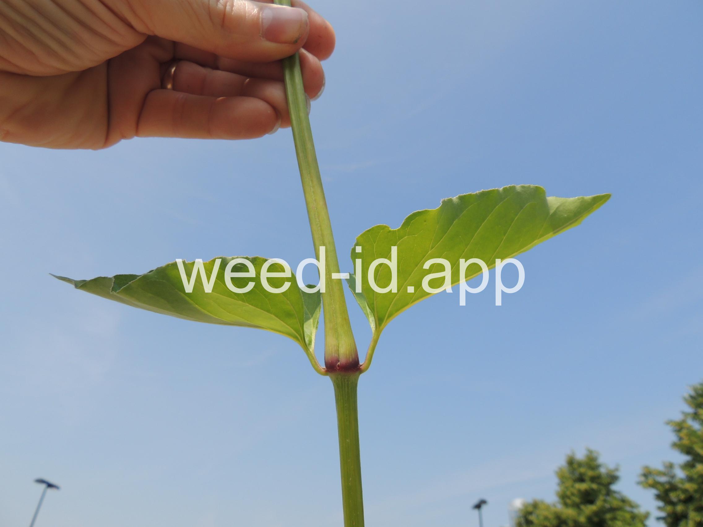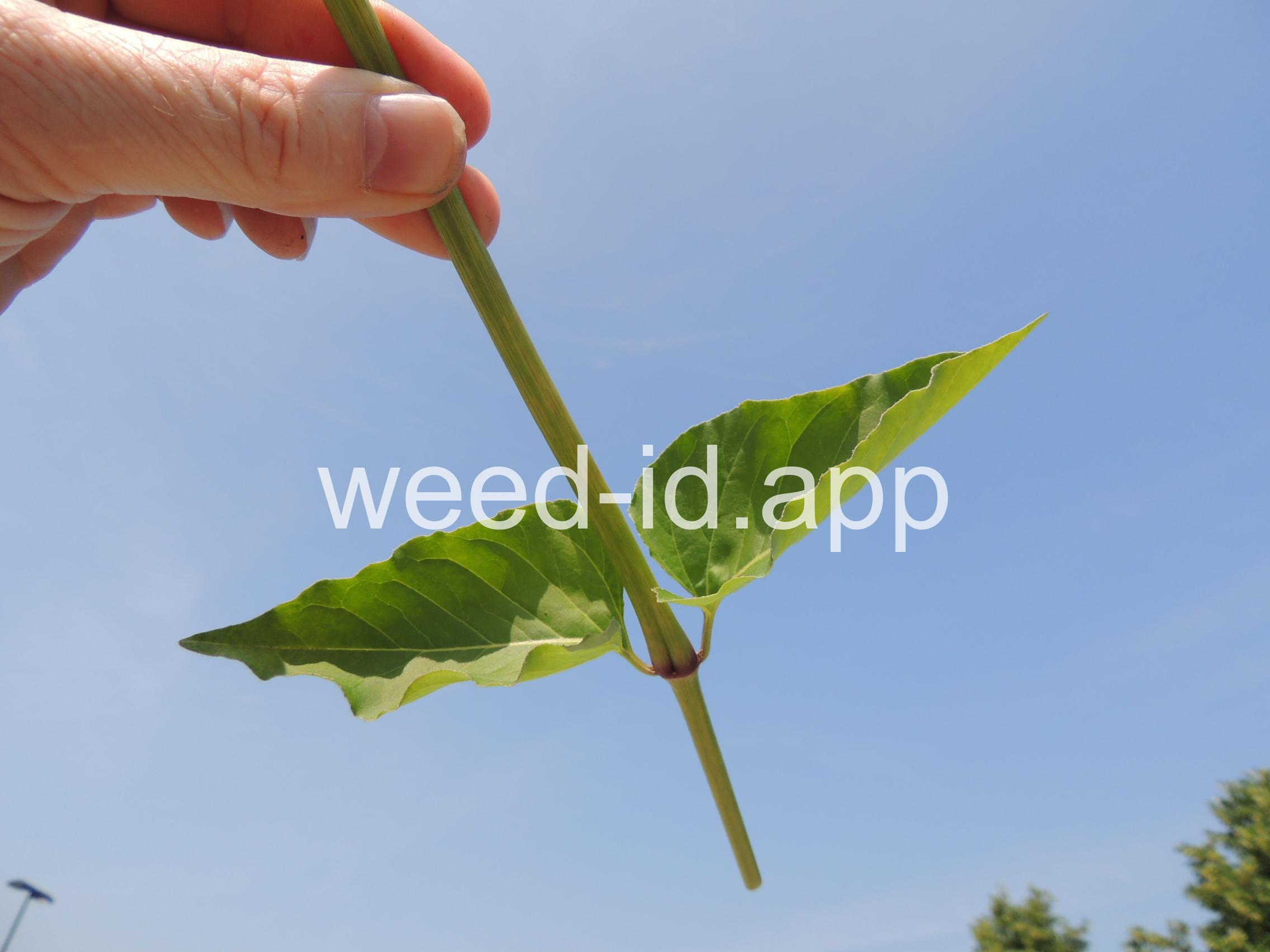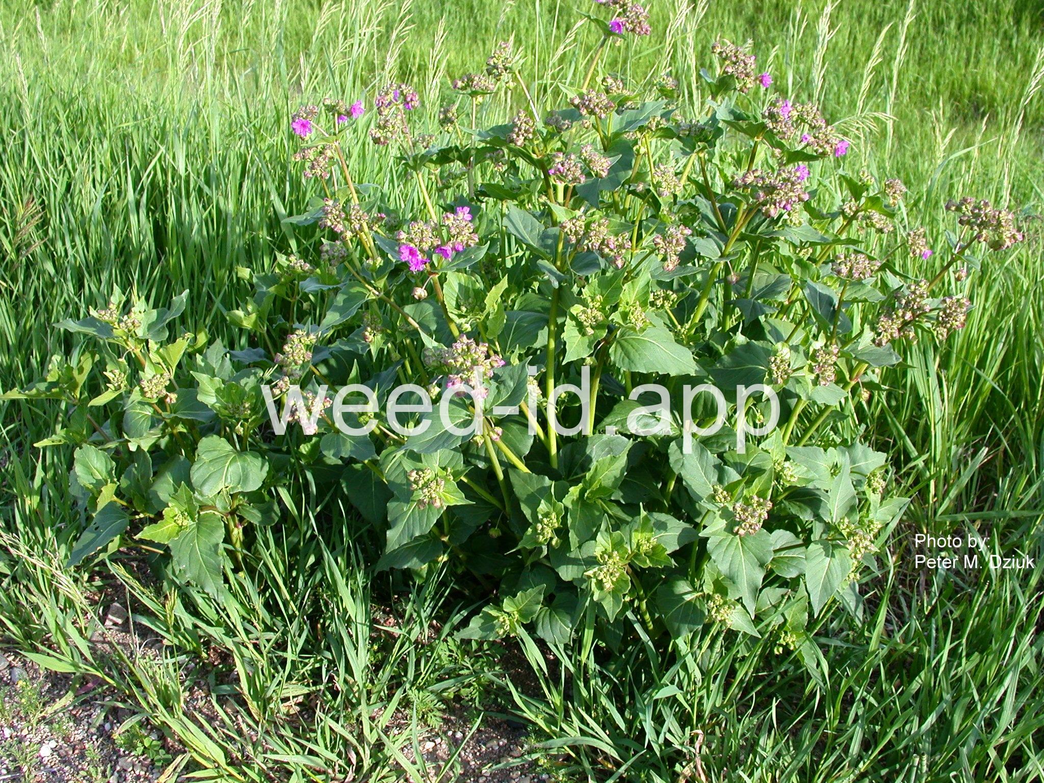 Stems swollen at the nodes of the large, somewhat heart-shaped, opposite leaves. The flowers are a psychedelic pink-purple, subtended by a large membranous bract.