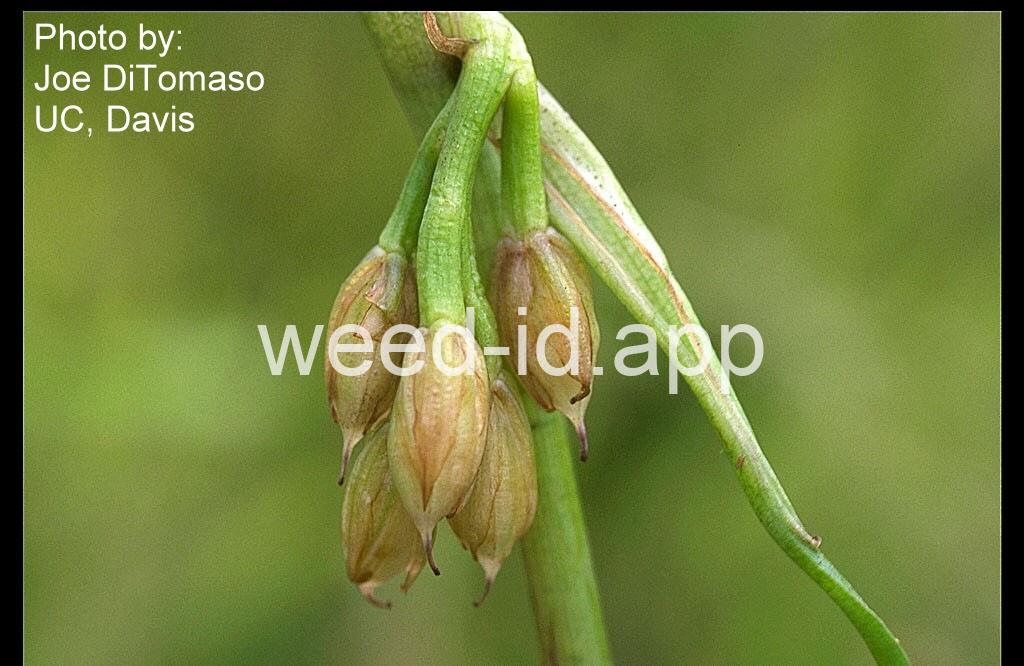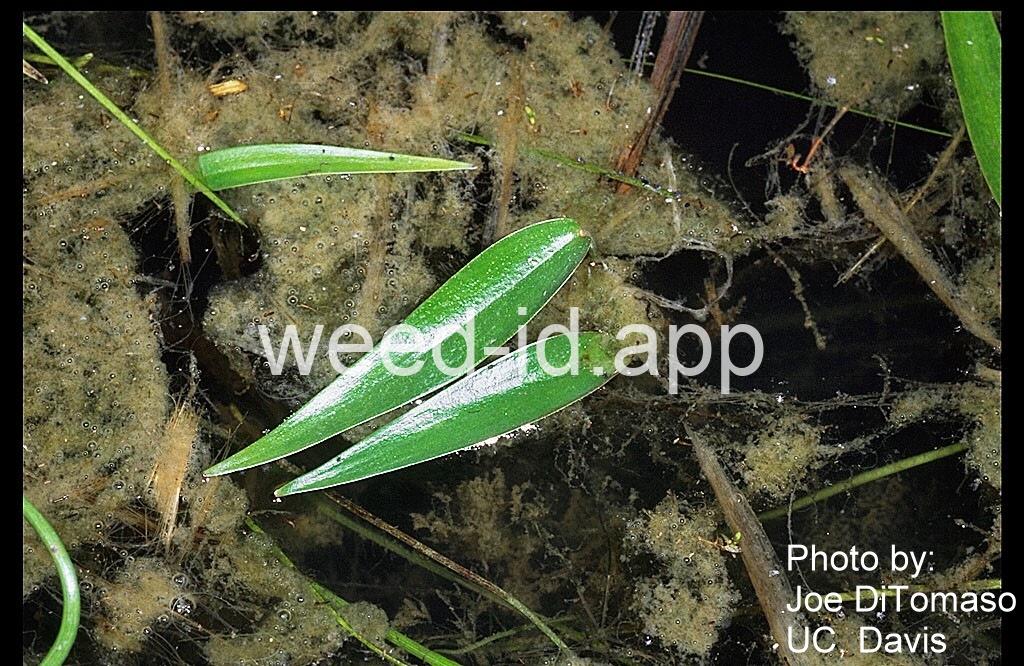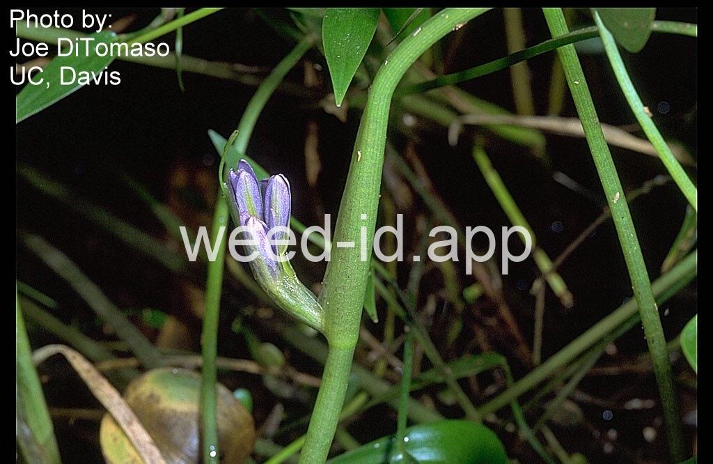 The leaf shape of this species varies with maturity and water depth thus making it difficult to identify the plants unless they are in flower. The flowers are blue to purple and occur in clusters which emerge from the sheath of the uppermost leaf. Each flower has six petals and six stamens with one stamen much longer than the other five.