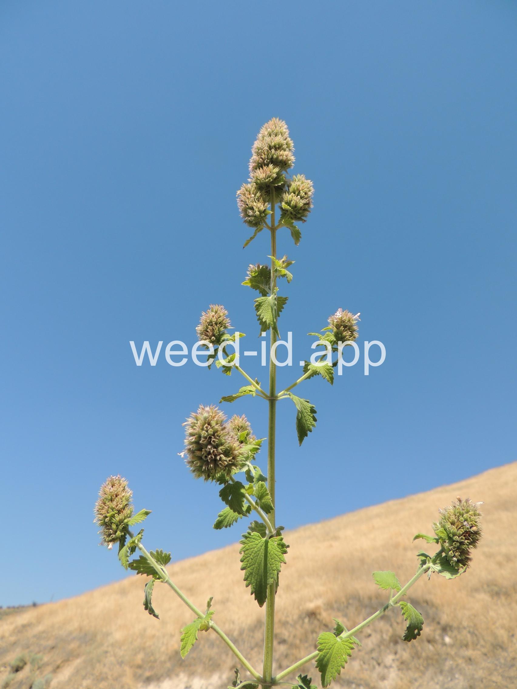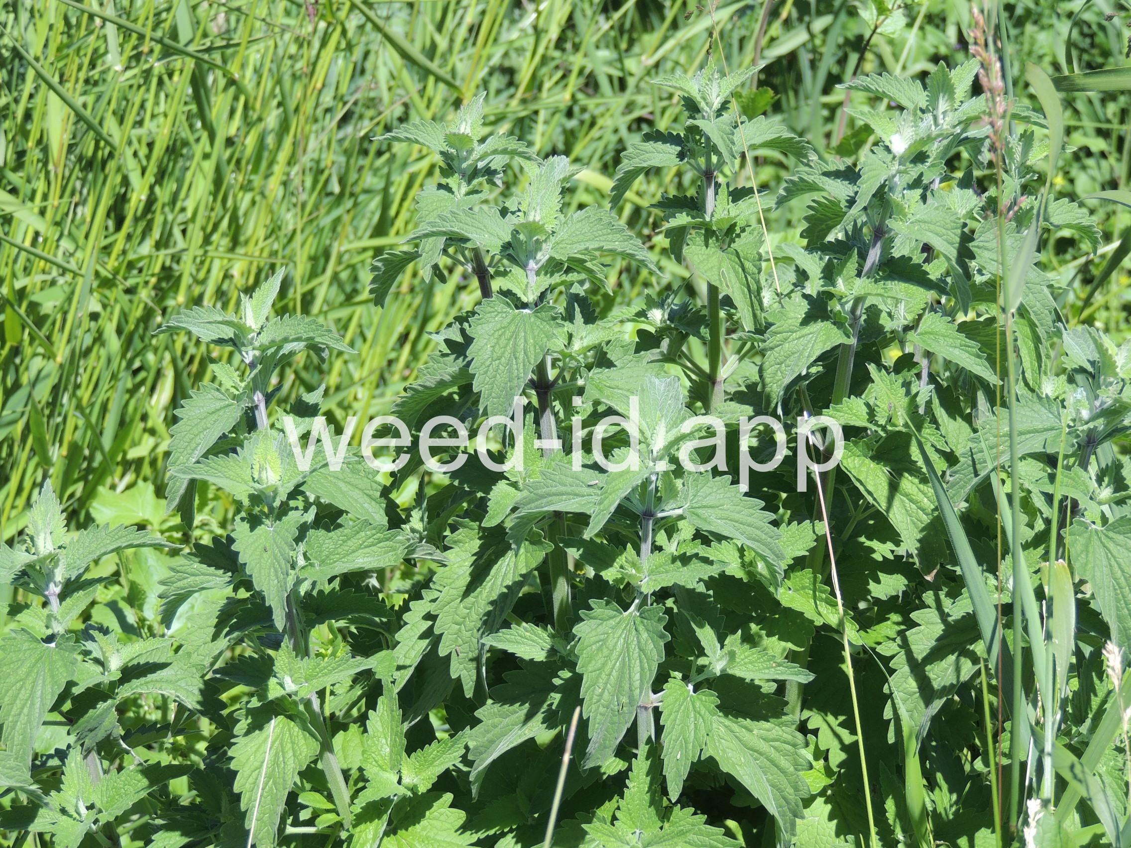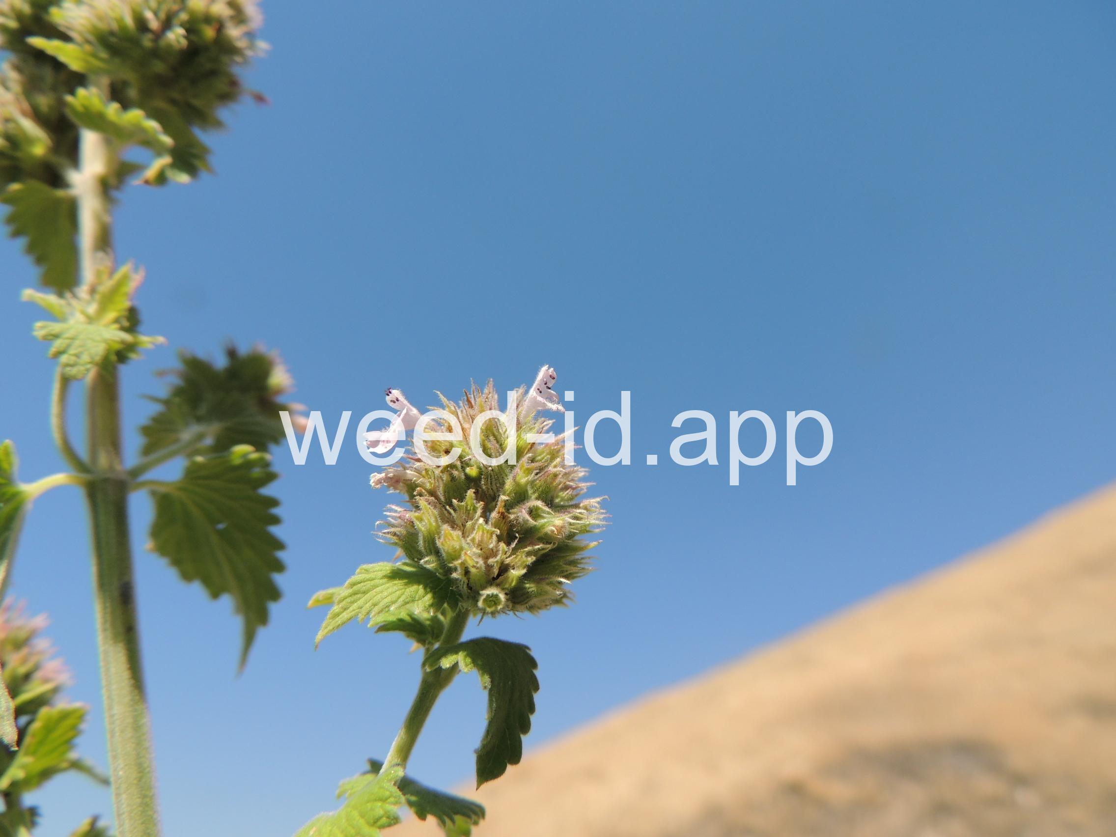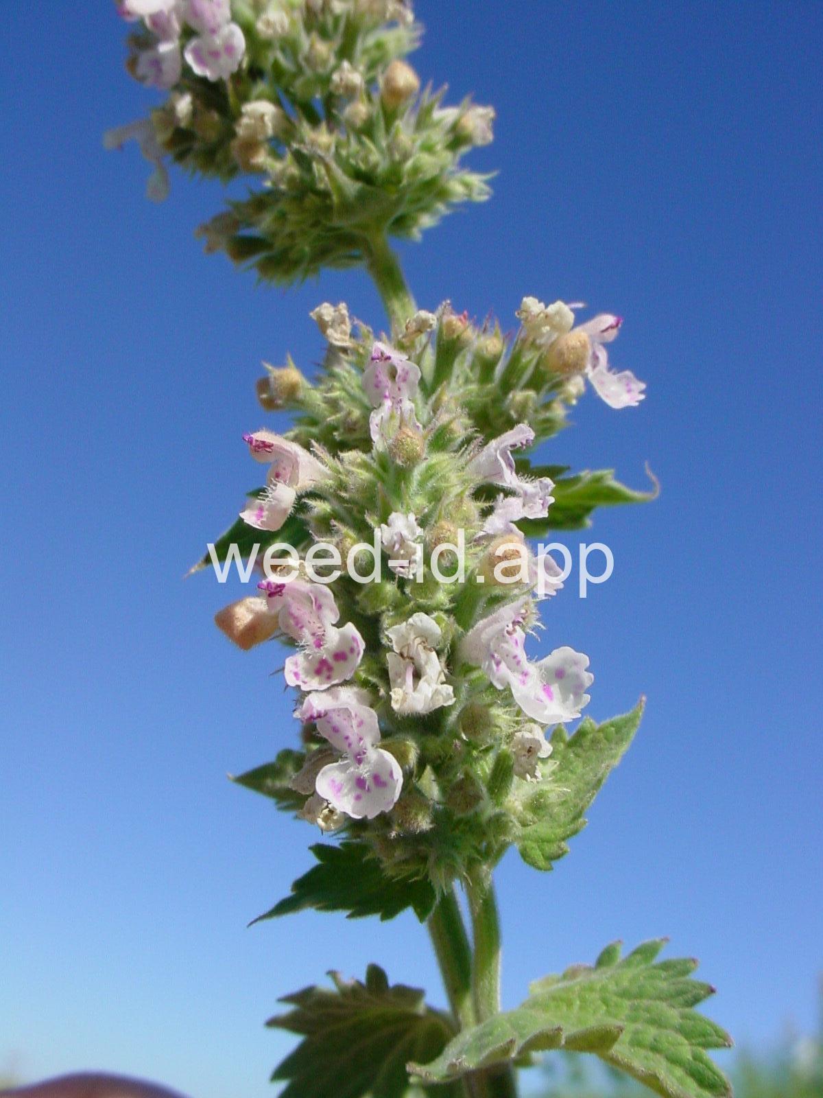 An aromatic perennial with leaves very similar in shape to those of stinging nettle. The volatile compounds of this plant have a strange, drug-like effect on members of the cat family. It is occasionally grown as a crop which is sold for tea or for stuffing cat toys. Note the prominent square stem typical of the mint family.