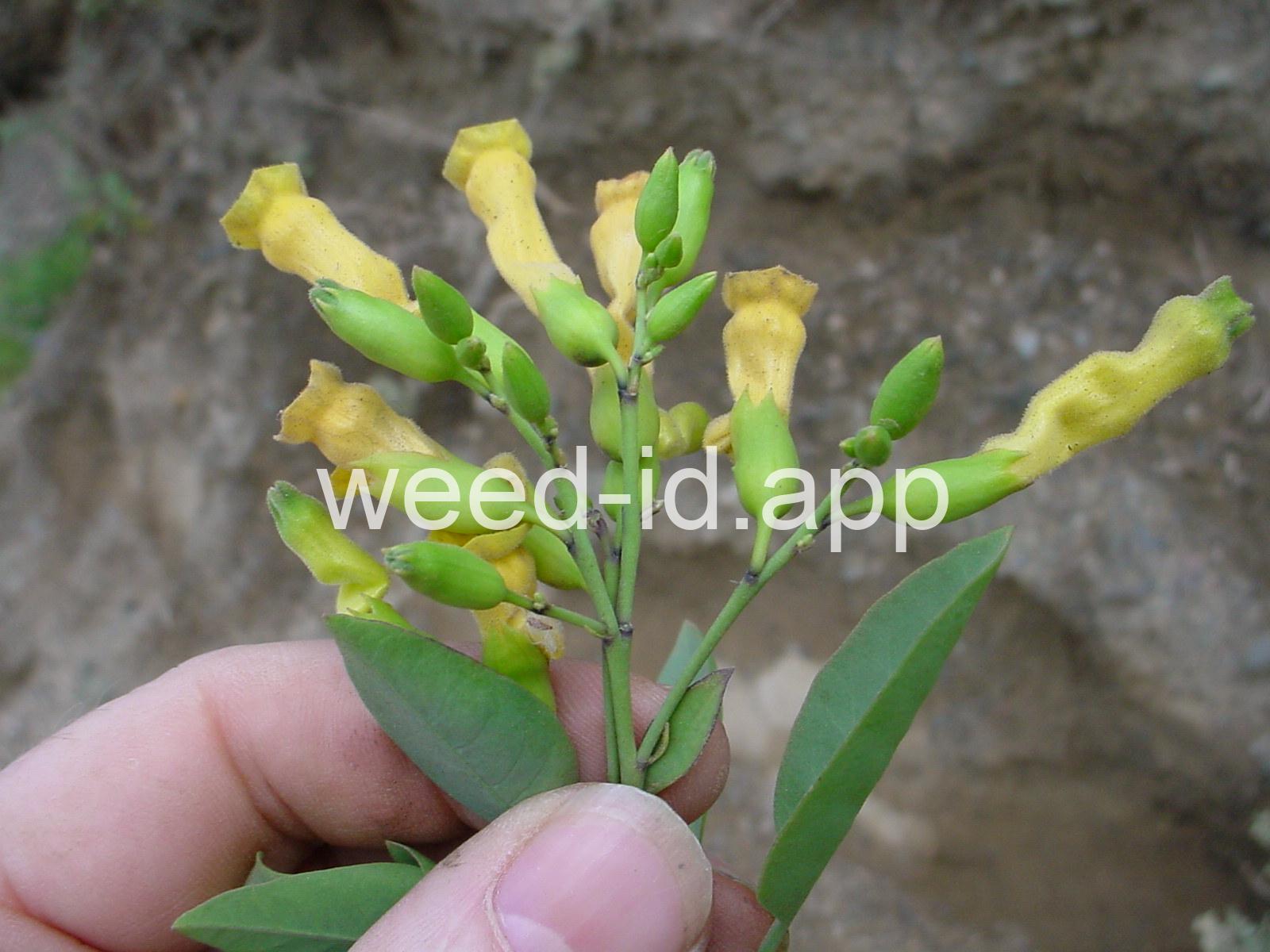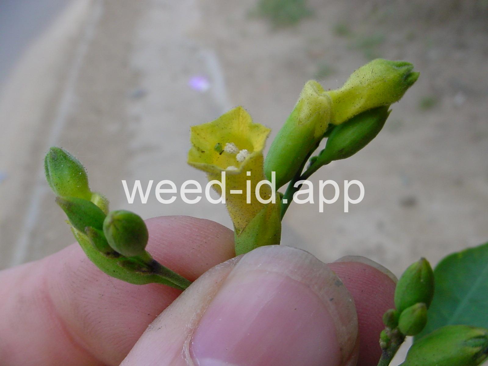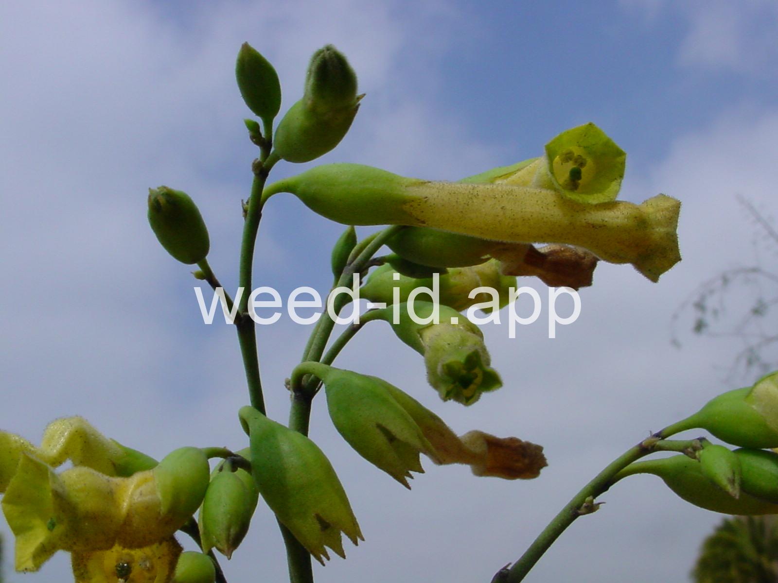 A small tree with hairless, egg-shaped leaves and narrow, tubular, yellow-green flowers. This species was imported from South America. The leaves and young shoots are toxic to all classes of livestock.