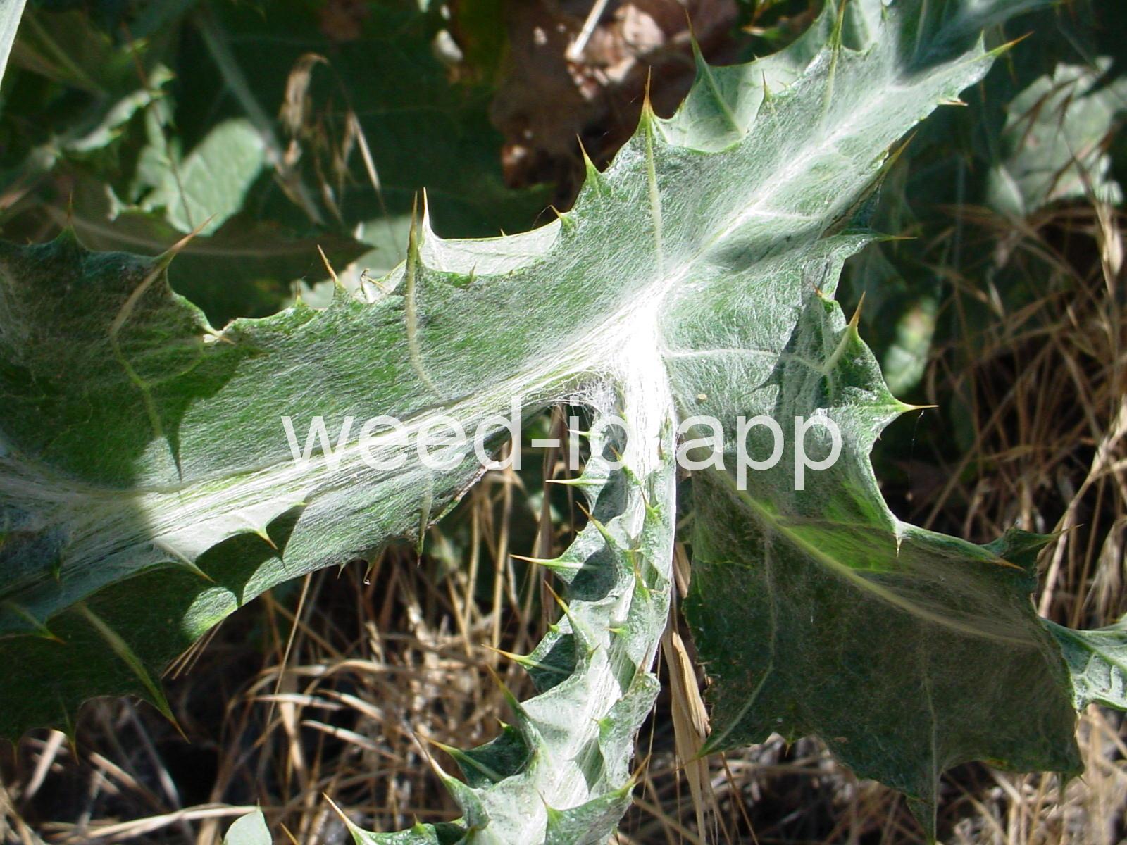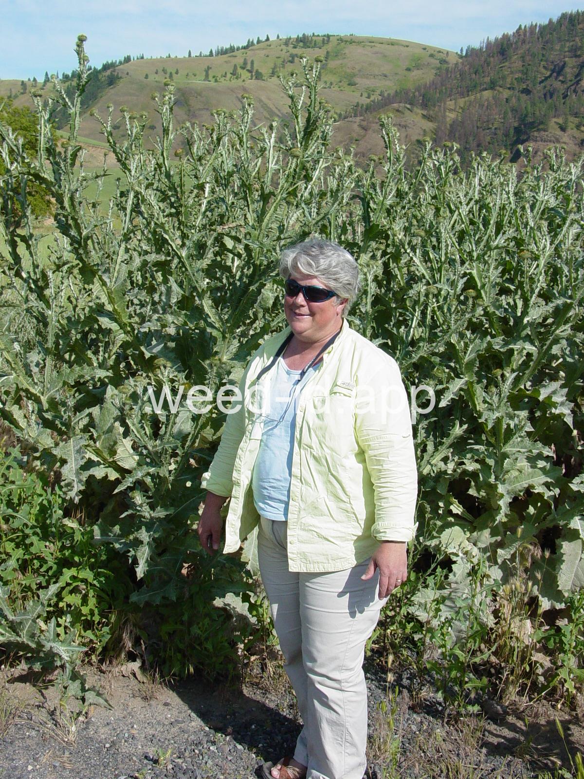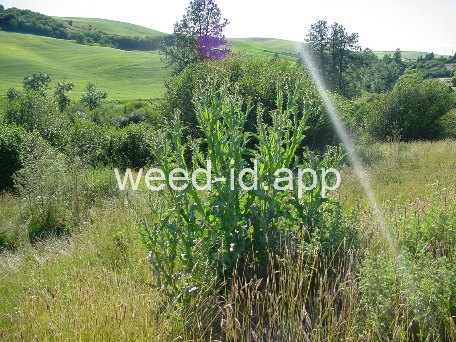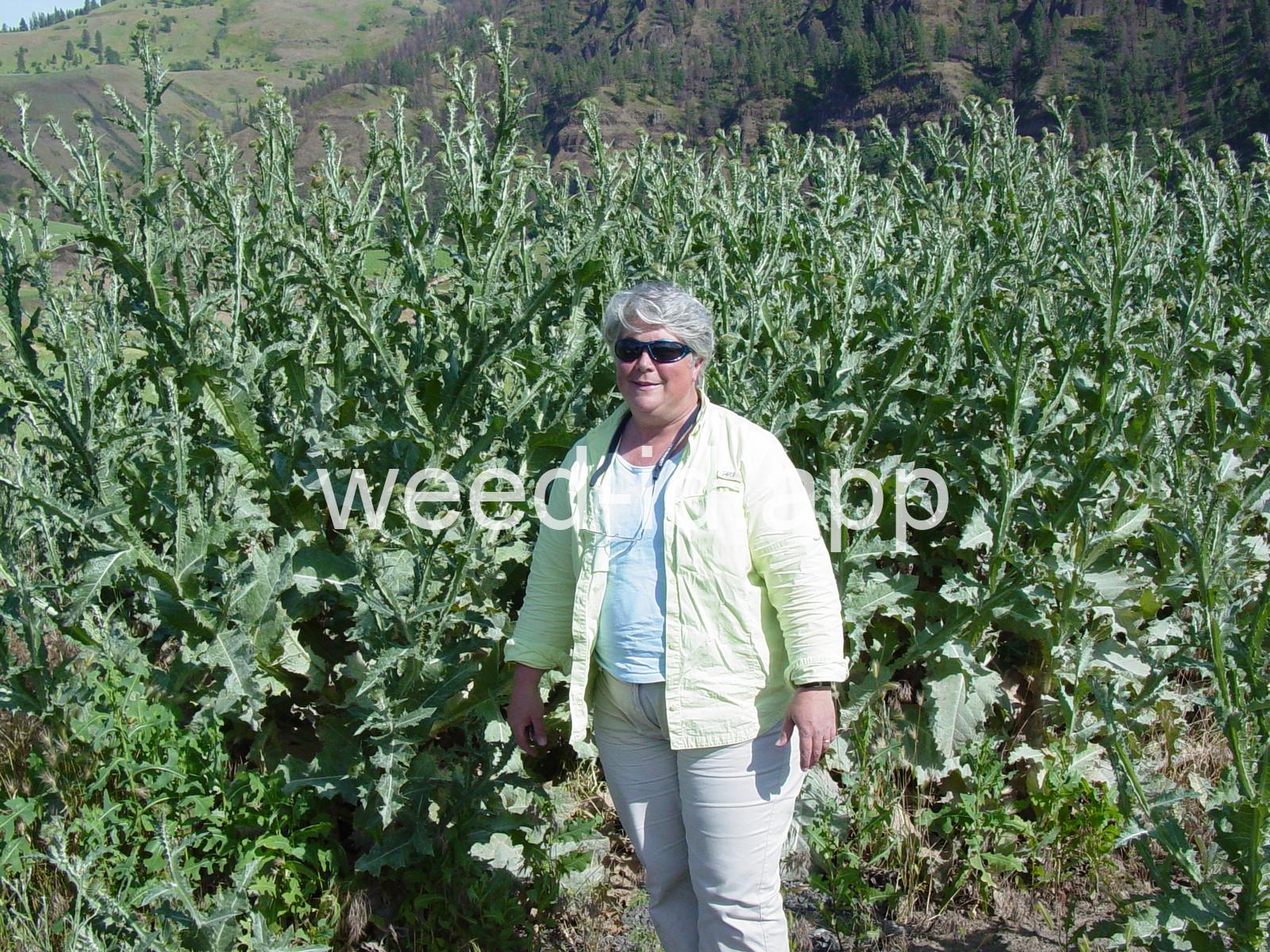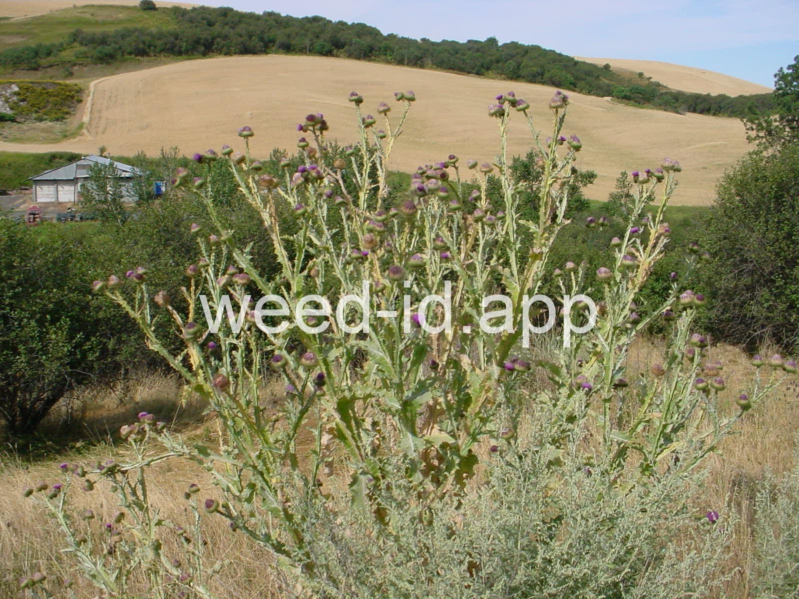 The scientific name comes from the Latin `onos` for donkey and refers to the supposed effect of causing flatulence in donkeys. (Make up your own common name!) An enormous biennial with rosettes to 6 feet wide and plants 6-12 feet tall. The leaves and stems are covered with white, cobwebby to felty hairs, and the stems have prominent, spiny wings. This species can grow in a great variety of soils and sites. The photos on page 225 of the California Growers Guide are actually bull thistle (Cirsium vulgare); however, the text on the back seems to be accurate for Scotch thistle.