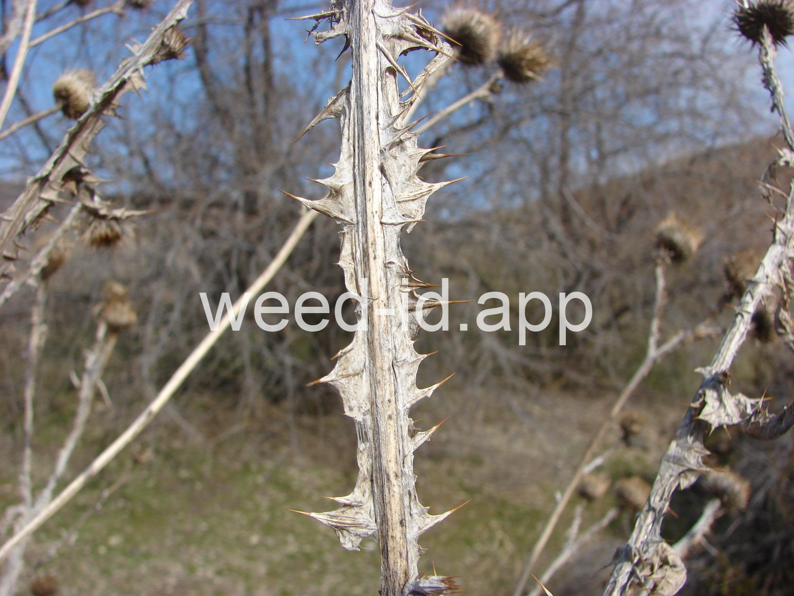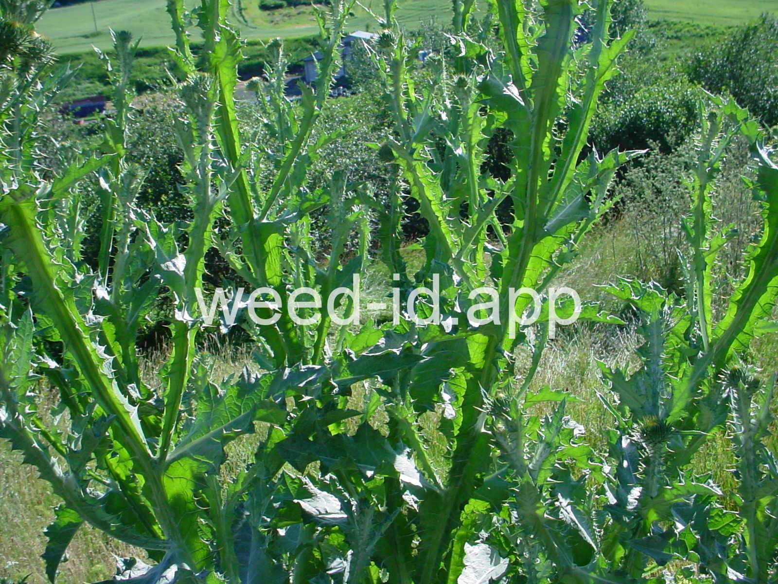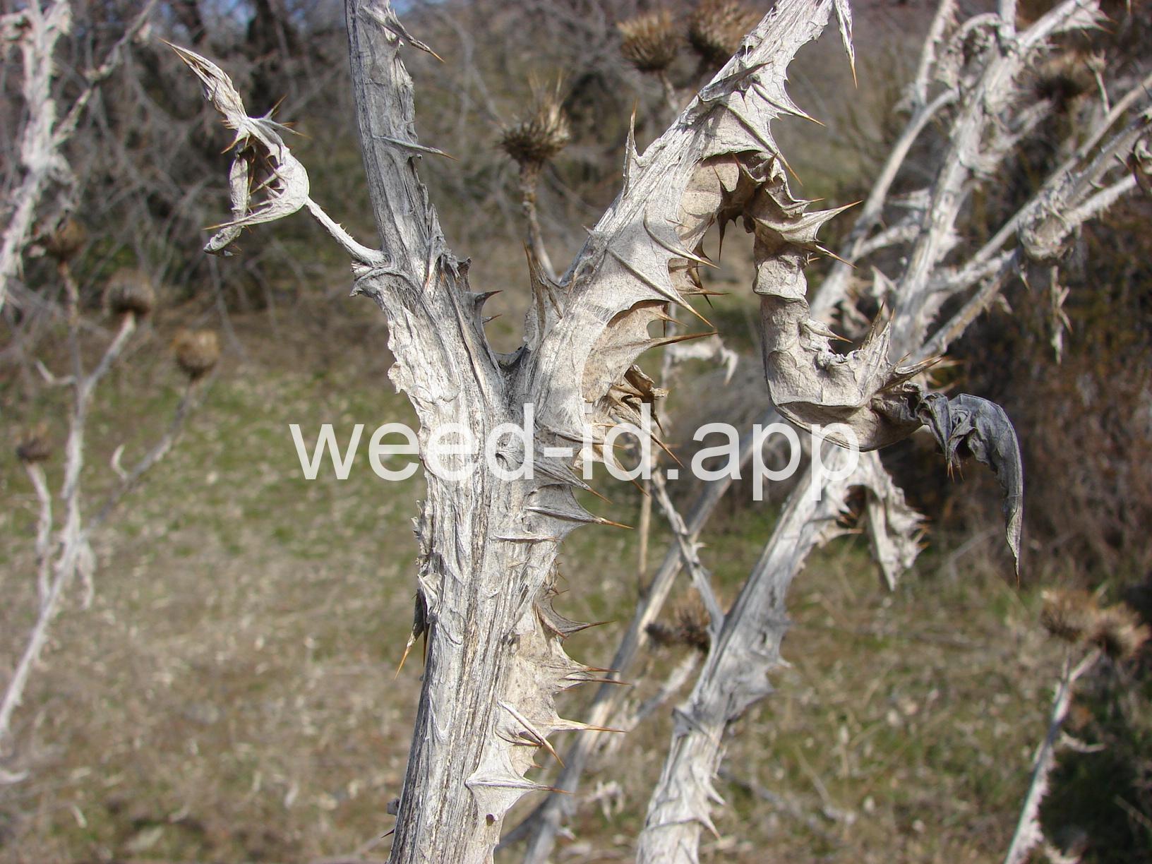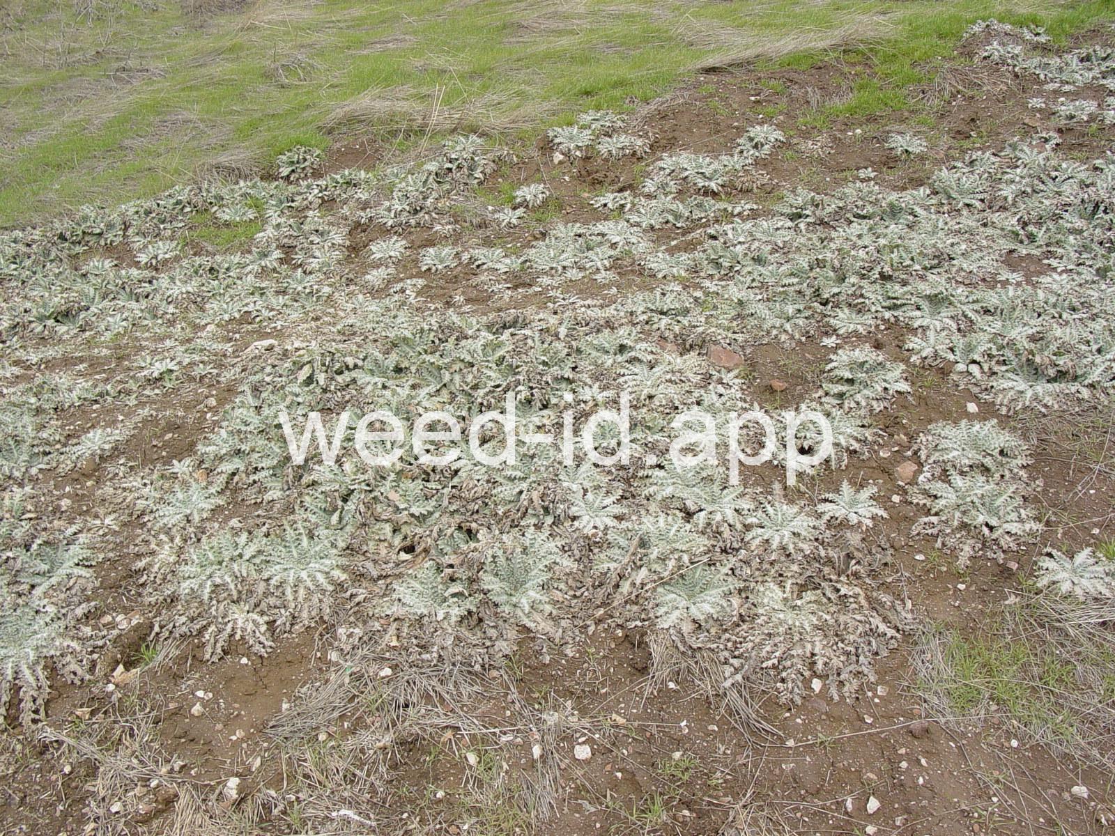 The scientific name comes from the Latin `onos` for donkey and refers to the supposed effect of causing flatulence in donkeys. (Make up your own common name!) An enormous biennial with rosettes to 6 feet wide and plants 6-12 feet tall. The leaves and stems are covered with white, cobwebby to felty hairs, and the stems have prominent, spiny wings. This species can grow in a great variety of soils and sites. The photos on page 225 of the California Growers Guide are actually bull thistle (Cirsium vulgare); however, the text on the back seems to be accurate for Scotch thistle.