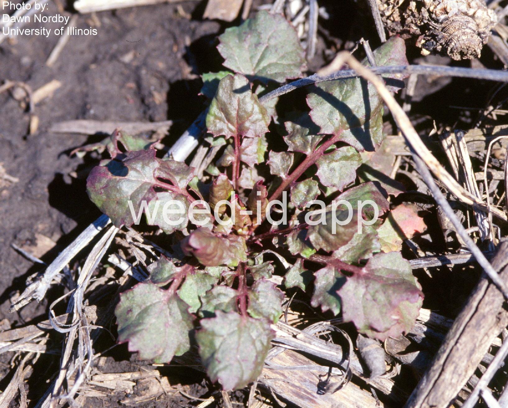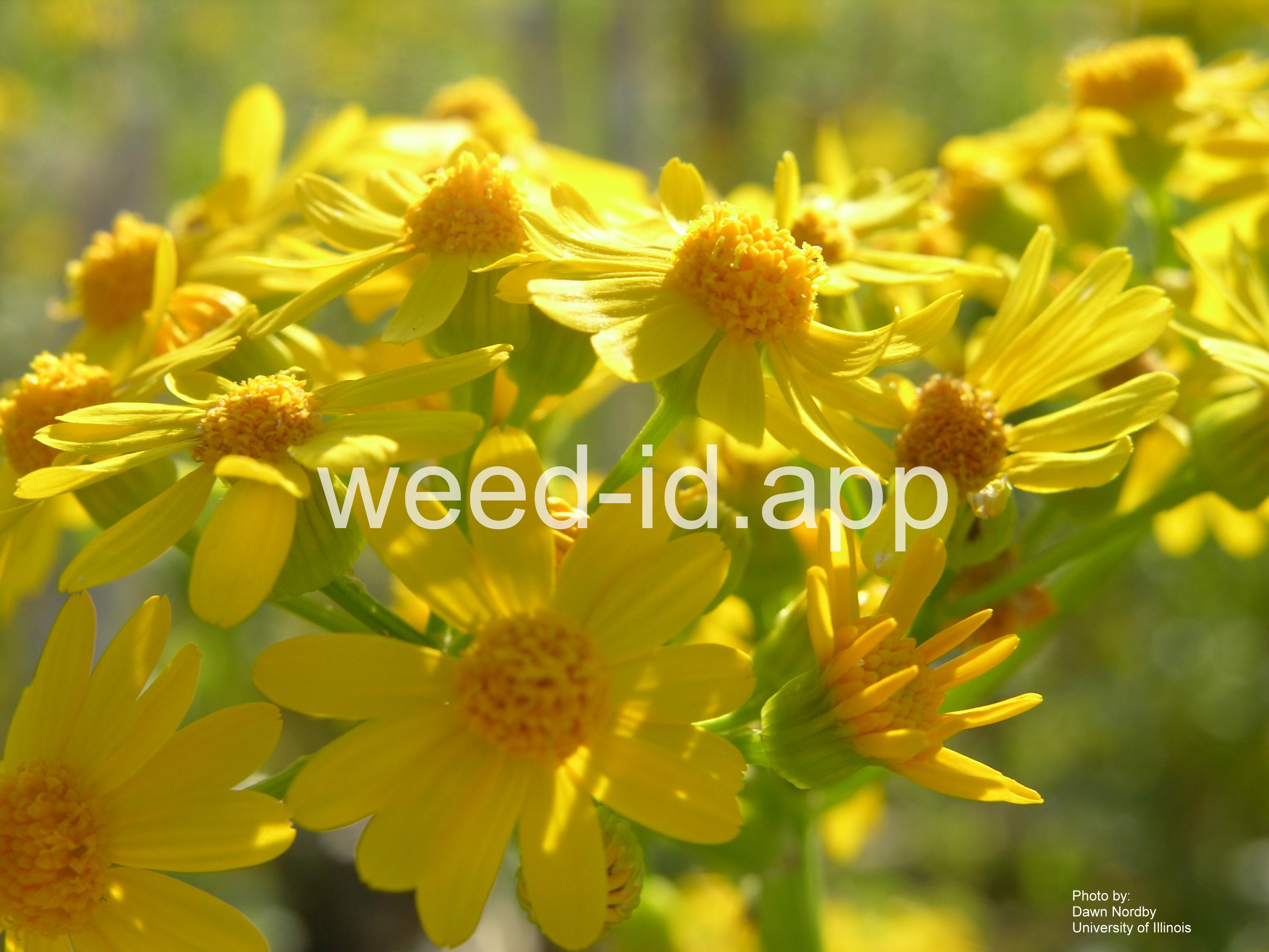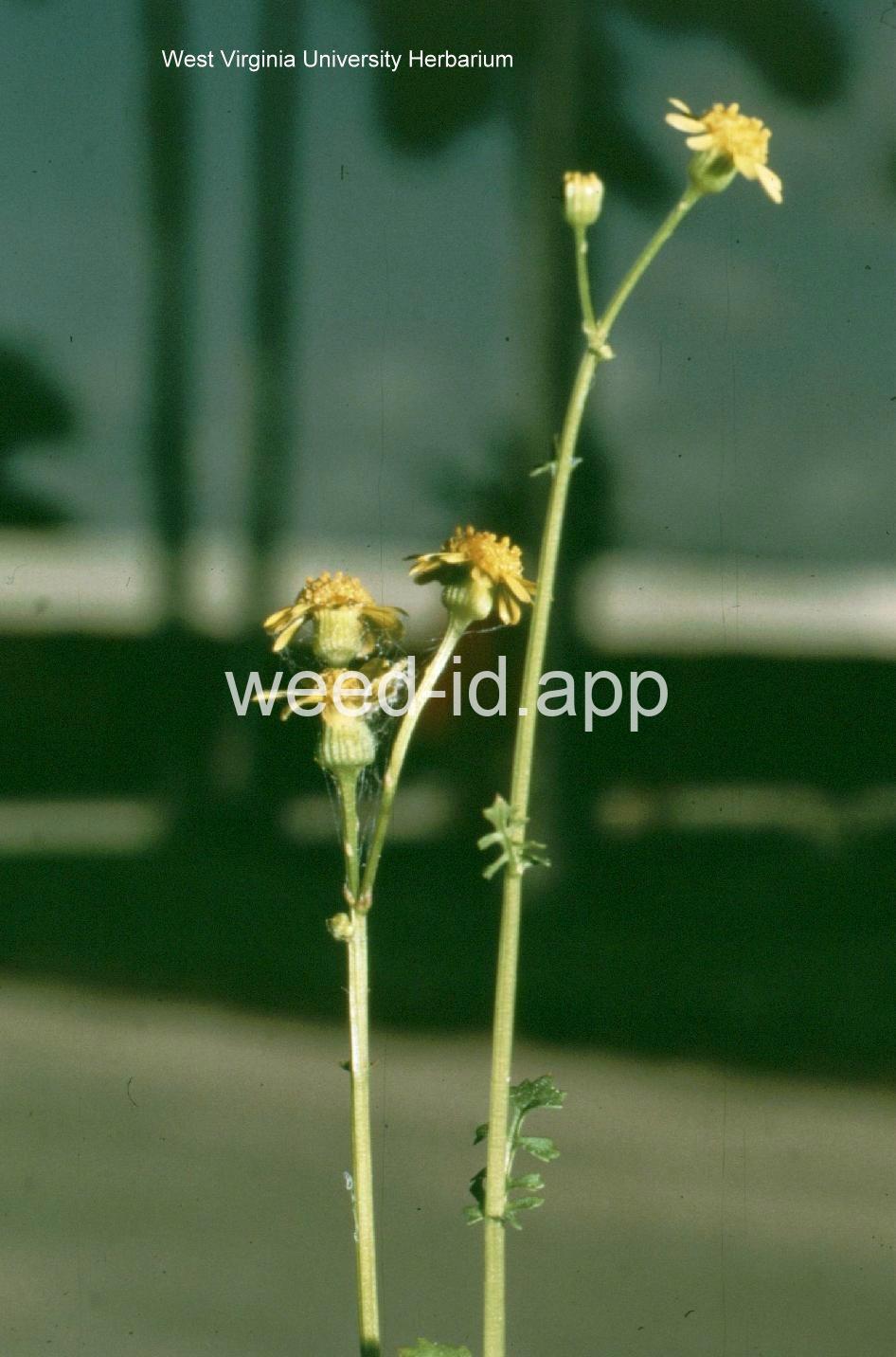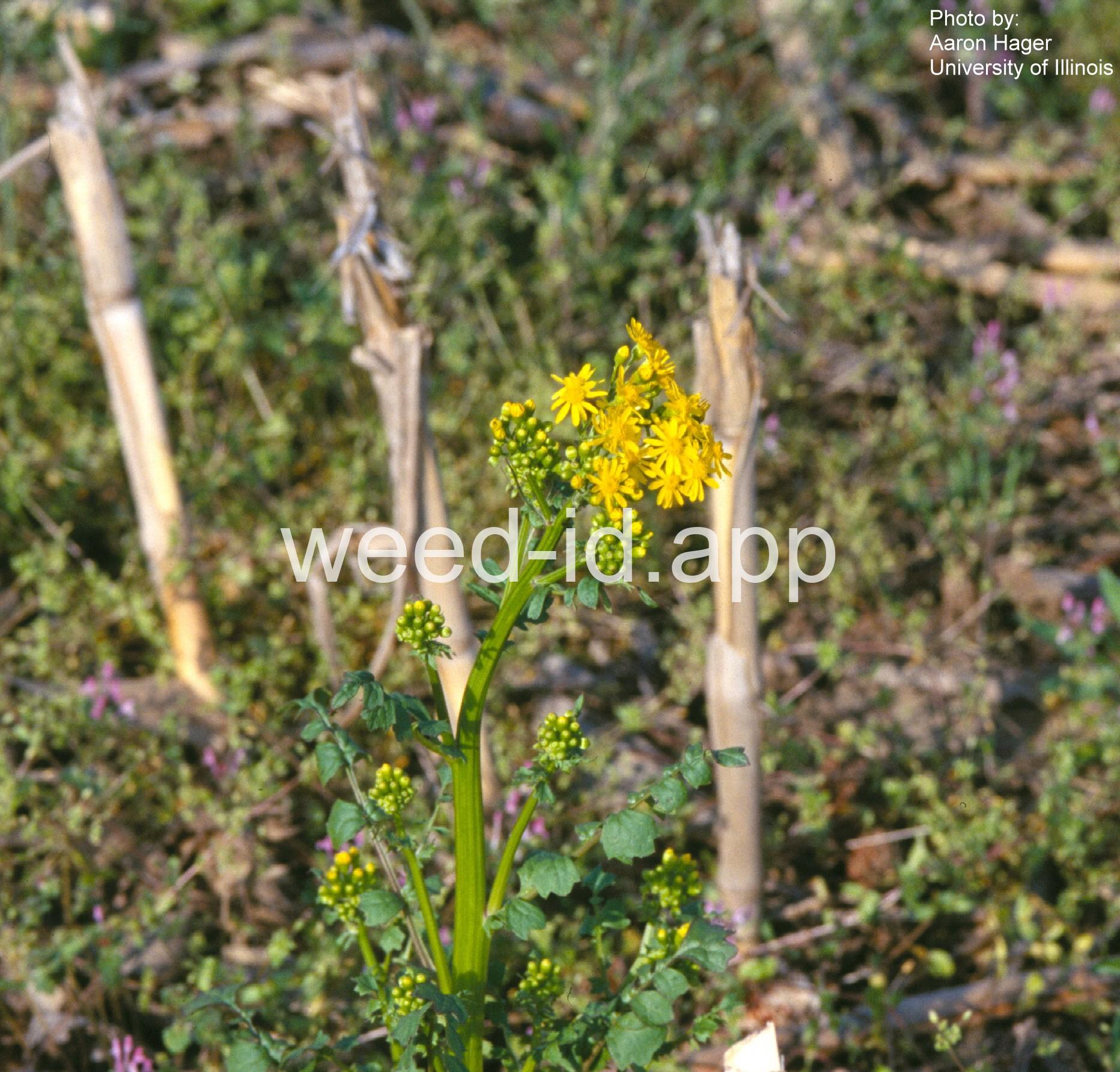 Also known as `butterweed.` This annual grows in moist sites and is described by various references as `turgid` and `succulent.` It usually has 8 or 13 ray flowers per head. The leaves resemble those of Barbarea (wintercress) hence the common name.