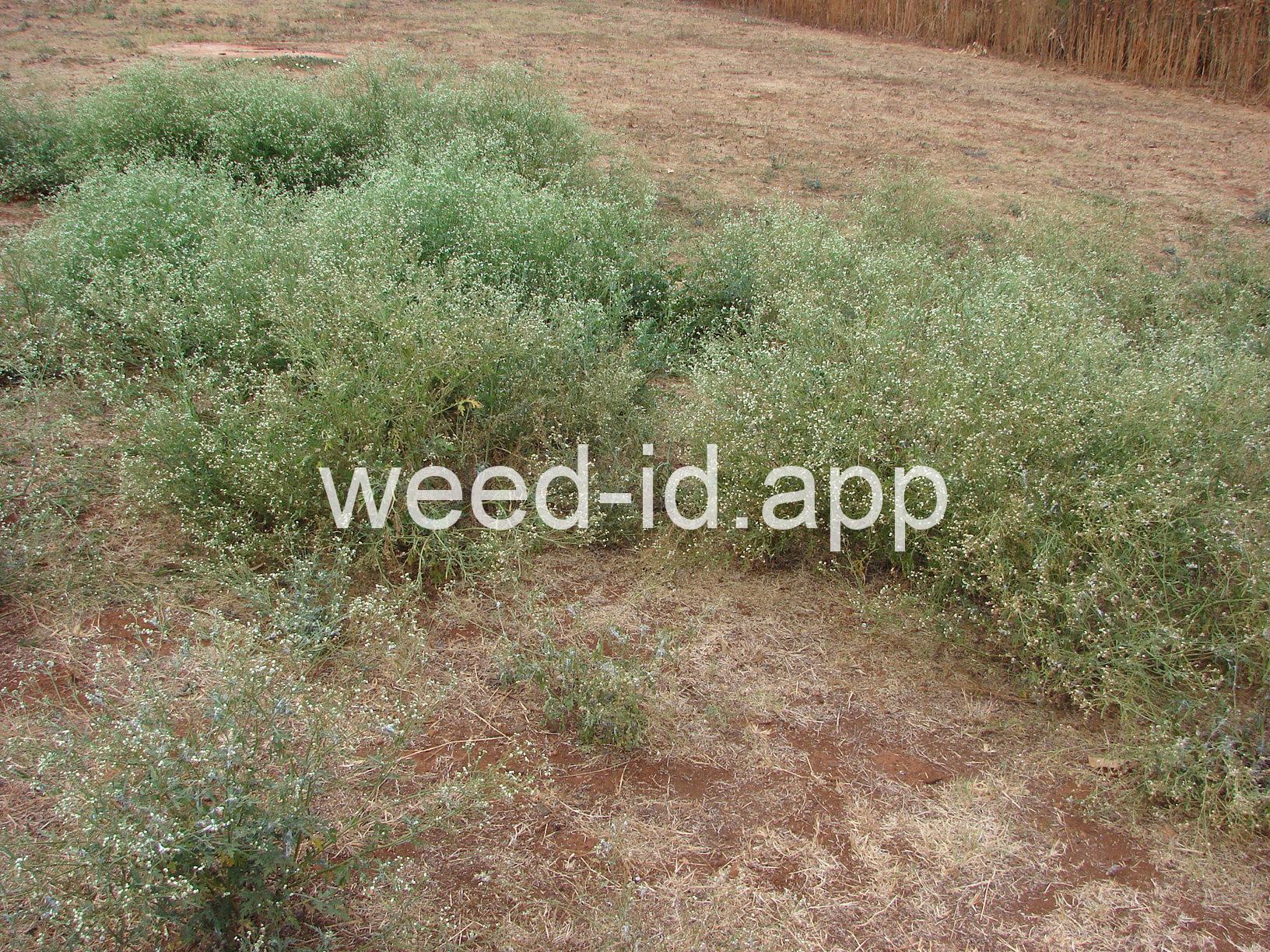 A taprooted annual with a large number of small, white flower heads, usually with 5 tiny ray flowers. This species commonly occurs in waste areas, but it is also extremely aggressive in cropland in the southeast.