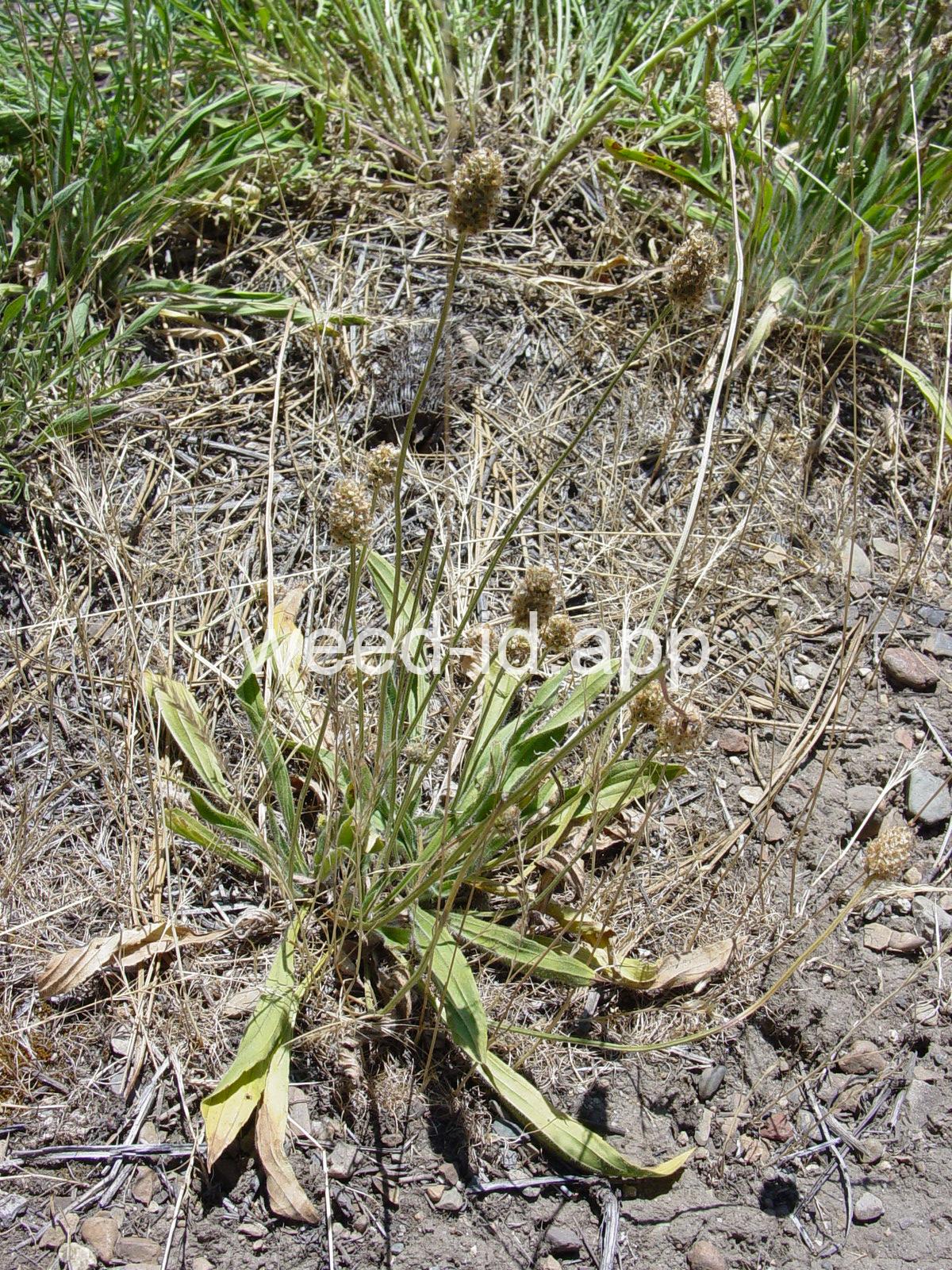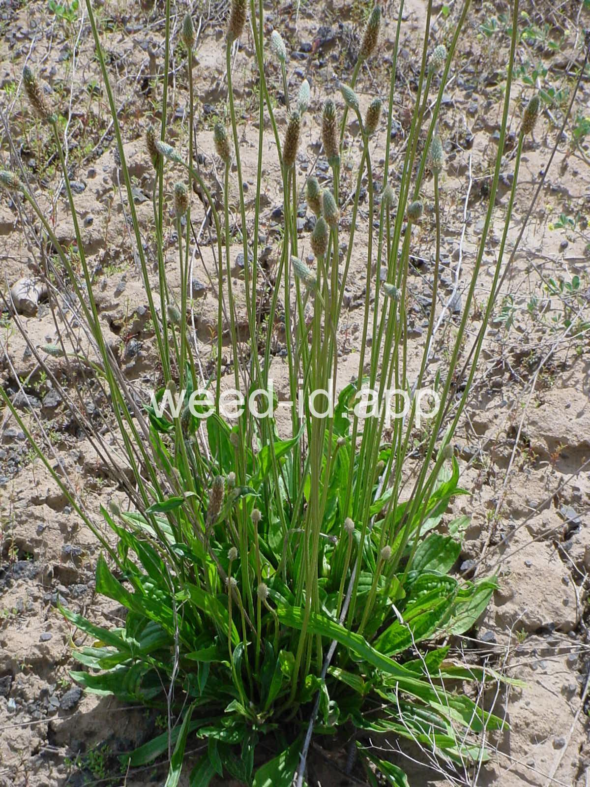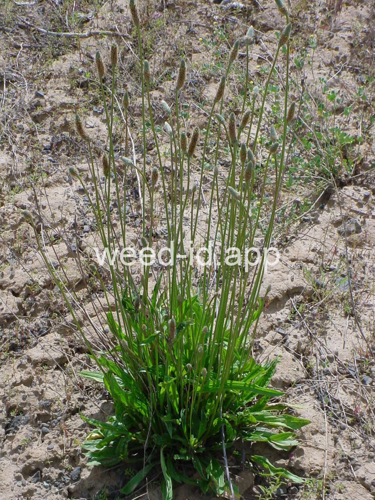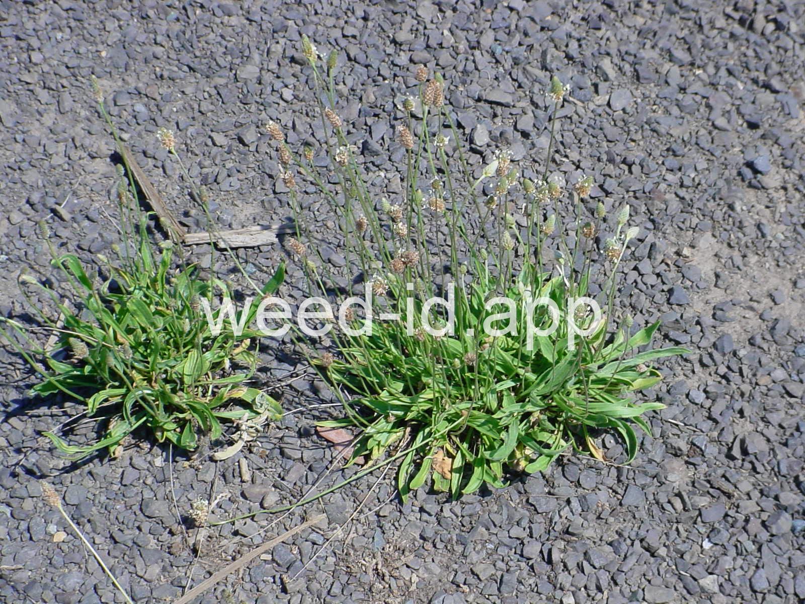 These fibrous rooted perennials have a long, leafless, flowering stem with a short spike of flowers at the tip. The main veins of the leaves are almost parallel and, as inferred by the scientific name, the leaves are lanceolate. This species is a common weed of lawns and pastures.
