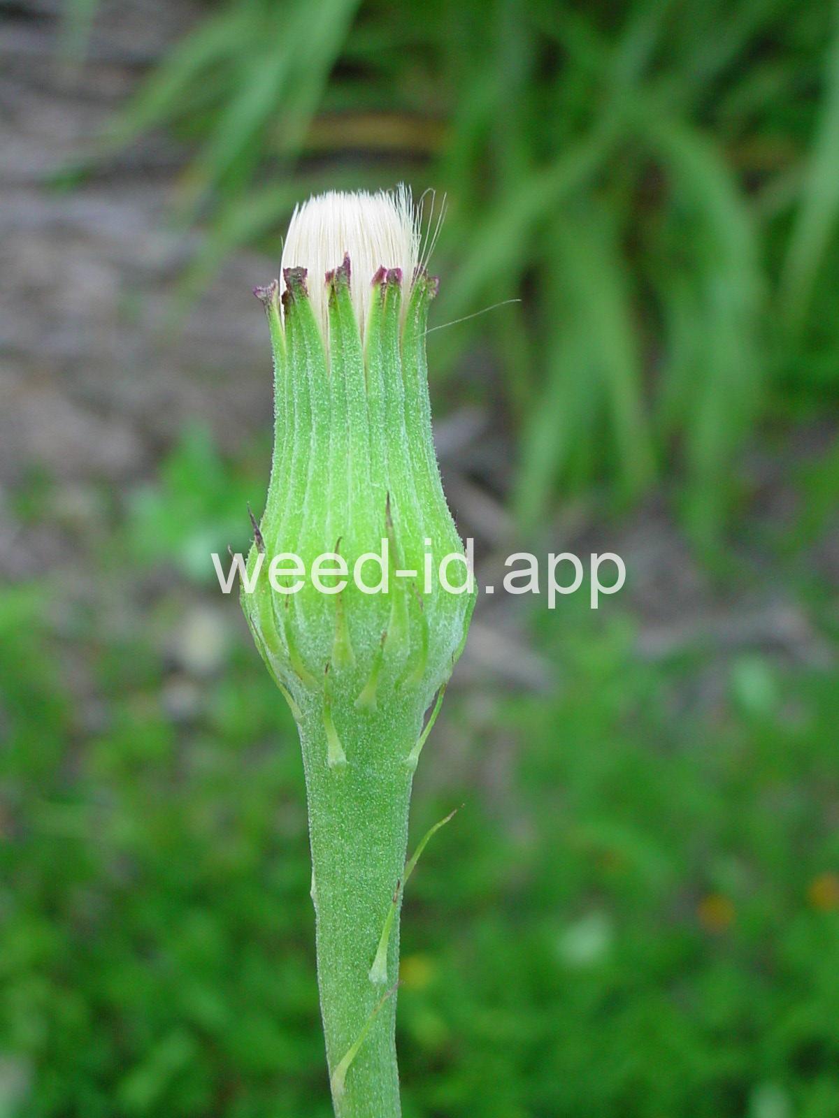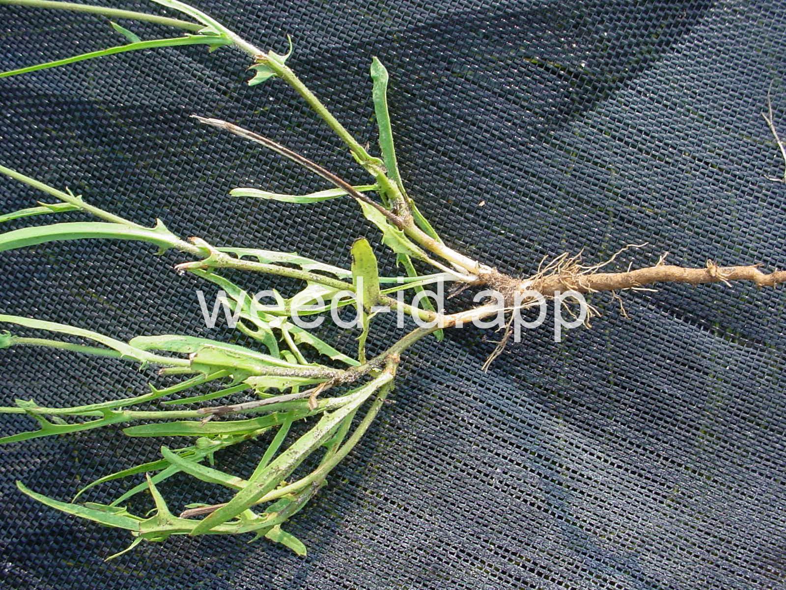 Despite the common name this species is very easy to distinguish from dandelion (Taraxacum sp.). The flowering stems are branched and bear at least a few leaves. The lobes of the basal leaves point toward the tip rather than toward the base.