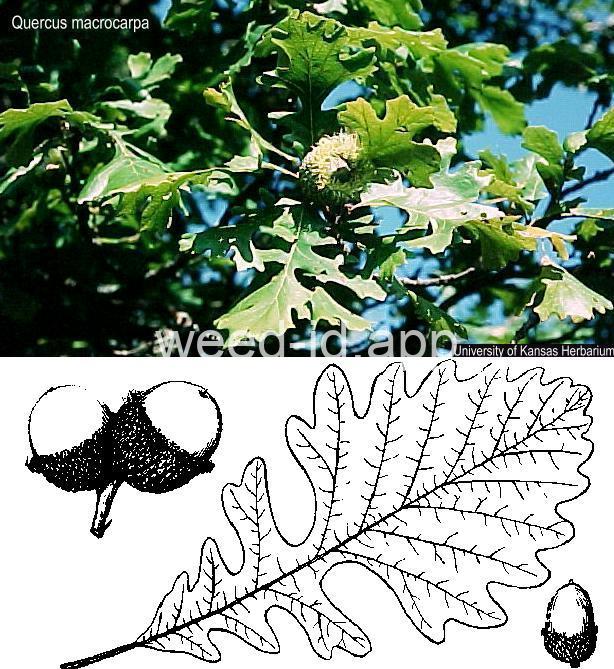 Leaves broadest near the tip, with rounded or square tipped lobes. The acorn is quite large and the cup surrounding most of it is covered with hooked bristles forming the bur referred to in the common name.