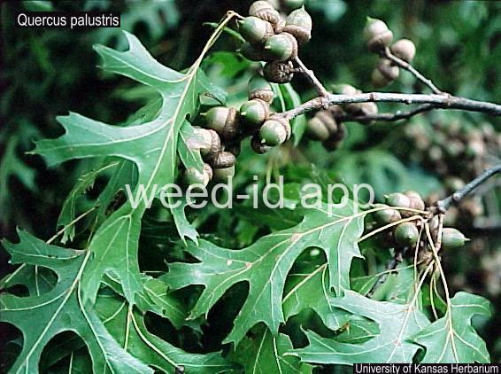 This is one of the most commonly planted of the oaks due to its beautiful fall foliage and the use of its acorns by wildlife. The acorns are much broader than long, and the leaves have pointed lobes with bristle tips.
