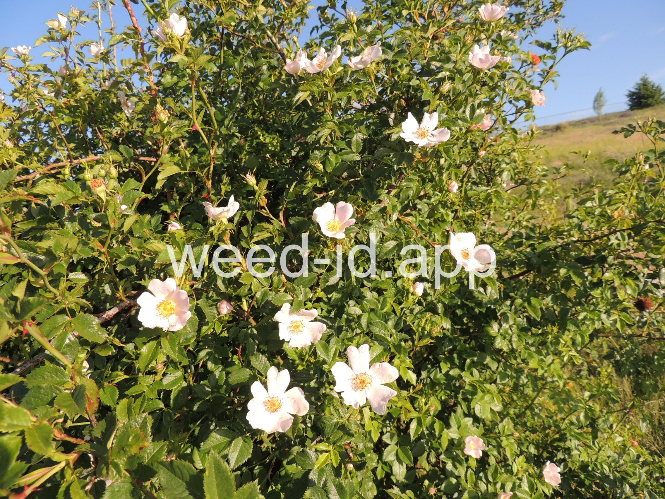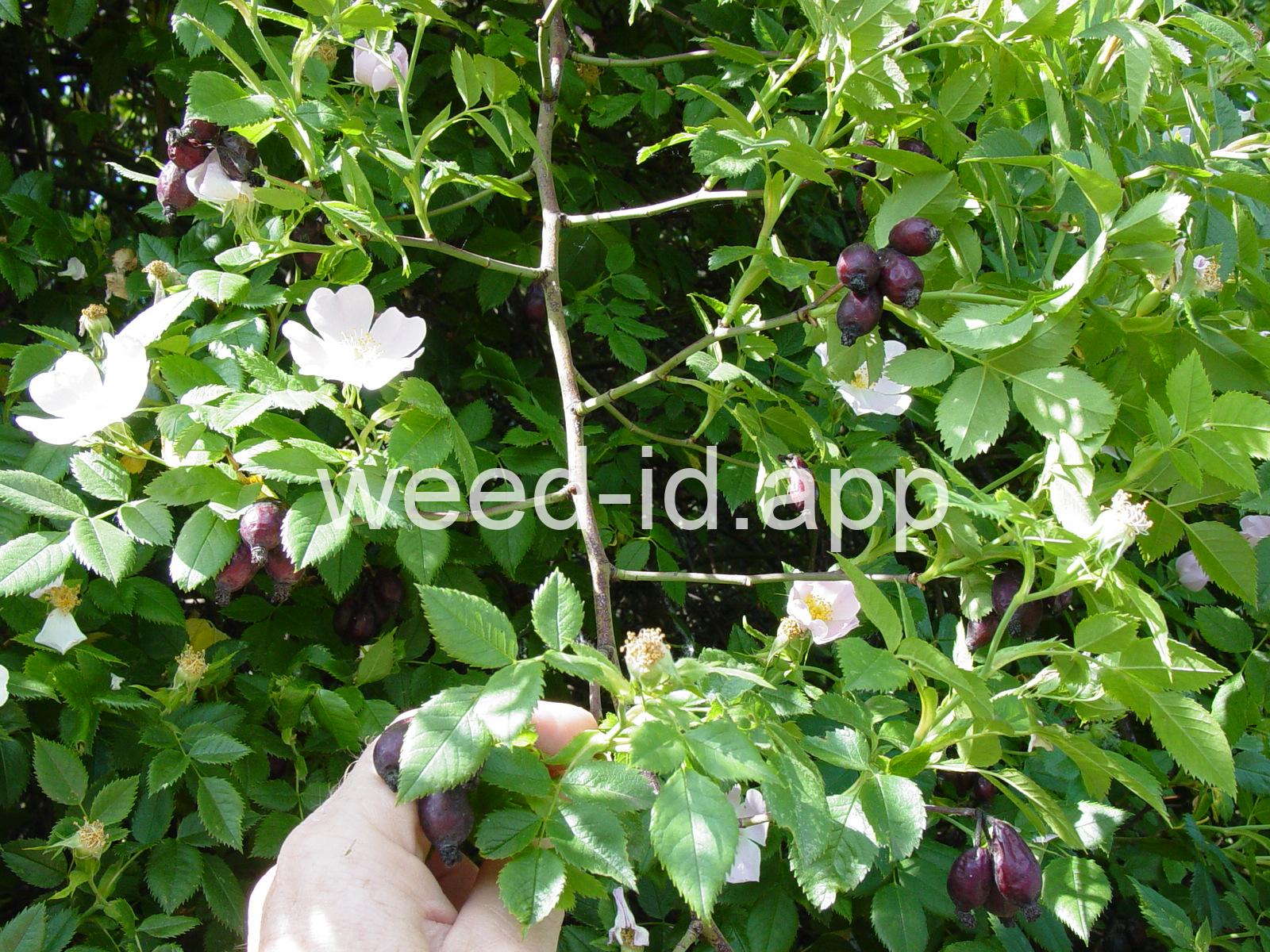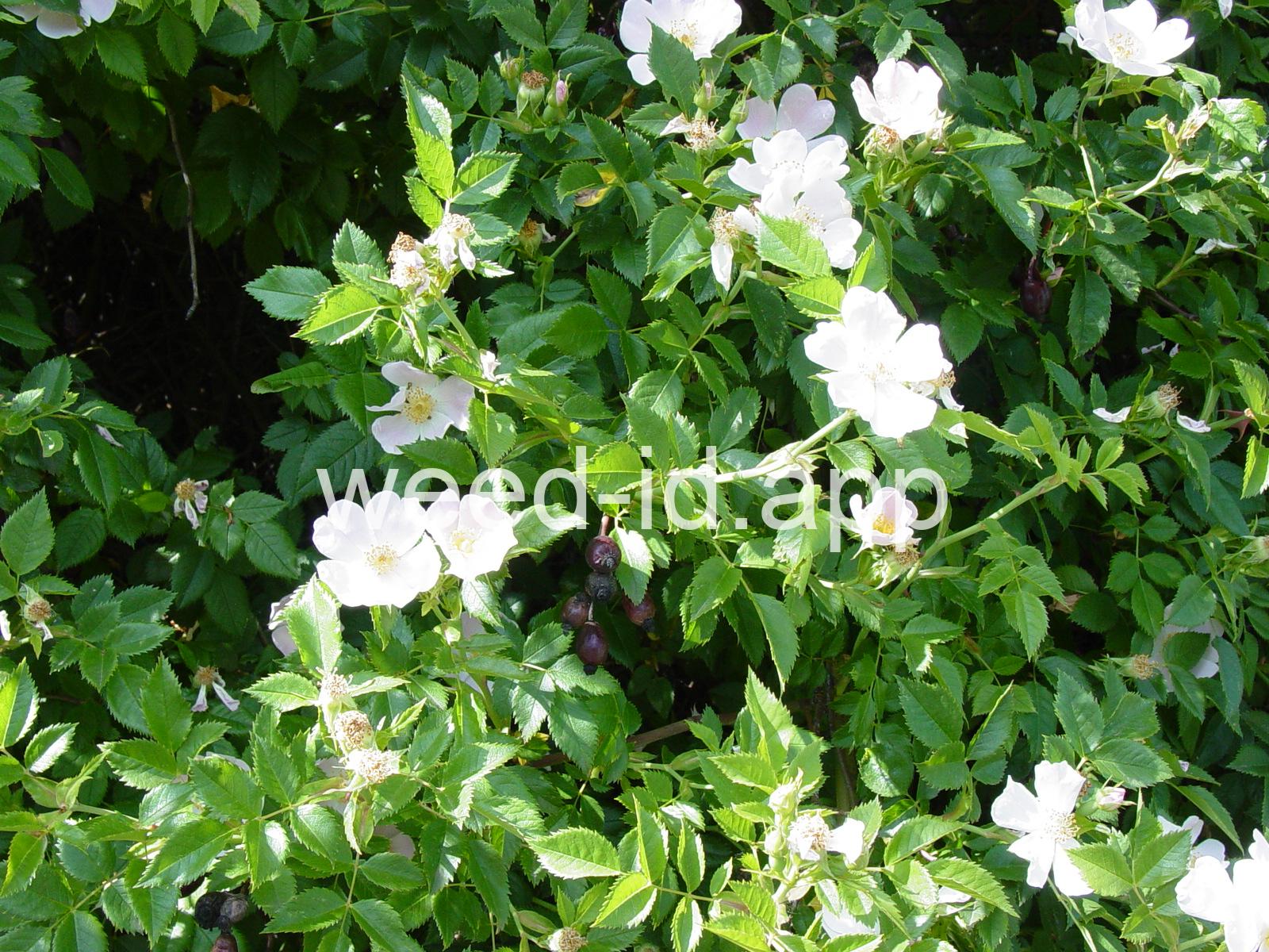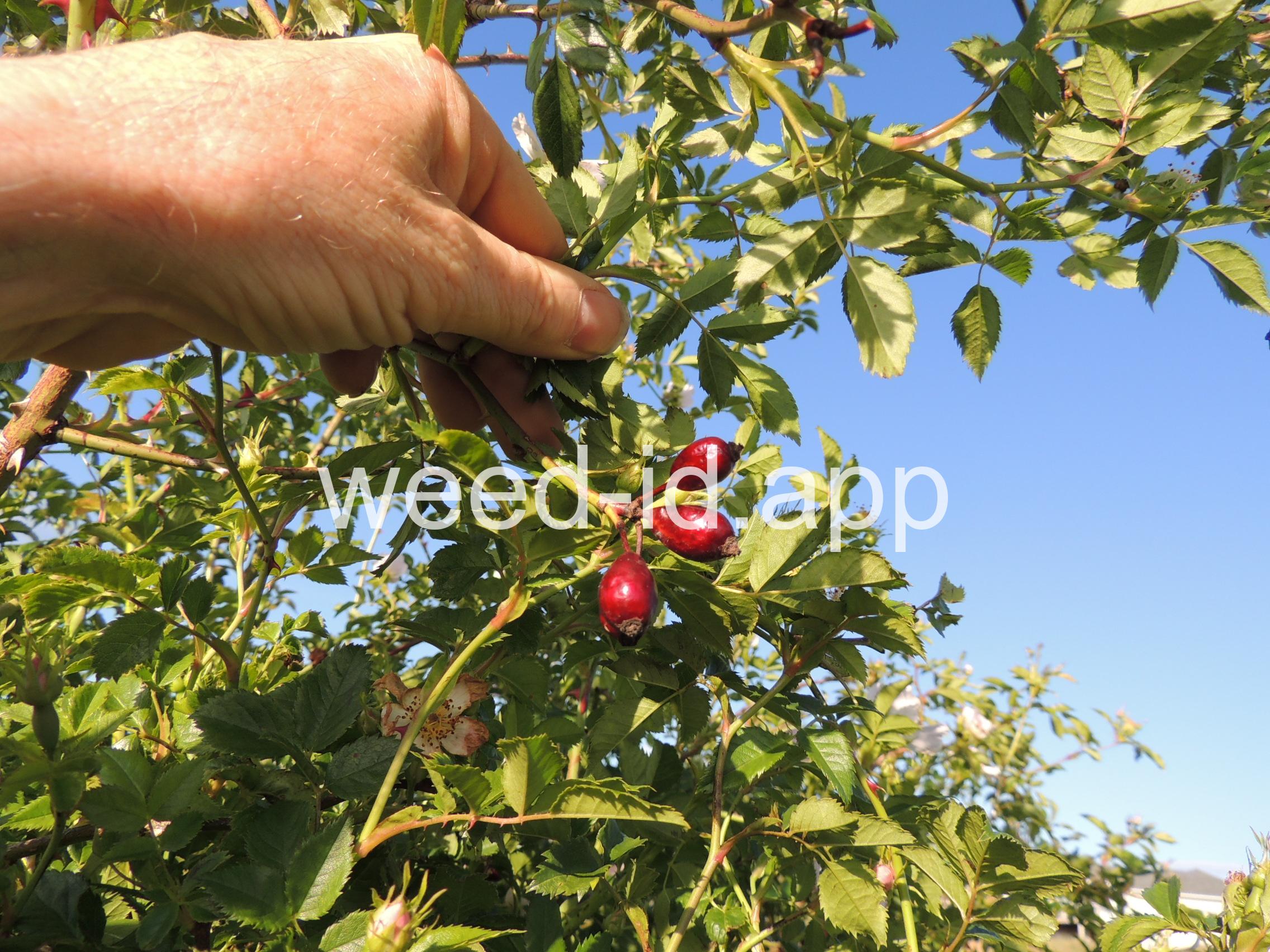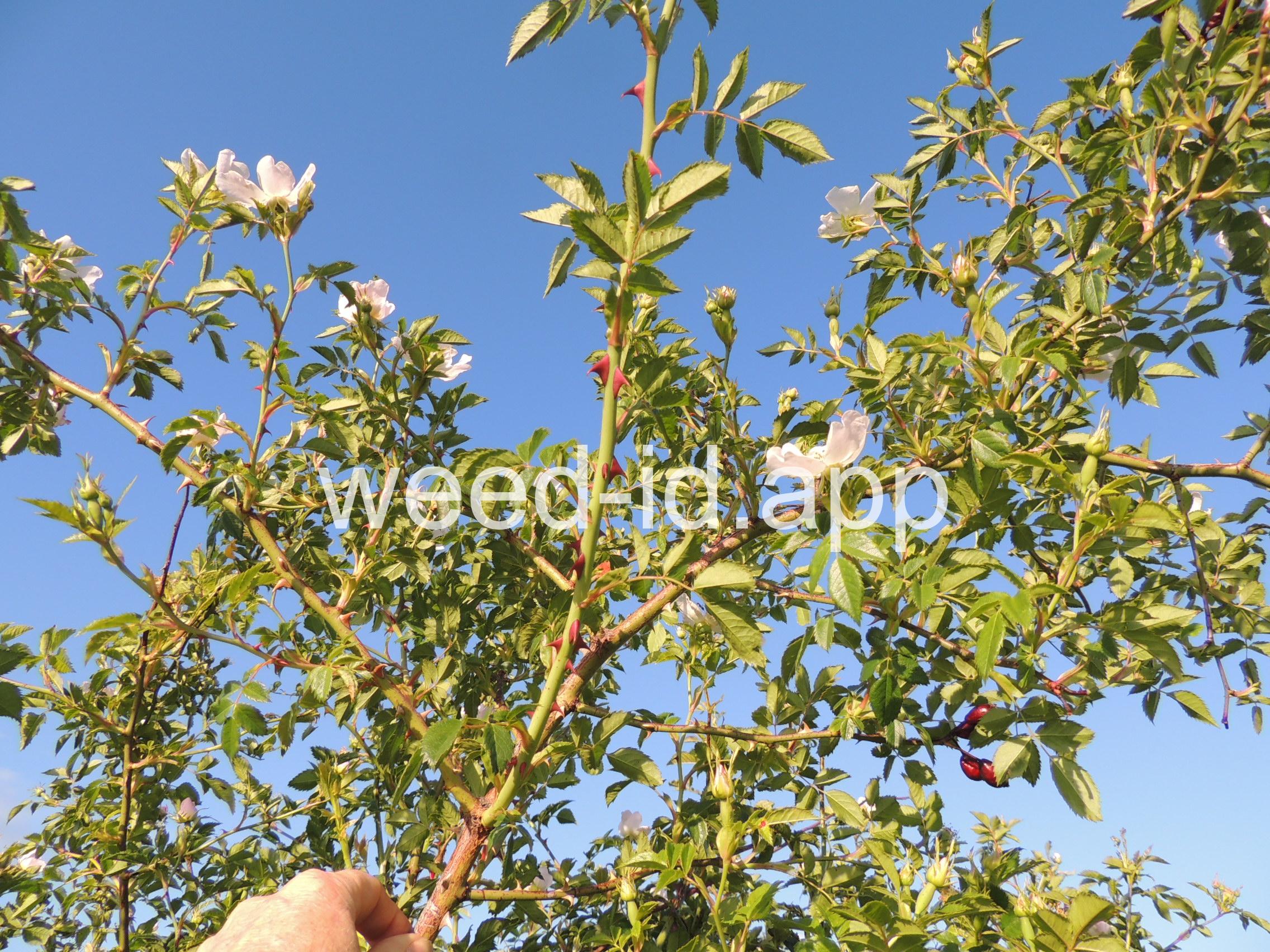 An introduced spherical shrub with recurved spines and light pink (or white) flowers. The fruits in pendulous clusters, bright red but becoming black with age. Similar to Rosa eglanteria but without the glandular hairs.