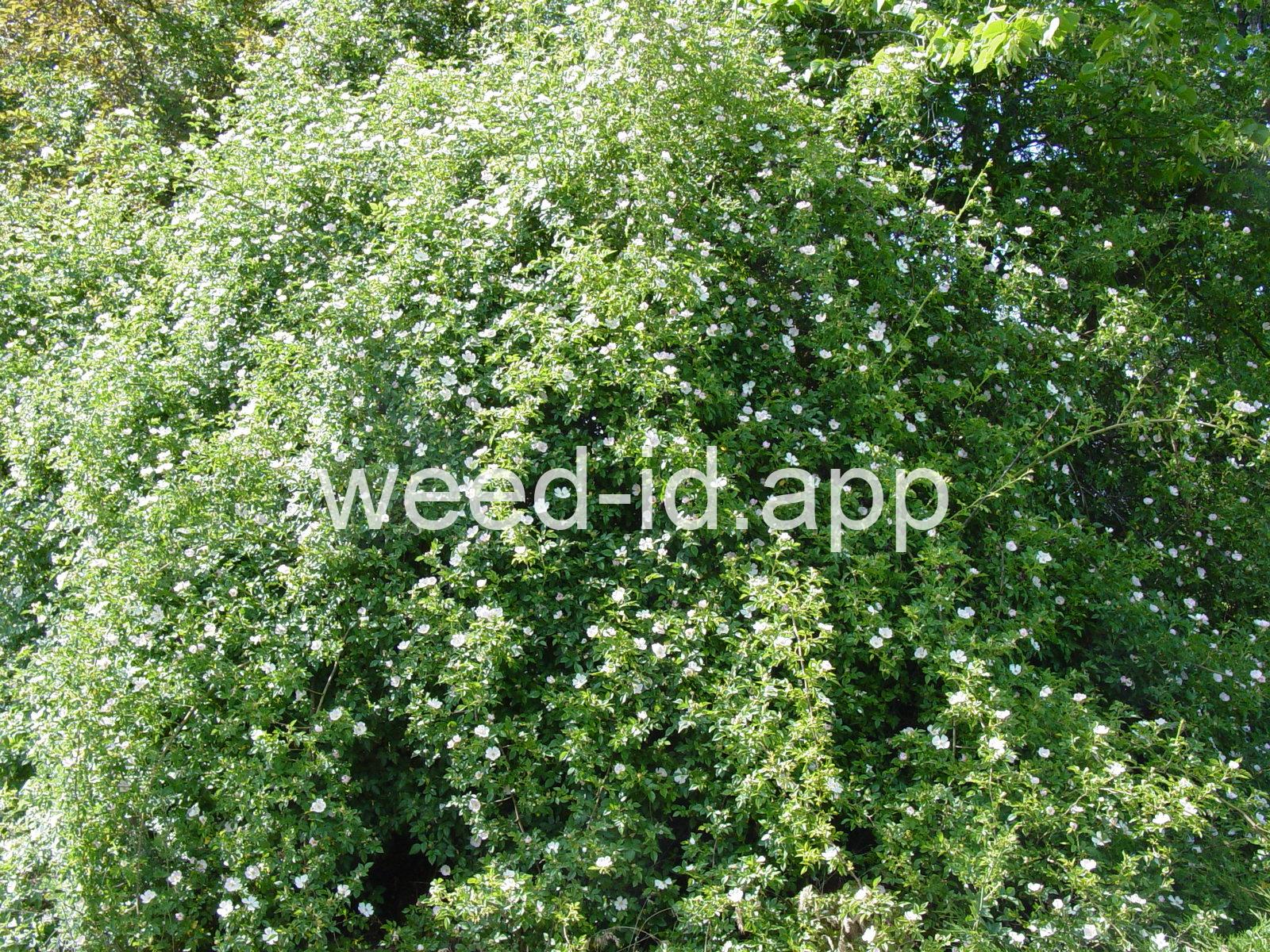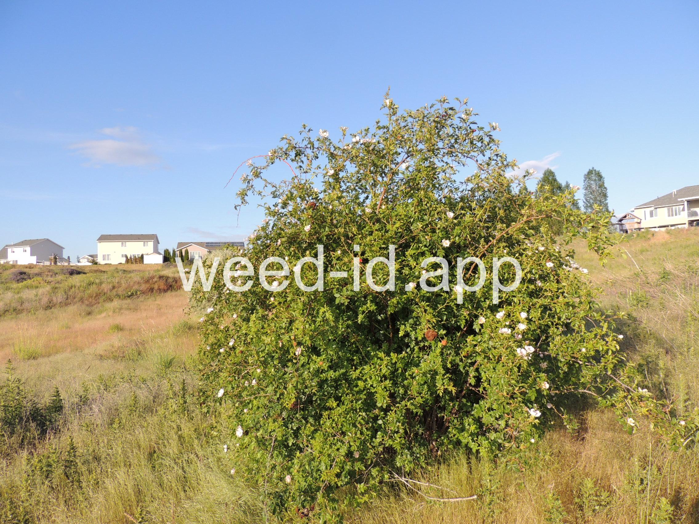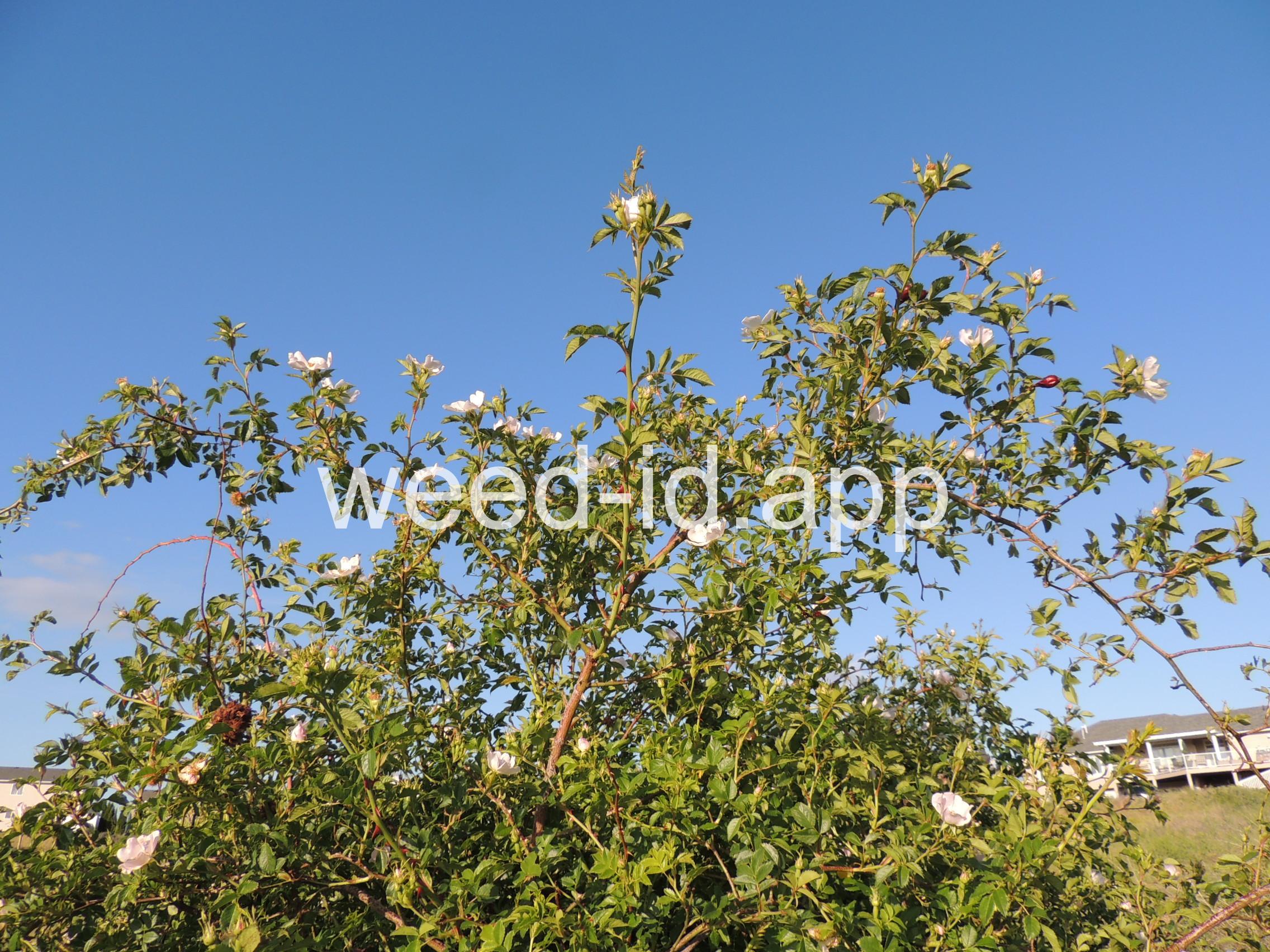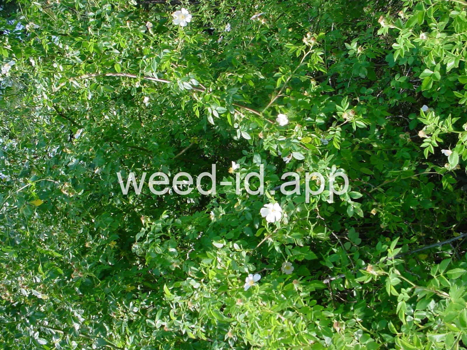 An introduced spherical shrub with recurved spines and light pink (or white) flowers. The fruits in pendulous clusters, bright red but becoming black with age. Similar to Rosa eglanteria but without the glandular hairs.