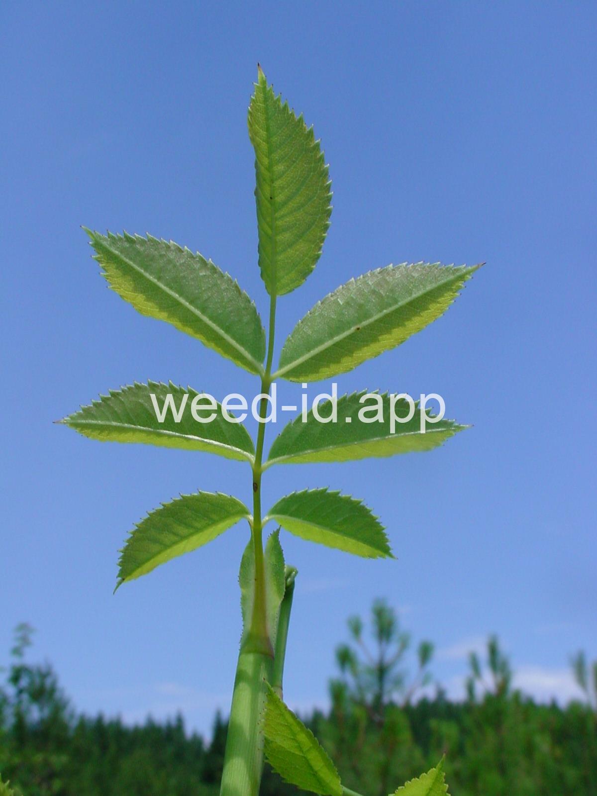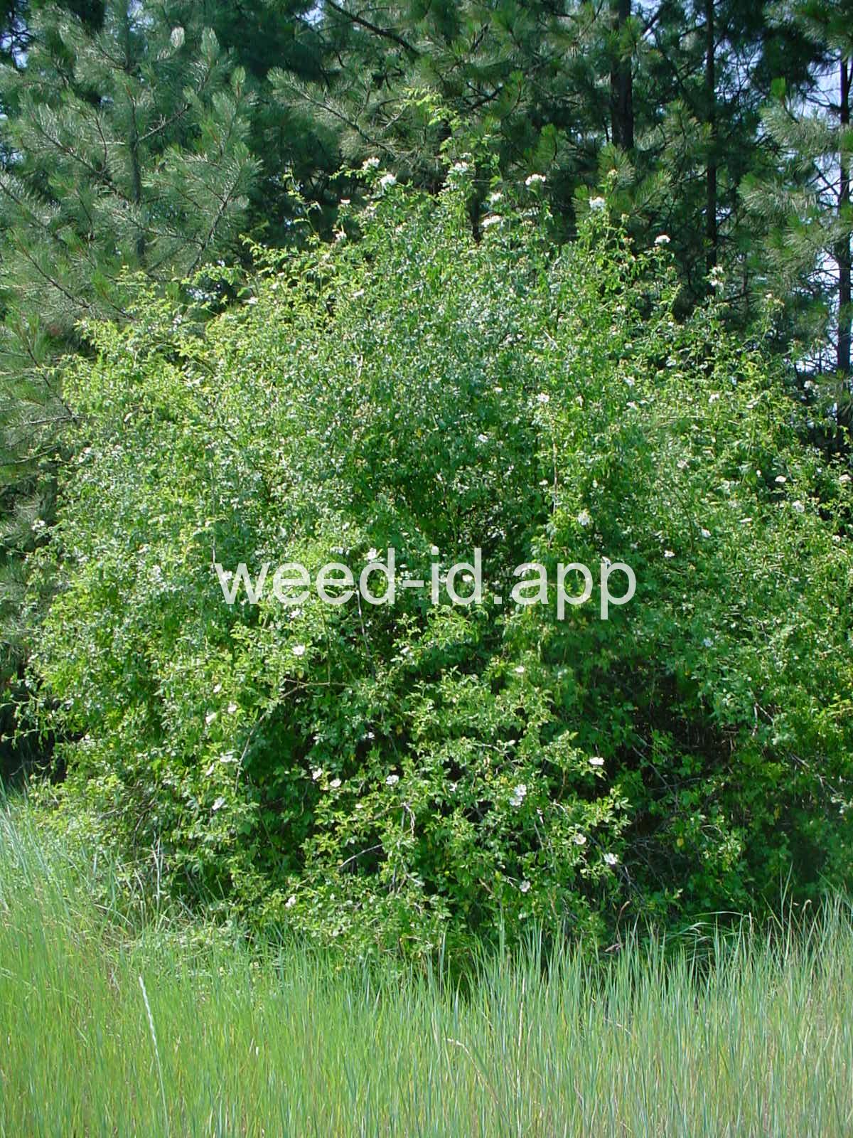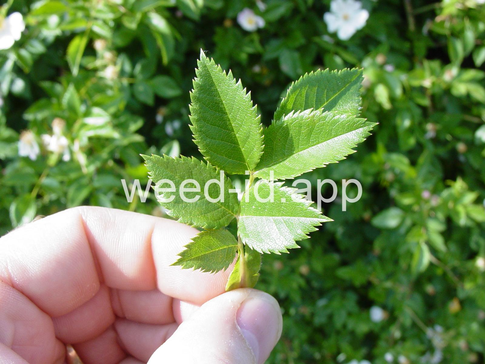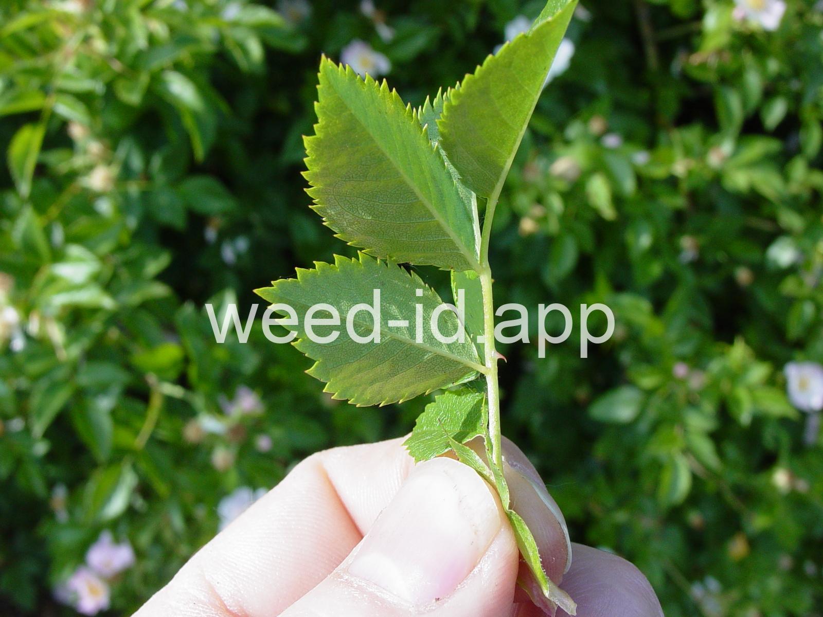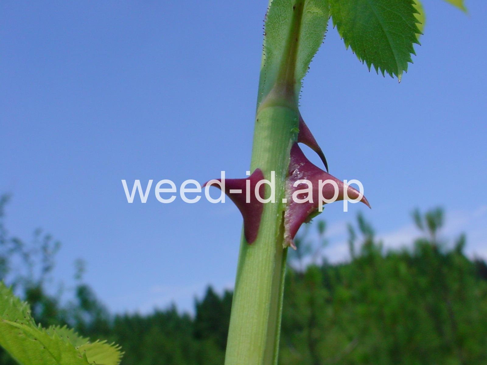 An introduced spherical shrub with recurved spines and light pink (or white) flowers. The fruits in pendulous clusters, bright red but becoming black with age. Similar to Rosa eglanteria but without the glandular hairs.