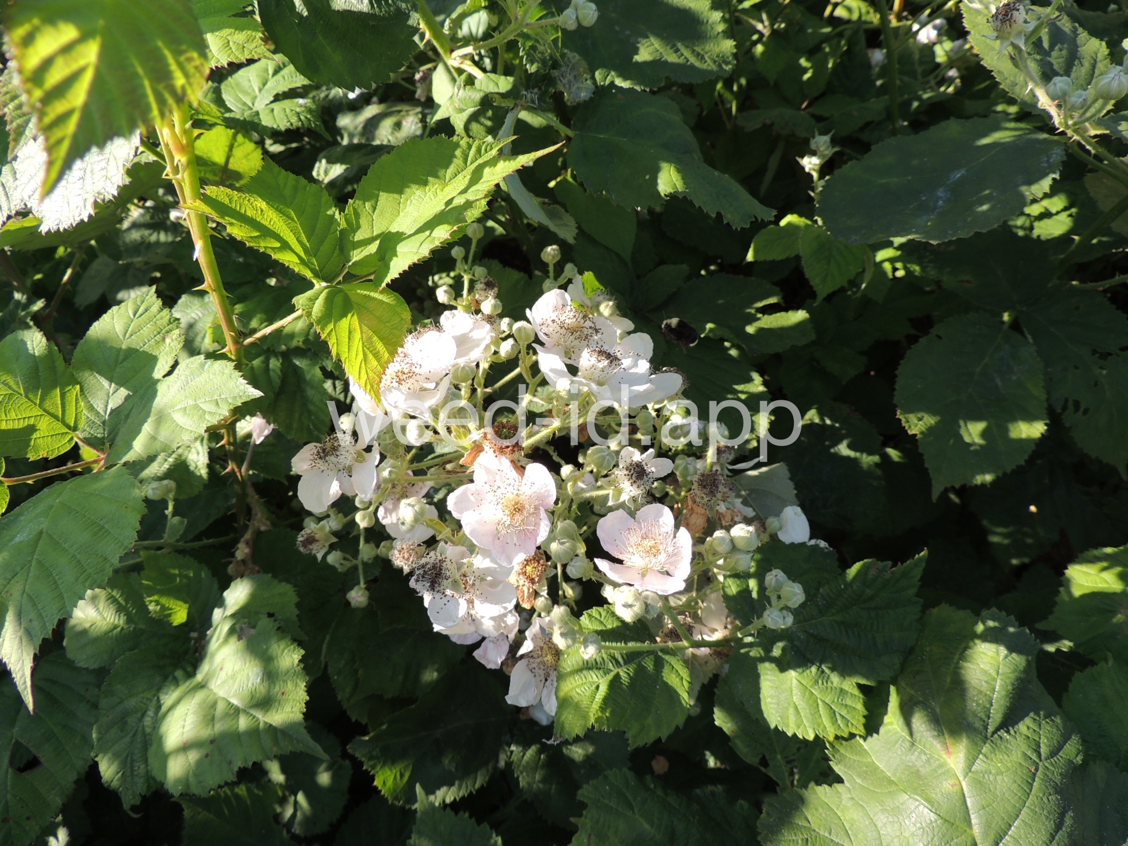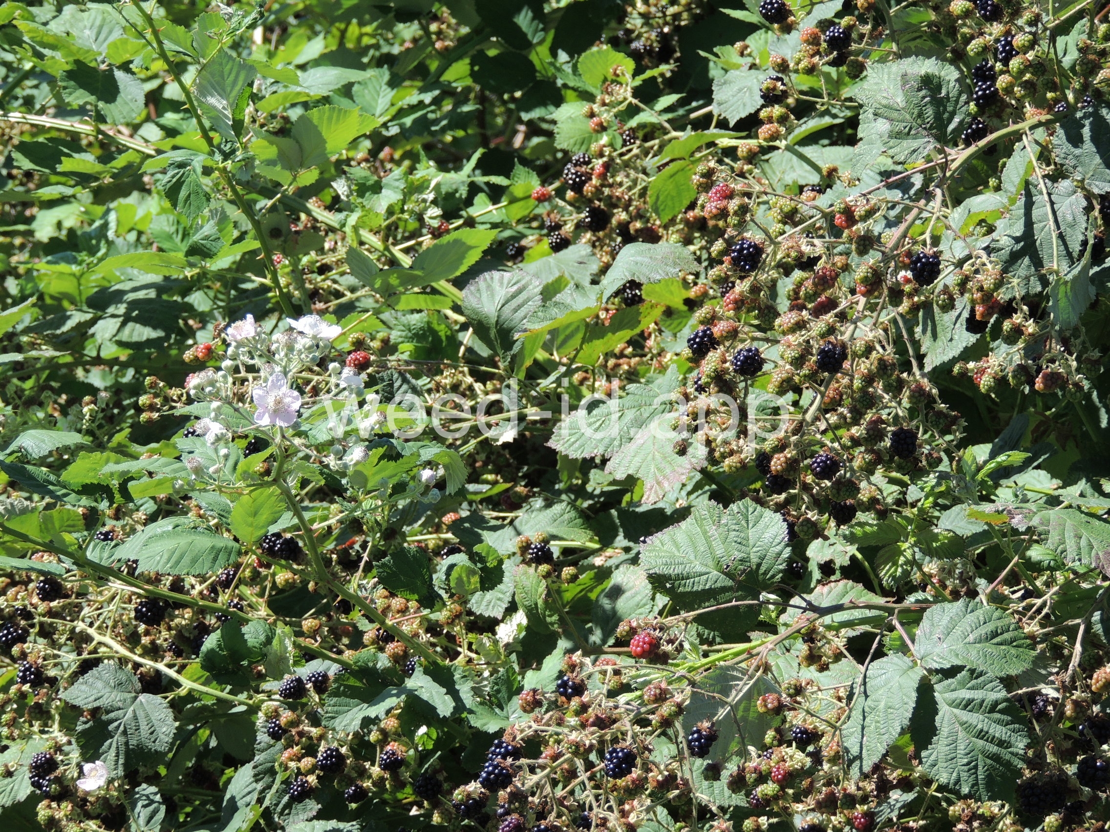 The most common of the escaped blackberries. The stems and petioles with strong, hooked or straight, thorns. The leaves with five, entire, palmately arranged leaflets.