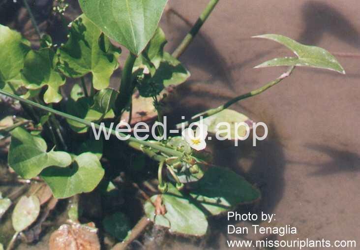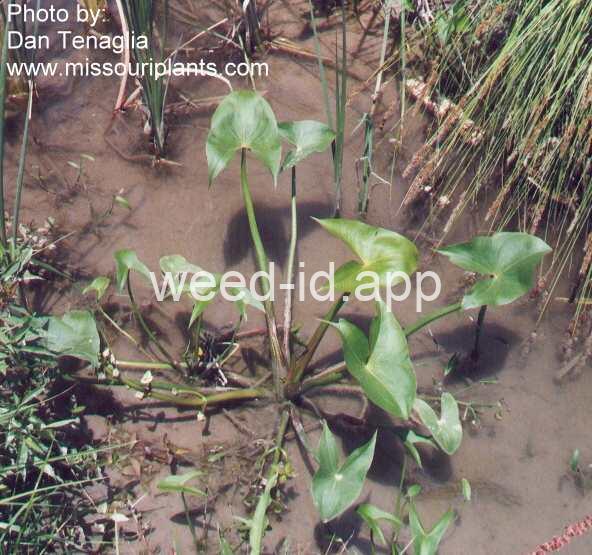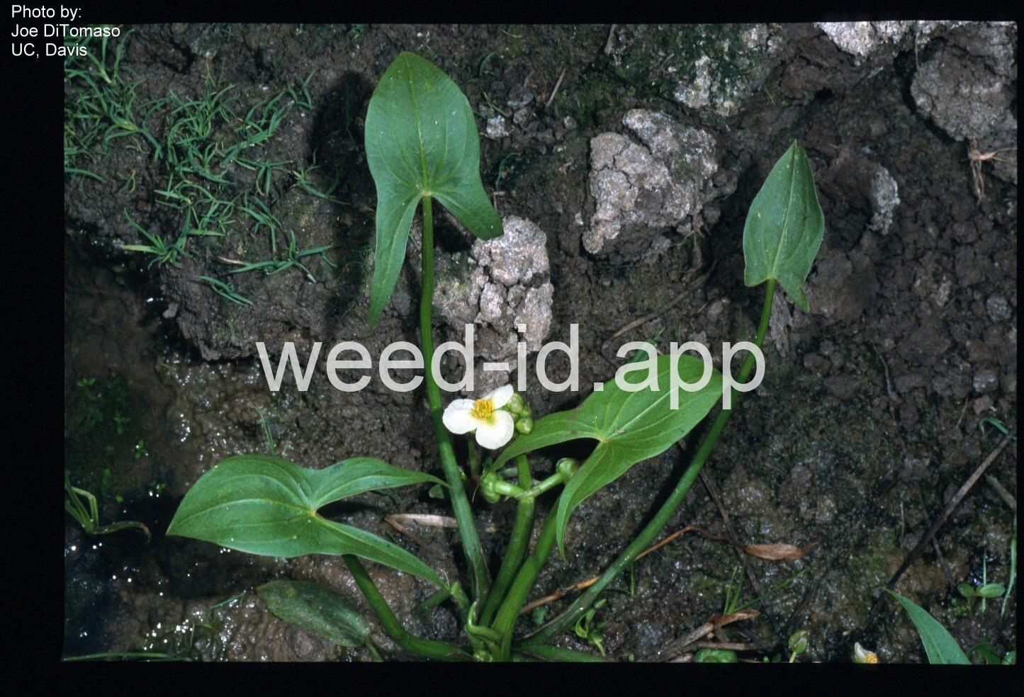 An annual, aquatic plant with arrowhead-shaped leaves and 3 white petals. It can be confused with Sagittaria longiloba which is perennial and has the basal lobes of the `arrowhead` longer than the central lobe.