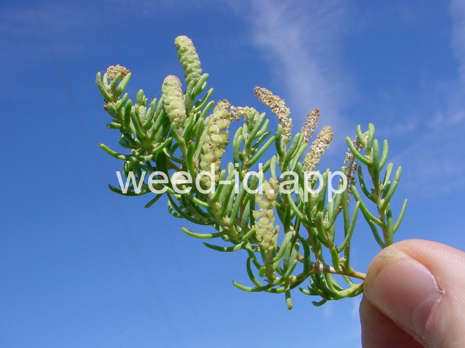 Greasewood is a native shrub of alkaline soils in the Western U.S. The hairless leaves are succulent and sausage-shaped, and the branch tips tend to be somewhat spiny.