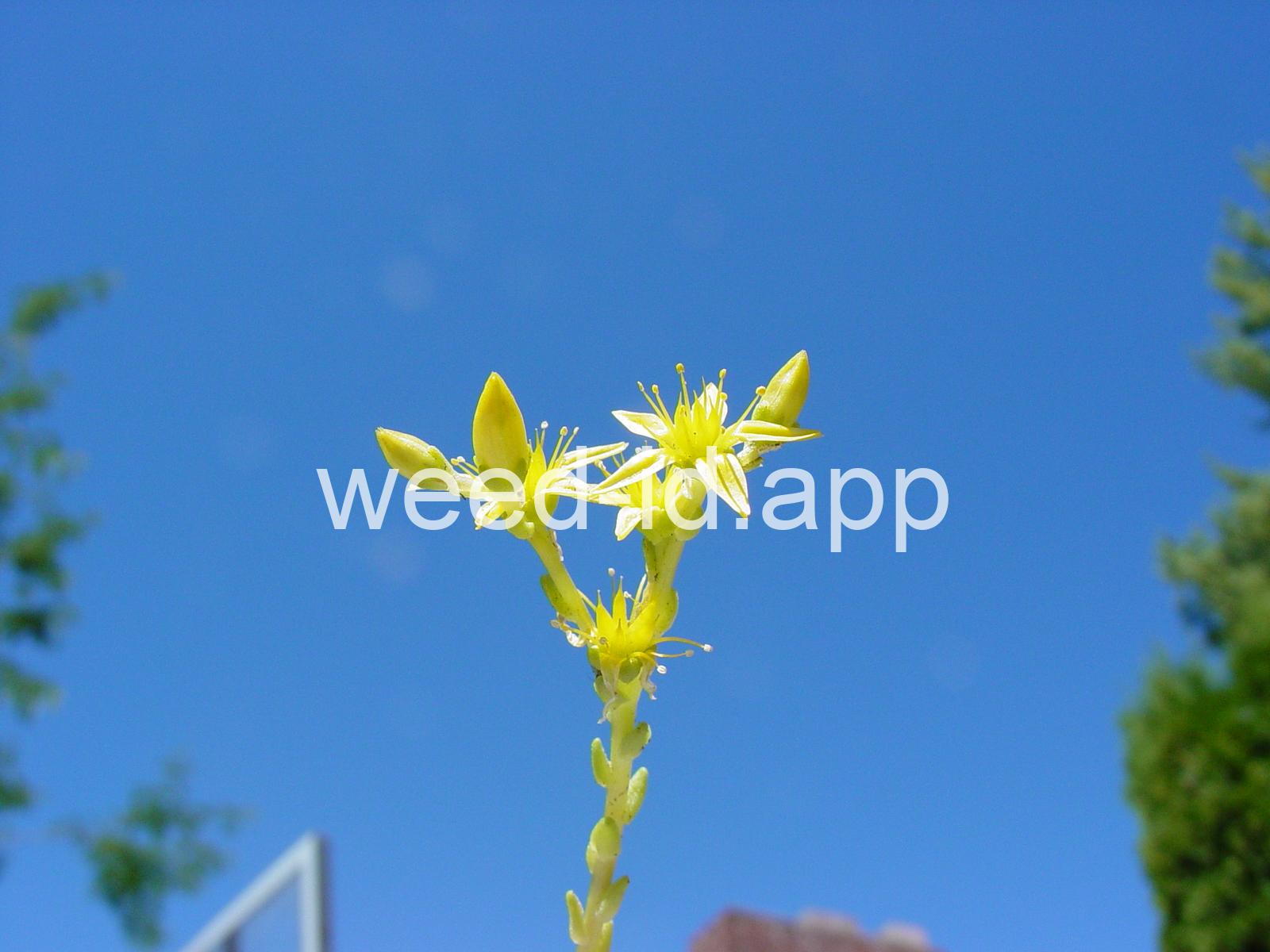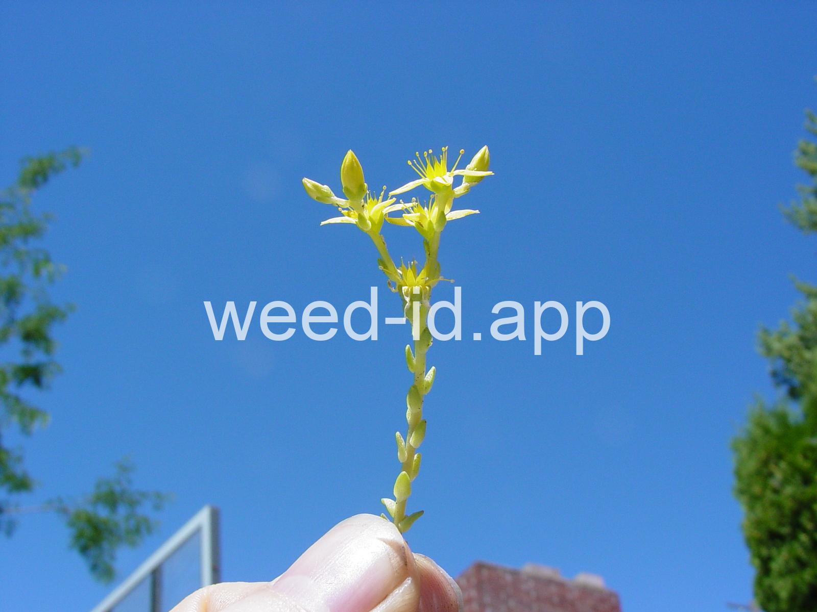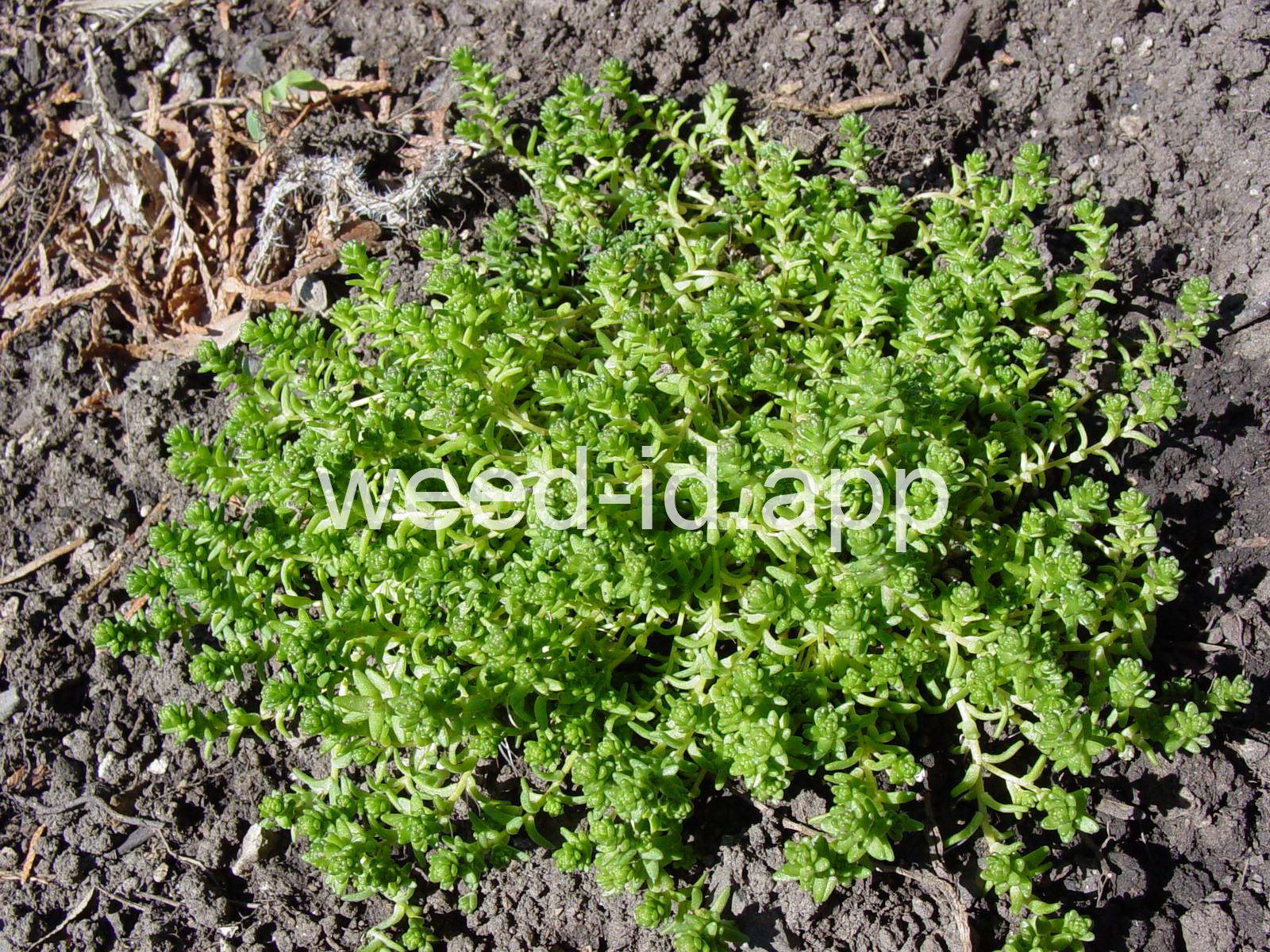 Plants up to only six inches tall, the stems densely covered with the fleshy spherical leaves. The yellow petals are pointed at the tip and the fruit consists of five separate carpels. A common horticultural species of rock gardens and xeriscapes, often persisting and escaping.